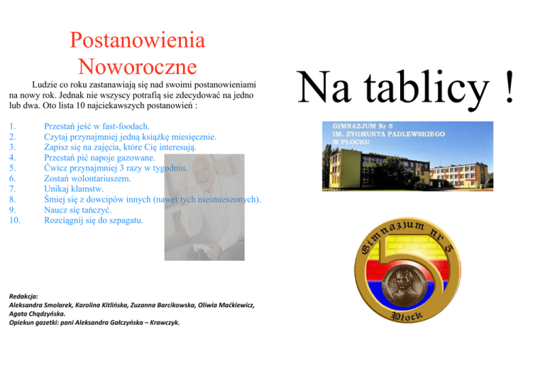 Postanowienia Noworoczne Ludzie co roku zastanawiają się nad swoimi postanowieniami na nowy rok. Jednak nie wszyscy potrafią sie zdecydować na jedno lub dwa. Oto lista 10 najciekawszych postanowień : 1. 2. 3. 4. 5. 6. 7. 8. 9. 10. Przestań jeść w fast-foodach. Czytaj przynajmniej jedną książkę miesięcznie. Zapisz się na zajęcia, które Cię interesują. Przestań pić napoje gazowane. Ćwicz przynajmniej 3 razy w tygodniu. Zostań wolontariuszem. Unikaj kłamstw. Śmiej się z dowcipów innych (nawet tych nieśmieszonych). Naucz się tańczyć. Rozciągnij się do szpagatu. Redakcja: Aleksandra Smolarek, Karolina Kitlińska, Zuzanna Barcikowska, Oliwia Maćkiewicz, Agata Chądzyńska. Opiekun gazetki: pani Aleksandra Gałczyńska – Krawczyk. Na tablicy ! Etymologia nazw miesięcy Polskie nazwy miesięcy mają pochodzenie słowiańskie lub rzymskie. o Styczeń - nazwa pochodzi od słowa "stykać", ponieważ styczeń styka poprzedni rok z nowym. o Luty - w staropolszczyźnie "lutym" określano coś złowrogiego, zimnego lub nieprzyjemnego. I faktycznie, miesiąc ten wydaje się być najbardziej mroźny i nieprzyjemny, stąd też jego nazwa. o Marzec - nazwa wzięła się od rzymskiego boga wojny Marsa. "Martius" oznacza dosłownie "miesiąc Marsa". Poza tym marzec, to miesiąc, w którym planeta Mars świeci najjaśniej w całym roku. o Kwiecień - oznacza kwitnące kwiaty. o Maj - pochodzi od imienia rzymskiej bogini Mai. o Czerwiec - etymologia tej nazwy ma związek z owadem czerwcem polskim. W czerwcu bowiem zbierano jego poczwarki po czym suszono je na słońcu, żeby potem wykorzystywać je jako czerwony barwnik. o Lipiec - nazwa pochodzi od kwitnących w tym czasie lip. o Sierpień - dawniej nazywany jako "sirzpień", ponieważ w tym okresie głównym narzędziem używanym przez ludność był sierp. o Wrzesień - nazwa pochodzi od kwitnących w tym czasie fioletowych wrzosów. o Październik - pochodzi od wyrazu "paździerze", czyli suchych łodyg lnu, których w tym miesiącu było najwięcej. o Listopad - nazwa pochodzi od spadających w tym miesiącu liści. o Grudzień - nazwa pochodzi od zamarzniętej ziemi, a ta z kolei w staropolszczyźnie nazywana była "gruda". Piątka dla Mołdawii! W naszej szkole do 16 grudnia 2015r. trwała akcja pt. „Akcja Paczka 2015”. Młodzież z całej szkoły jak i w innych miejscach w Płocku przekazywała dary dla Polaków w Mołdawii, a dokładniej w Bielcach i w Styrczy . W całym Płocku udało się przygotować ponad 200 paczek żywnościowych. Wszystkie te dary zostały przekazane m.in. przez grupę 37 harcerzy jak i uczennice naszej szkoły (klasa I) oraz naszą nauczycielkę p. Annę Dolman-Dynę. Na miejscu nasi uczniowie odwiedzili parę rodzin, wręczyły paczki i spędziły kilka przyjemnych chwil z tamtejszymi Polakami. W trakcie spotkań z młodzieżą mieli okazje podziwiać tradycyjne, mołdawskie jak i polskie tańce. Podczas wizyty w polskim kościele w Bielcach wręczyli paczki świąteczne dzieciom, a także mogli podzielić się opłatkiem i złożyć świąteczne życzenia naszym rodakom. W drodze powrotnej nasi uczniowie mieli okazję zobaczyć takie miasta jak Kiszyniów-stolicę Mołdawii, Lwów i Cmentarz Orląt Lwowskich. Dziękujemy za wsparcie! Kącik Kulinarny W związku z trwającym karnawałem chciałabym podrzucić wam jeden z najlepszych przepisów na domowe pyszności! Pulchne faworki drożdżowe: Składniki: 3 szklanki mąki 50 g drożdży 3 kostki smalcu do smażenia cukier puder sól cukier waniliowy ; 80 g rozpuszczonego masła szklanka mleka 2 jajka 2 łyżki cukru Rozczyn: Drożdże ,łyżkę cukru ,łyżkę mąki, 1/2 szklanki ciepłego mleka wymieszać i odstawić do wyrośnięcia. Jajka utrzeć z cukrem i cukrem waniliowym, dodać do zaczynu wraz z pozostałymi składnikami (resztą mąki ,masłem i szczyptą soli). Ciasto wyrabiamy 20 min, po czym odstawiłem na kolejne 20 do wyrośnięcia. Rozwałkować ciasto ,ponacinać w paski, wywinąć i smażyć na rozgrzanym smalcu do zrumienienia. Na koniec posypać cukrem pudrem. HOROSKOP Rok 2016 będzie przede wszystkim czasem ciężkiej pracy i wielkich zmian. Dotkną one każdego człowieka na Ziemi i nie będzie od tego wyjątku. Wszystko będzie działo się niezwykle dynamicznie, a procesy geopolityczne nabiorą prawdziwie zawrotnego tempa. Przywódcy największych państw będą zmuszeni rozpocząć długofalową współpracę. Muszą uświadomić sobie, że pokojowe rozwiązania służą całej ludzkości, a konflikty czynią nas bardziej podatnymi na totalne zniszczenie. o Dużo będzie się działo w sferze relacji międzyludzkich. Ludzie będą się lepiej dogadywać i jeśli powstrzymają się od zachłanności, mogą zacząć budować coś naprawdę pięknego. Dla osób pracujących w grupie zapowiada się naprawdę dobry rok. Projekty wymagające komunikacji oraz dialogu (i kompromisów) mają teraz ogromną szansę powodzenia. Istnieje, co prawda, niebezpieczeństwo, że w grupie pojawi się osoba chcąca zniszczyć współpracę – ale jej wpływ będzie znacznie osłabiony przez układ gwiazd. o Sfera miłosna będzie w tym roku rozkwitała.. Silny magnetyzm, jaki pojawi się między przeciwnymi płciami, przyniesie ze sobą wiele nowych, niezwykle trwałych związków. Więź łącząca nowe pary okaże się w następnych latach niebywale mocna. Można wręcz powiedzieć, że w 2016 roku narodzi się niejedna wielka miłość. Zygmunt Padlewski (ur. 1 stycznia 1836, zm. 15 maja 1863) – polski działacz niepodległościowy, generał powstania styczniowego. Urodził się w majątku Czerniawka Mała w powiecie berdyczowskim. Był synem Władysława - powstańca listopadowego i Judyty z Potockich. Uczył się w Korpusie Kadetów w Brześciu nad Bugiem, następnie w Petersburgu. Absolwent Akademii Artylerii w Petersburgu. Był członkiem petersburskiego tajnego Koła Oficerskiego Zygmunta Sierakowskiego. W 1861 wyjechał 