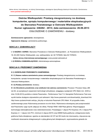 Strona 1 z 11 Adres strony internetowej, na której Zamawiający udostępnia Specyfikację Istotnych Warunków Zamówienia: www.powiat-ostrowski.pl Ostrów Wielkopolski: Przetarg nieograniczony na dostawę komputerów, sprzętu komputerowego i materiałów eksploatacyjnych do Starostwa Powiatowego w Ostrowie Wielkopolskim Numer ogłoszenia: 246262 - 2013; data zamieszczenia: 26.06.2013 OGŁOSZENIE O ZAMÓWIENIU - dostawy Zamieszczanie ogłoszenia: obowiązkowe. Ogłoszenie dotyczy: zamówienia publicznego. SEKCJA I: ZAMAWIAJĄCY I. 1) NAZWA I ADRES: Starostwo Powiatowe w Ostrowie Wielkopolskim , al. Powstańców Wielkopolskich 16, 63-400 Ostrów Wielkopolski, woj. wielkopolskie, tel. 62 7378400, faks 62 7378433. Adres strony internetowej zamawiającego: www.powiat-ostrowski.pl I. 2) RODZAJ ZAMAWIAJĄCEGO: Administracja samorządowa. SEKCJA II: PRZEDMIOT ZAMÓWIENIA II.1) OKREŚLENIE PRZEDMIOTU ZAMÓWIENIA II.1.1) Nazwa nadana zamówieniu przez zamawiającego: Przetarg nieograniczony na dostawę komputerów, sprzętu komputerowego i materiałów eksploatacyjnych do Starostwa Powiatowego w Ostrowie Wielkopolskim. II.1.2) Rodzaj zamówienia: dostawy. II.1.4) Określenie przedmiotu oraz wielkości lub zakresu zamówienia: Procesor: Procesor klasy x86 lub 64, ze sprzętowym wsparciem technologii wirtualizacji, osiągający wydajność CPU Mark min. 4235 (z dnia 10.06.2013) punktów w teście Passmarka - Performance Test 7.0. Narzędzie Performance Test oraz wyniki testów dostępne odpowiednio pod adresami: http://www.passmark.com/download/pt_download.htm http://www.cpubenchmark.net/cpu_list.php w kolumnie Passmark CPU Mark. W przypadku braku zaoferowanego przez Wykonawcę procesora na w/w liście, Wykonawca obowiązany jest przeprowadzić test Passmarka i jego wynik załączyć do oferty. Pamięć RAM: 4GB Płyta główna: Wspomagająca technologię wielowątkowości oraz wielordzeniowości. Posiadająca 1 złącze PCI Express x16, 3 złącza PCI Express x1, 1 złącze mini PCI, minimum 2 złącza SATA oraz DIMM Karta graficzna: zintegrowana karta graficzna Karta dźwiękowa: zgodna ze standardem AC 97 lub HD Audio lub równoważny, dopuszcza się możliwość stosowania zintegrowanych z płytą główną kart dźwiękowych, wyprowadzone gniazdo do http://bzp0.portal.uzp.gov.pl/index.php?ogloszenie=show&pozycja=246262&rok=20... 2013-06-26 Strona 2 z 11 podłączenia słuchawek z przodu obudowy. Dysk twardy: Serial ATA 500 GB 7200 obr./min, minimum 16 MB cache Karta sieciowa: 10/100/1000 Ethernet RJ 45. Dopuszcza się kartę zintegrowaną z płytą główną. Obudowa: obudowa typu Tower lub Small Form Factor, zapewniająca właściwe chłodzenie elementów, wyciszenie jednostki oraz wymagany w Unii Europejskiej poziom ekranowania elektromagnetycznego (CE) Zasilacz: 230V 50Hz o mocy minimum 300 W, aktywny filtr PFC, zgodnie z normą EN61000-3-2 o sprawności min. 80% Warunki pracy: pomieszczenie biurowe, 10-35 stopni C System operacyjny: Microsoft OEM Windows 8 Pro PL 32 lub 64 bit z możliwością downagrade do Windows 7 Professional lub rozwiązanie równoważne poprawnie współpracujące z Microsoft Office 2003, 2007, 2010, 2013 oraz systemem domenowym MS Windows (Windows Server 2000, 2003, 2008 i 2012) Certyfikaty i oświadczenia: Deklaracja producenta spełnienia przez sprzęt wymaganych norm CE - załączona do oferty. Mysz: optyczna USB z rolką przewijania Klawiatura: USB, standard US-QWERTY (polski programisty ), pełnowymiarowa 104 klawisze Bezpłatne wparcie techniczne: Dostępne na witrynie producenta sprzętu sterowniki, uaktualnienia oraz informacje techniczne dotyczące oferowanego typu komputera (podać link do strony). Sterowniki: Płyta CD/DVD zawierające komplet sterowników i niezbędne oprogramowanie do wszelkich zainstalowanych urządzeń dla systemów operacyjnych. Gwarancja: Gwarancja 12 miesięcy. Możliwość rozbudowy sprzętu przez pracowników Zamawiającego bez utraty praw do gwarancji na pozostałe elementy jednostki. Czas dostawy od podpisania umowy: 14 dni. Urządzenie wielofunkcyjne (druk, skan, kopiowanie) szt. 6 Technologia atramentowa Podajnik papieru minimum 100 arkuszy Odbiornik papieru 50 arkuszy Formaty papieru: minimum A4 / A5 Gramatura papieru: dolna wartość graniczna nie więcej niż 64 g/m2 górna wartość graniczna nie mniej niż 220 g/m2 Interfejsy: standardowy: USB 2.0 bezprzewodowy: 802.11b lub nowszy Zainstalowana pamięć (RAM): 32 MB Rozdzielczość druku: 1200x6000 lub wyższa Prędkość kopiowania 33 str./min mono lub większa 27 str./min kolor lub większa Rozdzielczość kopiowania (Skan): 1,200 x 1,200 dpi lub większa Zmniejszanie/Powiększanie kopii: 25% 400% co 1% (dopuszczalny większy przedział) Kopiowanie wielokrotne Możliwość kopiowania kilku stron na jednej stronie (2 na 1 str., 4 na 1 str.) Optyczna Rozdzielczość skanowania: minimum 1200 x 2,400 dpi Możliwość skanowania do pliku Kompatybilność z TWAIN Skala szarości: minimum 256 poziomów Waga: nie więcej niż 7 kg Wymiary nie większe niż (długość x szerokość x wysokość): 400 x 400 x 200 mm Gwarancja: minimum 24 miesiące. Materiały eksploatacyjne: Do każdej zamówionej drukarki 4 zestawy tuszy pochodzących od producenta drukarki. Czas dostawy od podpisania umowy: 14 dni. Zadanie 2: Tablet szt.1 - finansowana przez biuro rady Bateria: minimum 6600 mAh Czytnik kart: Tak Micro SD Czytnik USB: TAK Dyktafon: TAK Ekran: minimum 10,1 cala Format zdjęć: JPG/JPEG/BMP/GIF/TIFF/PNG Formaty audio: MP3/WMA/FLAC/APE/WAV/OGG/AAC/EAC3/AC3 Formaty video: AVI/3GP/MP4/DIVX/MOV/FLV/TP/TS G-Sensor/Akcelerometr: Tak Gniazdo słuchawek: Tak HDMI: Tak Łączność bezprzewodowa WI-FI, Bluetooth lub poprzez zewnętrzny modem 3G Pamięć RAM minimum 1 GB DDR3 Pamięć: minimum 8 GB / Czytnik kart micro SD do 32 GB Procesor: minimum 1,4 GHz oparty o technologię wielordzeniowości, minimum 2 rdzenie Gwarancja: minimum 2 lata Instrukcja: Tak, w języku http://bzp0.portal.u