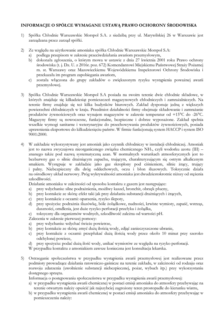 INFORMACJE O SPÓŁCE WYMAGANE USTAWĄ PRAWO OCHORONY ŚRODOWISKA 1) Spółka Chłodnie Warszawskie Morspol S.A. z siedzibą przy ul. Marywilskiej 26 w Warszawie jest zarządzana przez zarząd spółki. 2) Ze względu na użytkowanie amoniaku spółka Chłodnie Warszawskie Morspol S.A: a) podlega przepisom w zakresie przeciwdziałania awariom przemysłowym, b) dokonała zgłoszenia, o którym mowa w ustawie z dnia 27 kwietnia 2001 roku Prawo ochrony środowiska (t. j. Dz. U. z 2016r. poz. 672) Komendantowi Miejskiemu Państwowej Straży Pożarnej m. st. Warszawy oraz Mazowieckiemu Wojewódzkiemu Inspektorowi Ochrony Środowiska i przekazała im program zapobiegania awariom, c) została włączona do grupy zakładów o zwiększonym ryzyku wystąpienia poważnej awarii przemysłowej. 3) Spółka Chłodnie Warszawskie Morspol S.A posiada na swoim terenie dwie chłodnie składowe, w których znajduje się kilkadziesiąt pomieszczeń magazynowych chłodniczych i zamrażalniczych. Na terenie firmy znajduje się też kilka budynków biurowych. Zakład dysponuje jedną z większych powierzchni chłodniczych w kraju. Przedmiot działalności firmy obejmuje składowanie i zamrażanie produktów żywnościowych oraz wynajem magazynów w zakresie temperatur od +15°C do -26°C. Magazyny firmy są nowoczesne, funkcjonalne, bezpieczne i dobrze wyposażone. Zakład spełnia wszelkie wymogi sanitarne i weterynaryjne do przechowywania produktów żywnościowych, posiada uprawnienia eksportowe do kilkudziesięciu państw. W firmie funkcjonują system HACCP i system ISO 9001:2000. 4) W zakładzie wykorzystywany jest amoniak jako czynnik chłodniczy w instalacji chłodniczej. Amoniak jest to nazwa zwyczajowa nieorganicznego związku chemicznego NH3, czyli wodorku azotu (III) – znanego także pod nazwą systematyczną azan. W normalnych warunkach atmosferycznych jest to bezbarwny gaz o silnie drażniącym zapachu, trującym, charakteryzującym się ostrym alkalicznym smakiem. Występuje w zakładzie jako gaz skroplony pod ciśnieniem, silnie żrący, trujący i palny. Niebezpieczny dla dróg oddechowych, oczu i błon śluzowych. Toksycznie działa na ośrodkowy układ nerwowy. Próg wykrywalności amoniaku jest dwudziestokrotnie niższy od stężenia szkodliwości. Działanie amoniaku w zależności od sposobu kontaktu z gazem jest następujące: a) przy wdychaniu: silne podrażnienia, możliwy kaszel, bronchit, obrzęk płucny, b) przy kontakcie ze skórą: efekt taki jak przy działaniu substancji drażniących i żrących, c) przy kontakcie z oczami: oparzenia, ryzyko ślepoty, d) przy spożyciu: podrażnia śluzówkę, bóle żołądkowe, nudności, krwiste wymioty, zapaść, wstrząs, duszności, omdlenia, jest duże ryzyko perforacji przełyku i żołądka, e) toksyczny dla organizmów wodnych, szkodliwość zależna od wartości pH. Zalecenia w zakresie pierwszej pomocy: a) przy wdychaniu: wdychać świeże powietrze, b) przy kontakcie ze skórą: zmyć dużą ilością wody, zdjąć zanieczyszczone ubranie, c) przy kontakcie z oczami: przepłukać dużą ilością wody przez około 10 minut przy szeroko odchylonej powiece, d) przy spożyciu: podać dużą ilość wody, unikać wymiotów ze względu na ryzyko perforacji. W przypadku kontaktu z amoniakiem zawsze konieczna jest konsultacja lekarska. 5) Ostrzeganie społeczeństwa w przypadku wystąpienia awarii przemysłowej jest realizowane przez podmioty prowadzące działania ratowniczo-gaśnicze na terenie zakładu, w zależności od rodzaju oraz rozwoju zdarzenia (uwolnienie substancji niebezpiecznej, pożar, wybuch itp.) przy wykorzystaniu dostępnego sprzętu. Informacja o postępowaniu społeczeństwa w przypadku wystąpienia awarii przemysłowej: a) w przypadku wystąpienia awarii chemicznej w postaci emisji amoniaku do atmosfery przebywając na terenie otwartym należy opuścić jak najszybciej zagrożony teren prostopadle do kierunku wiatru, b) w przypadku wystąpienia awarii chemicznej w postaci emisji amoniaku do atmosfery przebywając w pomieszczeniu należy: pozamykać i uszczelnić drzwi, okna, otwory wentylacyjne za pomocą mokrych ręczników lub prześcieradeł, wyłączyć urządzenia wentylacyjne i klimatyzacyjne, włączyć radio, telewizor na pasmo stacji lokalnej i stosować się ściśle do przekazywanych poleceń i instrukcji, nie palić papierosów, wygasić źródła ognia, nie przebywać w pobliżu okien, nie wyglądać przez okna, czekać na odwołanie alarmu o zagrożeniu, stosować się do poleceń wydawanych przez podmioty prowadzące działania ratownicze i ewakuację. c) w przypadku wystąpienia pożaru: należy opuścić strefę znajdującą się na kierunku rozprzestrzeniania się chmury produktów spalania (gazów pożarowych), ze względu na toksyczność produktów spalania oraz możliwość wybuchu nie zbliżać się do miejsca pożaru, zachować bezpieczną odległość od pożaru, stosować się do wyżej wymienionych zaleceń, dotyczących postępowania w przypadku emisji gazu.