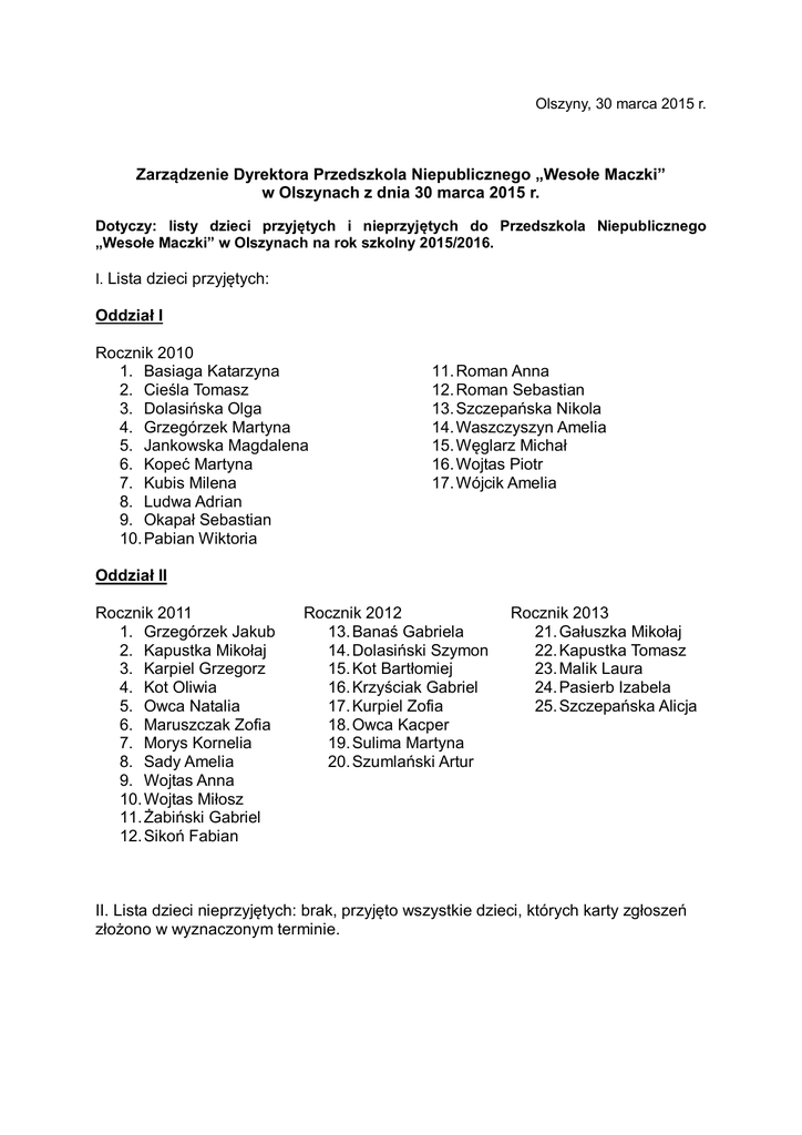 Olszyny, 30 marca 2015 r. Zarządzenie Dyrektora Przedszkola Niepublicznego „Wesołe Maczki” w Olszynach z dnia 30 marca 2015 r. Dotyczy: listy dzieci przyjętych i nieprzyjętych do Przedszkola Niepublicznego „Wesołe Maczki” w Olszynach na rok szkolny 2015/2016. I. Lista dzieci przyjętych: Oddział I Rocznik 2010 1. Basiaga Katarzyna 2. Cieśla Tomasz 3. Dolasińska Olga 4. Grzegórzek Martyna 5. Jankowska Magdalena 6. Kopeć Martyna 7. Kubis Milena 8. Ludwa Adrian 9. Okapał Sebastian 10. Pabian Wiktoria 11. Roman Anna 12. Roman Sebastian 13. Szczepańska Nikola 14. Waszczyszyn Amelia 15. Węglarz Michał 16. Wojtas Piotr 17. Wójcik Amelia Oddział II Rocznik 2011 1. Grzegórzek Jakub 2. Kapustka Mikołaj 3. Karpiel Grzegorz 4. Kot Oliwia 5. Owca Natalia 6. Maruszczak Zofia 7. Morys Kornelia 8. Sady Amelia 9. Wojtas Anna 10. Wojtas Miłosz 11. Żabiński Gabriel 12. Sikoń Fabian Rocznik 2012 13. Banaś Gabriela 14. Dolasiński Szymon 15. Kot Bartłomiej 16. Krzyściak Gabriel 17. Kurpiel Zofia 18. Owca Kacper 19. Sulima Martyna 20. Szumlański Artur Rocznik 2013 21. Gałuszka Mikołaj 22. Kapustka Tomasz 23. Malik Laura 24. Pasierb Izabela 25. Szczepańska Alicja II. Lista dzieci nieprzyjętych: brak, przyjęto wszystkie dzieci, których karty zgłoszeń złożono w wyznaczonym terminie.