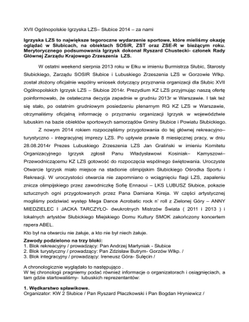 XVII Ogólnopolskie Igrzyska LZS– Słubice 2014 – za nami Igrzyska LZS to największe tegoroczne wydarzenie sportowe, które mieliśmy okazję oglądać w Słubicach, na obiektach SOSiR, ZST oraz ZSE-R w bieżącym roku. Merytorycznego podsumowania Igrzysk dokonał Ryszard Chustecki- członek Rady Głównej Zarządu Krajowego Zrzeszenia LZS. W ostatni weekend sierpnia 2013 roku w Ełku w imieniu Burmistrza Słubic, Starosty Słubickiego, Zarządu SOSIR Słubice i Lubuskiego Zrzeszenia LZS w Gorzowie Wlkp. został złożony oficjalnie wspólny wniosek dotyczący przyznania organizacji dla Słubic XVII Ogólnopolskich Igrzysk LZS – Słubice 2014r. Prezydium KZ LZS przyjmując naszą ofertę poinformowało, że ostateczna decyzja zapadnie w grudniu 2013r w Warszawie. I tak też się stało, po ostatnim grudniowym posiedzeniu plenarnym RG KZ LZS w Warszawie, otrzymaliśmy oficjalną informację o przyznaniu organizacji Igrzysk w województwie lubuskim na bazie obiektów sportowych samorządów Gminy Słubice i Powiatu Słubickiego. Z nowym 2014 rokiem rozpoczęliśmy przygotowania do tej głównej rekreacyjno– turystyczno - integracyjnej imprezy LZS. Po upływie prawie 8 miesięcznej pracy, w dniu 28.08.2014r Prezes Lubuskiego Zrzeszenia LZS Jan Graliński w imieniu Komitetu Organizacyjnego Igrzysk zgłosił Panu Władysławowi Kosiniak– Kamyszowi– Przewodniczącemu KZ LZS gotowość do rozpoczęcia wspólnego świętowania. Uroczyste Otwarcie Igrzysk miało miejsce na stadionie olimpijskim Słubickiego Ośrodka Sportu i Rekreacji. W uroczystości otwarcia nie zapomniano o wciągnięciu flagi LZS, zapaleniu znicza olimpijskiego przez zawodniczkę Sofię Ennaoui – LKS LUBUSZ Słubice, pokazie sztucznych ogni przygotowanych przez Pana Damiana Kireja. W części artystycznej mogliśmy podziwiać występ Mega Dance Acrobatic rock n’ roll z Zielonej Góry – ANNY MIEDZIELEC I JACKA TARCZYŁO- dwukrotnych Mistrzów Świata ( 2011 i 2013 ) i lokalnych artystów Słubickiego Miejskiego Domu Kultury SMOK zakończony koncertem rapera ABEL. Kto był na otwarciu nie żałuje, a kto nie był niech żałuje. Zawody podzielono na trzy bloki: 1. Blok rekreacyjny / prowadzący: Pan Andrzej Martyniak - Słubice 2. Blok turystyczny / prowadzący: Pan Zdzisław Butrym- Gorzów Wlkp. / 3. Blok integracyjny / prowadzący: Ireneusz Góra- Sulęcin / A chronologicznie wyglądało to następująco . W tej chronologii pragniemy podać również informacje o organizatorach i osiągnięciach, a tam gdzie startowaliśmy- lubuskich reprezentantów: 1. Wędkarstwo spławikowe. Organizator: KW 2 Słubice / Pan Ryszard Płaczkowski i Pan Bogdan Hryniewicz / I miejsce – woj. lubuskie - Maciej Łopata – 7970 – złoty medal XVII Igrzysk LZS II miejsce – woj. lubuskie – Michał Ikoniak – 4300 – srebrny medal XVII Igrzysk LZS 2. Piłka Koszykowa 3 osobowa K i M. Organizator: Zespół Szkół Technicznych w Słubicach / Radny Rady Miejskiej w Słubicach Pan Jarosław Sadowski / - Lubuskie nie startowało 3. Piłka Nożna 5 osobowa K i M. Organizator : UKS POLONIA Słubice / Prezes UKS Pan Andrzej Martyniak /. IV. miejsce – woj. lubuskie kat. M - POLONIA Słubice / Łukasz Hein, Kamil Grabowski, Daniel Milewski, Andrzej Nowakowski, Wojciech Zieniewicz, Przemysław Sadowski, Marcin Dobraś /. 4. Piłka siatkowa na trawie 3 osobowa K i M. Organizator: Jacek Woźniak– Gubin X miejsce - woj. lubuskie kat. K – MULKS „Postomia” Kołczyn - Sulęcin / Małgorzata Góra, Justyna Kostka, Monika Konopko, Iwona Rosolska / I miejsce – woj. lubuskie kat. M – Górzyca – złoty medal XVII Igrzysk LZS / Marcin Pitek, Tomasz Czapłon, Adam Kierski, Andrzej Klepacki /. 5. Piłka plażowa K i M. Organizator: SOSIR Słubice: Pan Robert Tomczak ZSE – Rol. w Słubicach: Pan Jacek Grześkowiak. VII miejsce – woj. lubuskie – MULKS Postomia Kołczyn – Sulęcin / Agata Misiak, Sylwia Grygorczewicz / 6. Marsz na orientację. Organizator: G2 Słubice / LKS Lubusz Słubice / Pani Angelika Chustecka / IV miejsce– woj. lubuskie – 0:56,51 / Rafał Głuszek, Krzysztof Grzybowski, Anna Chmara, Karol Dębski / 7. Konkurencje bloku integracyjnego. Organizator: POSTOMIA Sulęcin – Ireneusz Góra. 8. Marsz z kijkami. Organizator: G2 Słubice / LKS LUBUSZ : Pani Angelika Chustecka XI miejsce – woj. lubuskie / Krzysztof Grzybowski, Rafał Głuszek, Elżbieta Musiał, Małgorzata Musiał – 38:39,18 9. Przeciąganie liny. Organizator: UKS Nowiny Wielkie - Pan Jacek Zagozda : SP w Brusach, woj. pomorskie - Pan Albin Kiedrowski XI miejsce – woj. lubuskie kat. K / Małgorzata Góra, Aleksandra Napierała, Katarzyna Górska, Katarzyna Plura, Patrycja Domagała / VII miejsce – woj. lubuskie kat. M / Daniel Domowicz, Grzegorz Błauciak, Marek Wardziak, Mateusz Kowalczyk, Przemysław Marczewski / 10. Wyciskanie odważnika 17,5 kg Organizator: Ryszard Nasiłowski – Myślibórz VI miejsce – woj. lubuskie kat. 85 Błauciak Grzegorz - LKS Nowiny Wielkie – 43 powtórzenia III miejsce – woj. lubuskie kat. +85 Przemysław Marczewski – LKS Błękitni Lubno – 68 powtórzeń - brązowy medal XVII Igrzysk LZS 11. Sztafeta sprawnościowa. Organizator: Klub Olimpijczyka w Strzelcach Krajeńskich – Pan Jan Sagan / PZU XI miejsce – woj. lubuskie / Anna Chmara, Małgorzata Góra, Andrzej Ochmański, Sebastian Majcher – 1:41,43 / 12. Czwórbój władz. Organizator: Jacek Zagozda / Mariusz Kalarus – SOSIR Słubice II. miejsce – woj. lubuskie / Zdzisław Butrym, Mariusz Olejniczak, Zbigniew Hołowacz – 335 pkt /- srebrny medal XVII Igrzysk LZS 13. Rowerowy tor przeszkód. Organizator: Józef Grabowski – Radny Rady Miejskiej w Słubicach / Zdzisław Butrym II miejsce – woj. lubuskie / Anna Chmara, Karol Dębski – 0,39 / 0,44 / - srebrny medal XVII Igrzysk LZS 14. Sztafeta mini golfa. Organizator: SOSIR Słubice Pani Joanna Jędrzejczak. VII – VIII – woj. lubuskie / Angelika Chustecka, Michał Chust
