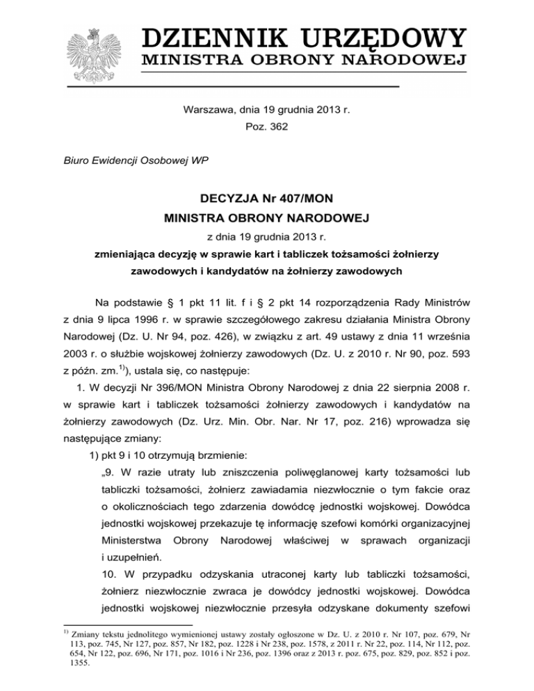DECYZJA Nr 407/MON MINISTRA OBRONY NARODOWEJ