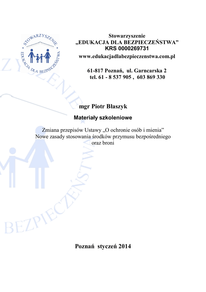 Stowarzyszenie „EDUKACJA DLA BEZPIECZEŃSTWA” KRS 0000269731 www.edukacjadlabezpieczenstwa.com.pl 61-817 Poznań, ul. Garncarska 2 tel. 61 - 8 537 905 , 603 869 330 mgr Piotr Błaszyk Materiały szkoleniowe Zmiana przepisów Ustawy „O ochronie osób i mienia” Nowe zasady stosowania środków przymusu bezpośredniego oraz broni Poznań styczeń 2014 Zagadnienia: 1. Zmiany w ustawie „O ochronie osób i mienia”. Pracownik ochrony od stycznia 2014 – nowe wymagania. 2. Zasady użycia środków przymusu bezpośredniego. 3. Zasady użycia broni palnej. 4. Odpowiedzialność karna i cywilna pracownika ochrony za przekroczenie lub niedopełnienie obowiązków. 5. Okoliczności zwalniające z odpowiedzialności karnej oraz cywilnej. Podstawa prawna: Ustawa z dnia 24 maja 2013 r. o środkach przymusu bezpośredniego i broni palnej Ustawa z dnia 22 sierpnia 1997 r. o ochronie osób i mienia Kodeks karny Kodeks cywilny Ustawa z dnia 20 marca 2009 r. o bezpieczeństwie imprez masowych Duże zmiany w Ustawie o ochronie osób i mienia dokonane zostały z dniem 05 czerwca 2013 ustawą o środkach przymusu bezpośredniego oraz drugą ustawą tzw. deregulacyjną, której przepisy obowiązują od 1 stycznia 2014 r. Zgodnie z zasadami wykładni prawniczej rozporządzenia mogą ograniczyć uprawnienia lub nałożyć inne dodatkowe obowiązki na firmy ochroniarskie i pracowników ochrony. Uprawnienia pracowników ochrony nie mogą być zwiększone poza uprawnienia wynikające z treści ustaw. Tracą aktualność rozporządzenia: w sprawie szczegółowych warunków i sposobu postępowania pracowników ochrony przy użyciu broni palnej, w sprawie szczegółowych warunków i sposobów użycia przez pracowników ochrony środków przymusu bezpośredniego. Zmienione jest rozporządzenie w sprawie szczegółowego trybu działań pracowników ochrony, podejmowanych wobec osób znajdujących się w granicach chronionych obiektów i obszarów. Ochrona osób - działania mające na celu zapewnienie bezpieczeństwa życia, zdrowia i nietykalności osobistej; Ochrona mienia – ochrona mienia - działania zapobiegające przestępstwom i wykroczeniom przeciwko mieniu, a także przeciwdziałające powstawaniu szkody wynikającej z tych zdarzeń oraz niedopuszczające do wstępu osób nieuprawnionych na teren chroniony; Z orzecznictwa sądowego: Ustawowa definicja ochrony sprowadza się do działań wyłącznie prewencyjnych przy wykonywaniu zadań w granicach chronionych obiektów, do działania w celu zapobiegania, przeciwdziałania, niedopuszczania. Aktywne działania pracowników ochrony np. ujęcie osób stwarzających bezpośrednie zagrożenie dla życia lub zdrowia czy chronionego mienia ma na celu niezwłoczne oddanie tych osób Policji. Środki przymusu bezpośredniego wymienione w art. 38 ust. 2 ustawy z dnia 22 sierpnia 1997 r. o ochronie osób i mienia (Dz. U. z 2005 r. Nr 145, poz. 1221 ze zm.) np. siła fizyczna w postaci chwytów obezwładniających oraz podobnych technik obrony, kajdanki, pałki obronne wielofunkcyjne mogły być zastosowane wyłącznie w odpowiedzi na zagrożenie dóbr powierzonych ochronie bądź w celu bezpośredniego ataku na pracownika ochrony. Przedsiębiorca, który uzyska koncesję na prowadzenie działalności gospodarczej w zakresie usług ochrony osób i mienia, uczestniczy w realizacji zadań państwa w zakresie zapewnienia ładu i bezpieczeństwa publicznego. Zatem właściwy organ współdziałający jest zobowiązany w oparciu o uzyskane informacje przeprowadzić analizę dawania rękojmi wykonywania tych zadań przez podmiot ubiegający się o koncesję. 1. Kwestia doboru osób do wykonywania działalności gospodarczej w zakresie usług ochrony osób, mienia i detektywistycznych, ma podstawowe znaczenie w wykonywaniu tego rodzaju koncesjonowanej działalności gospodarczej. Sprawcy przestępstw umyślnych, zwłaszcza przeciwko osobie lub mieniu nie mogą być brani pod uwagę przy doborze osób stojących na straży przestrzegania prawa. 2. Forma zatrudnienia (umowa zlecenia) nie ma żadnego znaczenia dla oceny skutków prawnych związanych z rażącym naruszeniem warunków koncesji Przedsiębiorca, który uzyskał koncesję na prowadzenie działalności gospodarczej w zakresie usług ochrony osób i mienia, uczestniczy de facto w realizacji zadań państwa w zakresie zapewnienia ładu i bezpieczeństwa publicznego. Kwalifikacje niezbędne w tym względzie obejmują nie tylko możność fizycznego wykonywania oraz organizacji tego typu działalności przez przedsiębiorcę, ale również jego wiarygodność. Usługi w zakresie ochrony osób i mienia związane są ze szczególnymi uprawnieniami podmiotu legitymującego się koncesją wydaną przez Ministra SWiA, na którym ciąży odpowiedzialność za stan porządku publicznego. Nie może zatem ulegać wątpliwości, że przy takim charakterze koncesji oraz odpowiedzialności organu jej udzielającego, organ ten może cofnąć koncesję podmiotowi, który zatrudniając osoby karane doprowadził do podważenia swojej wiarygodności. Wiarygodność przedsiębiorcy prowadzącego koncesjonowaną działalność gospodarczą w zakresie usług ochrony osób i mienia oznacza m.in. przekonanie o posługiwaniu przezeń przy wykonywaniu tych usług pracownikami o jednoznacznie nienagannej proweniencji. 2 Pracownik ochrony - osobę wpisaną na listę kwalifikowanych pracowników ochrony fizycznej lub kwalifikowanych pracowników zabezpieczenia technicznego, i wykonującą zadania ochrony w ramach wewnętrznej służby ochrony albo na rzecz przedsiębiorcy, który uzyskał koncesję na prowadzenie działalności gospodarczej w zakresie usług ochrony osób i mienia, lub osobę wykonującą zadania ochrony, w zakresie niewymagającym wpisu na te listy, na rzecz przedsiębiorcy, który uzyskał koncesję na prowadzenie działalności gospodarczej w zakresie usług ochrony osób i mienia; Od 1 stycznia nie będzie już licencji