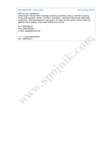 ARCHIWALNE | Wszystkie 14 Grudnia 2007 Haft ręczny, rękodzieło. Ukończyłam szkołę haftu ręcznego, wykonuję serwety, obrusy, bieżniki, zasłony, firany.haft wypukły, toledo, richelieu, dziergany, mereżka.Gwarantuję doskonałe wykonanie. Zainteresowanym zapraszam na moją stronkę gdzie można zobaczyć galerię moich haftów. http:/www.haftreczny.com.pl/ tel: 0338746237 kom: 0503429303 e-mail: [email protected] w w w .s po jn ik .c o m Krysia, Sucha Beskidzka Tel.: 338746237