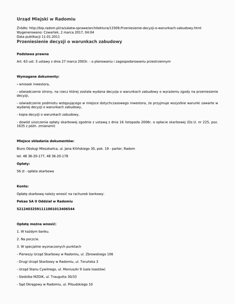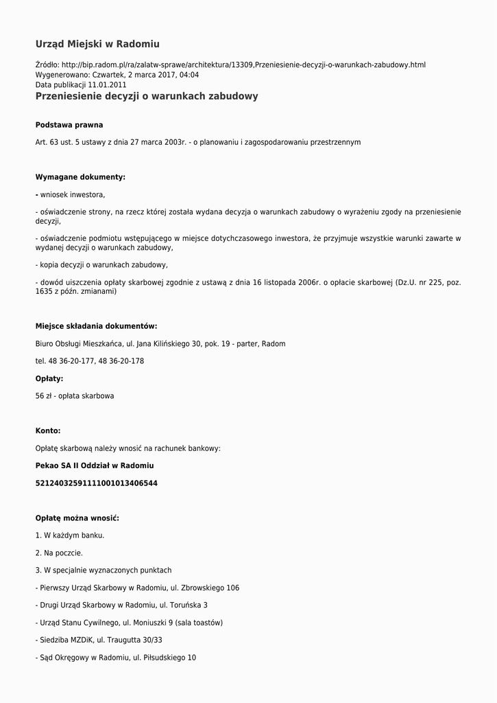 Urząd Miejski w Radomiu Źródło: http://bip.radom.pl/ra/zalatw-sprawe/architektura/13309,Przeniesienie-decyzji-o-warunkach-zabudowy.html Wygenerowano: Czwartek, 2 marca 2017, 04:04 Data publikacji 11.01.2011 Przeniesienie decyzji o warunkach zabudowy Podstawa prawna Art. 63 ust. 5 ustawy z dnia 27 marca 2003r. - o planowaniu i zagospodarowaniu przestrzennym Wymagane dokumenty: - wniosek inwestora, - oświadczenie strony, na rzecz której została wydana decyzja o warunkach zabudowy o wyrażeniu zgody na przeniesienie decyzji, - oświadczenie podmiotu wstępującego w miejsce dotychczasowego inwestora, że przyjmuje wszystkie warunki zawarte w wydanej decyzji o warunkach zabudowy, - kopia decyzji o warunkach zabudowy, - dowód uiszczenia opłaty skarbowej zgodnie z ustawą z dnia 16 listopada 2006r. o opłacie skarbowej (Dz.U. nr 225, poz. 1635 z późn. zmianami) Miejsce składania dokumentów: Biuro Obsługi Mieszkańca, ul. Jana Kilińskiego 30, pok. 19 - parter, Radom tel. 48 36-20-177, 48 36-20-178 Opłaty: 56 zł - opłata skarbowa Konto: Opłatę skarbową należy wnosić na rachunek bankowy: Pekao SA II Oddział w Radomiu 52124032591111001013406544 Opłatę można wnosić: 1. W każdym banku. 2. Na poczcie. 3. W specjalnie wyznaczonych punktach - Pierwszy Urząd Skarbowy w Radomiu, ul. Zbrowskiego 106 - Drugi Urząd Skarbowy w Radomiu, ul. Toruńska 3 - Urząd Stanu Cywilnego, ul. Moniuszki 9 (sala toastów) - Siedziba MZDiK, ul. Traugutta 30/33 - Sąd Okręgowy w Radomiu, ul. Piłsudskiego 10 - Starostwo Powiatowe w Radomiu, ul. Domagalskiego 7 - Urząd Miejski w Radomiu, ul. Kilińskiego 30 (punkt bankowy, parter; dostępne także znaki opłaty skarbowej) oraz kasa Urzędu - III piętro Bardzo prosimy o szczegółowy opis wpłaty na druku, ponieważ jest to podstawa jednoznacznej identyfikacji dokonanej opłaty ze sprawą, do której została wniesiona. Termin załatwienia sprawy: 30 dni Forma załatwienia sprawy: decyzja Tryb odwoławczy: do Samorządowego Kolegium Odwoławczego w Radomiu za pośrednictwem Prezydenta Miasta Radomia. Odwołanie należy złożyć w BOM - ul. Jana Kilińskiego 30, pok. 19 Załączniki załącznik do przeniesienia decyzji o warunkach zabudowy + oświadczenia stron 113.25 KB Data publikacji 11.01.2011 Data modyfikacji 27.08.2015 Rejestr zmian Autor: Ryszarda Kitowska Osoba publikująca: Justyna Kacprzak Kancelaria Prezydenta Statystyka strony: 2670 wizyt