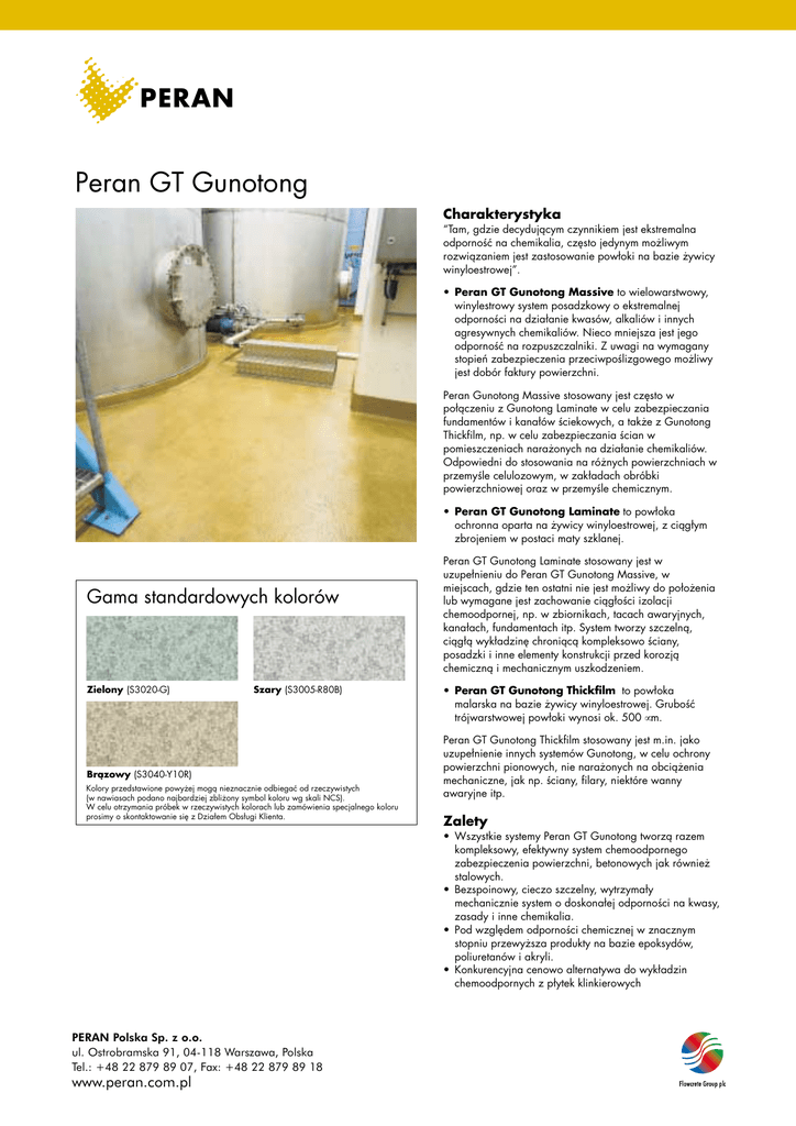 PERAN Peran GT Gunotong Charakterystyka “Tam, gdzie decydującym czynnikiem jest ekstremalna odporność na chemikalia, często jedynym możliwym rozwiązaniem jest zastosowanie powłoki na bazie żywicy winyloestrowej”. • Peran GT Gunotong Massive to wielowarstwowy, winylestrowy system posadzkowy o ekstremalnej odporności na działanie kwasów, alkaliów i innych agresywnych chemikaliów. Nieco mniejsza jest jego odporność na rozpuszczalniki. Z uwagi na wymagany stopień zabezpieczenia przeciwpoślizgowego możliwy jest dobór faktury powierzchni. Peran Gunotong Massive stosowany jest często w połączeniu z Gunotong Laminate w celu zabezpieczania fundamentów i kanałów ściekowych, a także z Gunotong Thickfilm, np. w celu zabezpieczania ścian w pomieszczeniach narażonych na działanie chemikaliów. Odpowiedni do stosowania na różnych powierzchniach w przemyśle celulozowym, w zakładach obróbki powierzchniowej oraz w przemyśle chemicznym. • Peran GT Gunotong Laminate to powłoka ochronna oparta na żywicy winyloestrowej, z ciągłym zbrojeniem w postaci maty szklanej. Gama standardowych kolorów Zielony (S3020-G) Szary (S3005-R80B) Brązowy (S3040-Y10R) Kolory przedstawione powyżej mogą nieznacznie odbiegać od rzeczywistych (w nawiasach podano najbardziej zbliżony symbol koloru wg skali NCS). W celu otrzymania próbek w rzeczywistych kolorach lub zamówienia specjalnego koloru prosimy o skontaktowanie się z Działem Obsługi Klienta. Peran GT Gunotong Laminate stosowany jest w uzupełnieniu do Peran GT Gunotong Massive, w miejscach, gdzie ten ostatni nie jest możliwy do położenia lub wymagane jest zachowanie ciągłości izolacji chemoodpornej, np. w zbiornikach, tacach awaryjnych, kanałach, fundamentach itp. System tworzy szczelną, ciągłą wykładzinę chroniącą kompleksowo ściany, posadzki i inne elementy konstrukcji przed korozją chemiczną i mechanicznym uszkodzeniem. • Peran GT Gunotong Thickfilm to powłoka malarska na bazie żywicy winyloestrowej. Grubość trójwarstwowej powłoki wynosi ok. 500 µm. Peran GT Gunotong Thickfilm stosowany jest m.in. jako uzupełnienie innych systemów Gunotong, w celu ochrony powierzchni pionowych, nie narażonych na obciążenia mechaniczne, jak np. ściany, filary, niektóre wanny awaryjne itp. Zalety • Wszystkie systemy Peran GT Gunotong tworzą razem kompleksowy, efektywny system chemoodpornego zabezpieczenia powierzchni, betonowych jak również stalowych. • Bezspoinowy, cieczo szczelny, wytrzymały mechanicznie system o doskonałej odporności na kwasy, zasady i inne chemikalia. • Pod względem odporności chemicznej w znacznym stopniu przewyższa produkty na bazie epoksydów, poliuretanów i akryli. • Konkurencyjna cenowo alternatywa do wykładzin chemoodpornych z płytek klinkierowych PERAN Polska Sp. z o.o. ul. Ostrobramska 91, 04-118 Warszawa, Polska Tel.: +48 22 879 89 07, Fax: +48 22 879 89 18 www.peran.com.pl Nowe posadzki betonowe: Usunąć warstwę mleczka cementowego poprzez bezpyłowe śrutowanie, frezowanie lub szlifowanie tarczą diamentową. Stare posadzki betonowe, posadzki ze zniszczoną lub słabo przylegającą farbą: W razie potrzeby powierzchnię należy dokładnie umyć, szlifować tarczą diamentową, śrutować lub frezować aż do uzyskania czystej powierzchni betonowej. Stare powłoki/powłoki malarskie epoksydowe lub akrylowe o dobrej przyczepności do podłoża: Powierzchnię należy umyć, przeszlifować np. tarczą diamentową lub śrutować bezpyłowo. Prosimy pamiętać o tym, że: Jakość podłoża betonowego powinna odpowiadać obowiązującej klasie tolerancji oraz wymogom stawianym pomieszczeniu z uwagi na prowadzoną w nim działalność. W przypadku zanieczyszczenia podłoża betonowego np. substancjami olejowymi lub innymi środkami, w celu uzyskania fachowej porady, należy skontaktować się z dostawcą. Jeżeli podłoże betonowe posadowione jest na gruncie, należy zawsze wykonać pomiary wilgotności podłoża. Prawidłowo wykonany drenaż oraz/lub izolacja przeciwwilgociowa zabezpieczają przed przenikaniem wilgoci w reakcji kapilarnej lub jako ciśnienia pary wodnej. • W razie potrzeby szpachlowanie należy wykonywać przy zastosowaniu dopasowanej do systemu Peran Gt Gunotong zaprawy epoksydowej Peran z odpowiednim wypełniaczem lub specjalnej, mineralnej szpachlówki Peran. Należy sprawdzić prawidłowość wykonania spadków podłoża. • Maksymalna, dopuszczalna wilgotność względna podłoża wynosi 90%. • Maksymalna, dopuszczalna wilgotność względna powietrza wynosi 70%. • W przypadku stosowania produktów na stali, w trakcie czyszczenia strumieniowo – ściernego oraz wykonania warstwy gruntującej, maksymalna, dopuszczalna wilgotność względna powietrza wynosi 50 %. • Warunkiem prawidłowego wykonania prac jest zapewnienie sprawnie funkcjonującej wentylacji w pomieszczeniu. Brak wentylacji powoduje zakłócenie procesu wiązania materiałów. • W miejscach, gdzie zainstalowane są kratki ściekowe i kanały odwadniające oraz w miejscach przylegania do innych powierzchni, zagłębień i podwyższeń należy zastosować rozwiązania podane na załączonych rysunkach szczegółowych. Zastosowanie i warunki techniczne Peran GT Gunotong Dostawca: PERAN Polska Sp.z o.o. Dzia∏ Obs∏ugi Klienta Tel.:+48 22 879 89 07 Uwaga! Peran GT Gunotong jest produktem przeznaczonym dla specjalnych potrzeb i w każdym przypadku zastosowania tego systemu zalecamy bezpośredni kontakt z dostawcą. Peran GT Gunotong. Kolor nr xxx. Grubość xx mm. Prace wstępne i sposób wykonania zgodnie ze wskazówkami dostawcy. Prace powinny zostać przeprowadzone przez Autoryzowanego Wykonawcę oraz udokumentowane zgodnie z procedurami systemu zapewnienia jakości i kontroli wykonania systemów Peran. Czyszczenie i renowacja Powierzchnię można zamiatać, odkurzać, przecierać na mokro lub sprzątać przy użyciu maszyny czyszczącej wyposażonej w ta