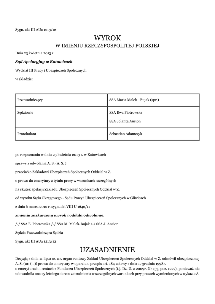 Sygn. akt III AUa 1213/12 WYROK W IMIENIU RZECZYPOSPOLITEJ POLSKIEJ Dnia 23 kwietnia 2013 r. Sąd Apelacyjny w Katowicach Wydział III Pracy i Ubezpieczeń Społecznych w składzie: Przewodniczący SSA Maria Małek - Bujak (spr.) Sędziowie SSA Ewa Piotrowska SSA Jolanta Ansion Protokolant Sebastian Adamczyk po rozpoznaniu w dniu 23 kwietnia 2013 r. w Katowicach sprawy z odwołania A. S. (A. S. ) przeciwko Zakładowi Ubezpieczeń Społecznych Oddział w Z. o prawo do emerytury z tytułu pracy w warunkach szczególnych na skutek apelacji Zakładu Ubezpieczeń Społecznych Oddział w Z. od wyroku Sądu Okręgowego - Sądu Pracy i Ubezpieczeń Społecznych w Gliwicach z dnia 6 marca 2012 r. sygn. akt VIII U 1642/11 zmienia zaskarżony wyrok i oddala odwołanie. /-/ SSA E. Piotrowska /-/ SSA M. Małek-Bujak /-/ SSA J. Ansion Sędzia Przewodnicząca Sędzia Sygn. akt III AUa 1213/12 UZASADNIENIE Decyzją z dnia 11 lipca 2011r. organ rentowy Zakład Ubezpieczeń Społecznych Oddział w Z. odmówił ubezpieczonej A. S. (ur. (...)) prawa do emerytury w oparciu o przepis art. 184 ustawy z dnia 17 grudnia 1998r. o emeryturach i rentach z Funduszu Ubezpieczeń Społecznych (t.j. Dz. U. z 2009r. Nr 153, poz. 1227), ponieważ nie udowodniła ona 15-letniego okresu zatrudnienia w szczególnych warunkach przy pracach wymienionych w wykazie A. Odwołanie od powyższej decyzji wniosła ubezpieczona domagając się zmiany zaskarżonej decyzji przez przyznanie jej prawa do wcześniejszej emerytury z tytułu pracy w szczególnych warunkach, uzasadniając, że przez wymagany okres 15 lat wykonywała prace w warunkach szczególnych wymienione w wykazie A, tj. na stanowisku obuwnika szwacza, kaletnika, kierowcy suwnicy, operatora linii do pakowania płyt, operatora pralnicy zmechanizowanej i tym samym spełnia warunki do przyznania prawa do emerytury. Wyrokiem z dnia 6 marca 2012 roku (sygn. akt VIII U 1642/11) Sąd Okręgowy -Sąd Pracy i Ubezpieczeń Społecznych w Gliwicach w punkcie 1 zmienił zaskarżoną decyzję w ten sposób, że przyznał ubezpieczonej prawo do emerytury z tytułu zatrudnienia w warunkach szczególnych począwszy od daty powstania prawa. Natomiast w punkcie 2 tegoż wyroku zasądził od Zakładu Ubezpieczeń Społecznych Oddział w Z. na rzecz ubezpieczonej kwotę 360 zł tytułem zwrotu kosztów zastępstwa adwokackiego. Sąd Okręgowy na podstawie przesłuchania ubezpieczonej, zeznań świadków M. R., M. M. i B. P., a także akt organu rentowego ustalił następujący stan faktyczny: A. S. w dniu 19 maja 2011r. złożyła wniosek o przyznanie prawa do wcześniejszej emerytury z tytułu wykonywania pracy w szczególnych warunkach. Ubezpieczona 55 lat ukończyła(...) Skarżąca, na dzień 1 stycznia 1999r. legitymuje się okresem składkowym i nieskładkowym w wymiarze ponad 25 lat, w tym udowodniła jedynie 12 lat, 1 miesiąc i 3 dni okresów pracy w szczególnych warunkach wymienionych w wykazie A. Organ rentowy zaliczył do pracy w warunkach szczególnych okresy pracy: od 11 sierpnia 1986r. do 30 listopada 1995r. w (...) Zakładach (...) oraz od 1 grudnia 1995r. do 31 grudnia 1998r. w (...) Odlewnia Spółka z ograniczoną odpowiedzialnością w G. na stanowisku suwnicowej. Nie uznał zaś za pracę w warunkach szczególnych pracy w okresach: - od 1 września 1972r. do 13 lutego 1976r. w Zakładzie (...) w Z. na stanowisku ucznia w zawodzie szwacza obuwia, - od 1 marca 1976r. do 23 marca 1977r. w Przedsiębiorstwie (...) w G. na stanowisku kaletnika, - od 1 kwietnia 1977r. do 21 listopada 1977r. w Pracowni (...) H. S. na stanowisku pracownika niewykwalifikowanego, - od 20 grudnia 1977r. do 15 lipca 1978r. w Hucie(...) w G. na stanowisku kierowcy suwnicy, - od 11 września 1978r. do 1 sierpnia 1980r. w Przedsiębiorstwie (...) w G. na stanowisku operatora linii pakowania płyt, - od 15 września 1980r. do 31 marca 1981r. w Kaletnictwie S. B. w Z. jako szwacz kaletniczy, - od 14 lipca 1984r. do 31 lipca 1986r. w Szpitalu (...) w G. jako operator pralnicy zmechanizowanej, ponieważ ubezpieczona na żaden z tych okresów nie przedłożyła świadectwa pracy wykonywanej w szczególnych warunkach. Ubezpieczona nie jest członkiem OFE, na dzień złożenia wniosku o emeryturę nie pozostawała w zatrudnieniu. Stosunek pracy rozwiązała z dniem 30 kwietnia 2011r. Po przeanalizowaniu sprawy organ rentowy wydał zaskarżoną decyzję. Ubezpieczona w okresie od 1 marca 1976r. do 23 marca 1977r: była zatrudniona w Przedsiębiorstwie (...) w G. na stanowisku kaletnika. Praca ta polegała na szyciu torebek na hali produkcyjnej, gdzie jednocześnie odbywało się klejenie torebek klejem Butaprem. Na hali pracowało ok. 100 osób, panował tam zaduch, nadmierny hałas i nieprzyjemny zapach z kleju Butaprem. Była to praca jednozmianowa, stała i w pełnym wymiarze czasu pracy. Pracownicy otrzymywali mleko w ilości 0,5 litra dziennie. W okresie od 11 września 1978r. do 1 sierpnia 1980r. odwołująca pracowała w Przedsiębiorstwie (...) w G. jako operator linii pakowania płyt. Ubezpieczona pracowała przy odbiorze płyt z waty izolacyjnej bezpośrednio z taśmy produkcyjnej, jak również waty izolacyjnej przekazywanej luzem i układała je na paletach obok jej stanowiska pracy. Była to praca na linii produkcyjnej. Praca ta odbywała się na terenie hali, gdzie panował nadmierny hałas, odór ulatniający się ze szkodliwych materiałów: bazaltu, koksu i żywicy. Zakład nie posiadał odpowiednich urządzeń wentylacyjnych. Oprócz pracowników zatrudnionych przy taśmie produkcyjnej na hali pracowali także pracownicy przy granulatorach, wtryskarkach żywic oraz olejów, a ponadto mechanicy zajmujący się smarowaniem maszyn i urządzeń znajdujących się na terenie hali. Zdarzało się, że odbierane przez skarżącą płyty były bardzo gorące lub się paliły, ponieważ nie zawsze działała komora chłodzenia, co narażało ubezpieczoną na wysokie temperatury oraz wdychanie oparó