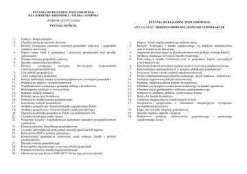 PYTANIA DO EGZAMINU DYPLOMOWEGO DLA KIERUNKU EKONOMIA - STUDIA I STOPNIA (POZIOM LICENCJACKI) PYTANIA DO EGZAMINU DYPLOMOWEGO PYTANIA OGÓLNE 1. 2. 3. 4. 5. 6. 7. 8. 9. 10. 11. 12. 13. 14. 15. 16. 17. 18. 19. 20. 21. 22. 23. 24. 25. 26. 27. 28. 29. 30. Funkcje i formy pieniądza. Charakterystyka przedmiotu ekonomii. Różnice występujące pomiędzy systemem gospodarki rynkowej i gospodarki centralnie sterowanej. Pojęcie szarej strefy w gospodarce - przyczyny powstawania oraz sposoby ograniczania. Warunki istnienia gospodarki rynkowej. Sposoby ograniczania bezrobocia. Różnice występujące pomiędzy inwestycjami bezpośrednimi a inwestycjami portfelowymi. Cele polityki gospodarczej. Cechy konkurencji doskonałej. Relacje zachodzące między systemem podatkowym a rozwojem gospodarki. Podstawowe wpływy i wydatki budżetowe. Współzależności występujące pomiędzy inflacją a bezrobociem. Rola kapitału ludzkiego w rozwoju firmy. Rodzaje i funkcje podatków. Rodzaje i przyczyny bezrobocia. Podstawowe źródła wzrostu gospodarczego. Instrumenty polityki gospodarczej. Struktura geograficzna i towarowa handlu zagranicznego Polski. Struktura geograficzna i towarowa handlu międzynarodowego. Zagraniczna polityka gospodarcza Polski i jej podstawowe cele. Czynniki kształtujące podaż i popyt. Wzajemne związki i współzależności zachodzące pomiędzy przedsiębiorstwem a państwem. Kryteria podziału i klasyfikacja przedsiębiorstw. Czynniki wpływające na atrakcyjność inwestycyjną kraju lub regionu. Rola sektora MSP w polskiej gospodarce. Konsekwencje gospodarcze stosowania zasad wolnego handlu i polityki protekcjonizmu. Mierniki wzrostu gospodarczego. Rola kapitału zagranicznego w rozwoju polskiej gospodarki . Podstawowe bariery handlu międzynarodowego. Główne przyczyny kryzysu 2008-2013 i formy jego przezwyciężania. SPECJALNOŚĆ: MIĘDZYNARODOWE STOSUNKI GOSPODARCZE 1. 2. 3. 4. 5. 6. 7. 8. 9. 10. 11. 12. 13. 14. 15. 16. 17. 18. 19. 20. Pojęcie i skutki międzynarodowego podziału pracy. Korzyści wynikające z handlu zagranicznego wg doktryny merkantylizmu oraz w świetle teorii klasycznej. Argumenty przemawiające za protekcjonizmem oraz polityką wolnego handlu. Struktura i tendencje rozwojowe handlu światowego. Rola usług w handlu światowym oraz w gospodarce krajów rozwiniętych i rozwijających się. Rola bezpośrednich inwestycji zagranicznych w rozwoju gospodarczym kraju. Rola korporacji transnarodowych w procesie globalizacji gospodarczej? Przyczyny, formy i skutki migracji międzynarodowych. Formy międzynarodowego transferu technologii i myśli naukowo – technicznej. Narzędzia zagranicznej polityki ekonomicznej. Podmioty międzynarodowej polityki ekonomicznej. Charakterystyka wpływu zmian kursu walutowego na handel zagraniczny. Charakterystyka problematyki zadłużenia międzynarodowego. Podstawowe problemy globalne współczesnego świata. Rola ceł w handlu światowym. Tendencje integracyjne we współczesnym świecie. Gospodarcze ugrupowania o charakterze integracyjnym występujące we współczesnym świecie. Etapy oraz warunki integracji gospodarczej. Sposoby regulacji importu i eksportu. Podstawowe problemy zróżnicowania gospodarczego i społecznego współczesnego świata.