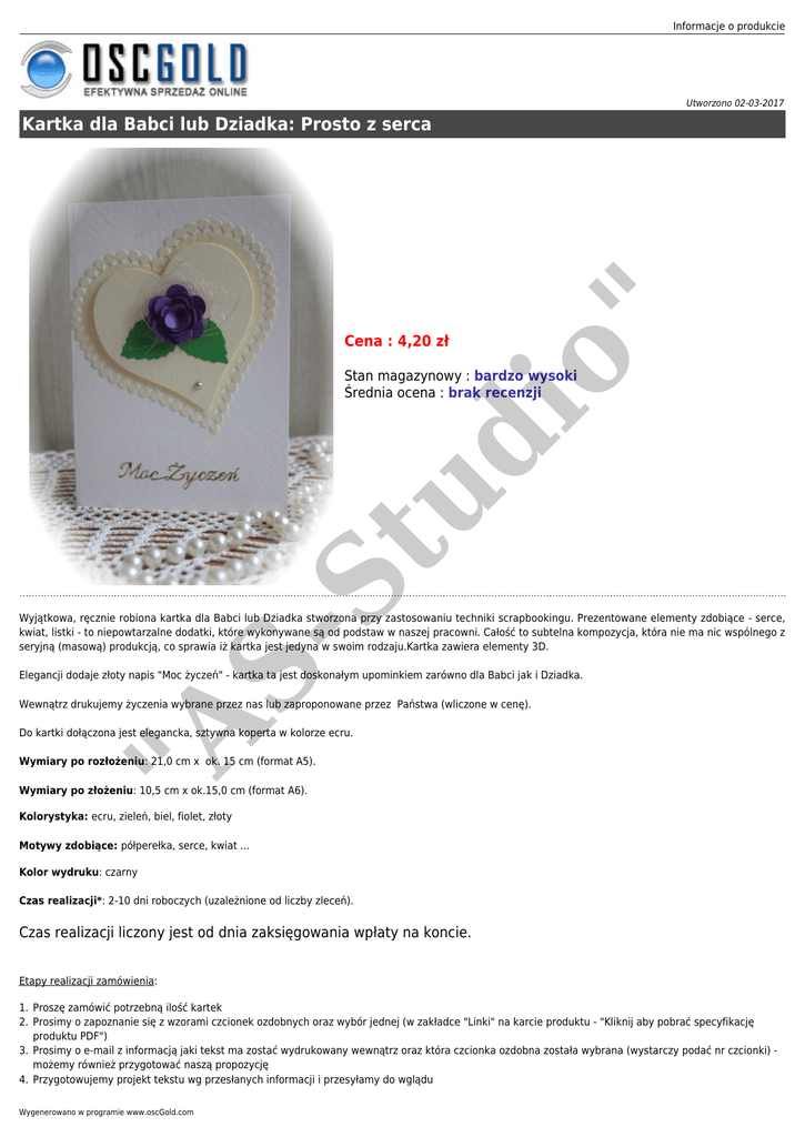 Informacje o produkcie Utworzono 02-03-2017 Cena : 4,20 zł o" Kartka dla Babci lub Dziadka: Prosto z serca St ud i Stan magazynowy : bardzo wysoki Średnia ocena : brak recenzji S- Wyjątkowa, ręcznie robiona kartka dla Babci lub Dziadka stworzona przy zastosowaniu techniki scrapbookingu. Prezentowane elementy zdobiące - serce, kwiat, listki - to niepowtarzalne dodatki, które wykonywane są od podstaw w naszej pracowni. Całość to subtelna kompozycja, która nie ma nic wspólnego z seryjną (masową) produkcją, co sprawia iż kartka jest jedyna w swoim rodzaju.Kartka zawiera elementy 3D. Elegancji dodaje złoty napis "Moc życzeń" - kartka ta jest doskonałym upominkiem zarówno dla Babci jak i Dziadka. "A Wewnątrz drukujemy życzenia wybrane przez nas lub zaproponowane przez Państwa (wliczone w cenę). Do kartki dołączona jest elegancka, sztywna koperta w kolorze ecru. Wymiary po rozłożeniu: 21,0 cm x ok. 15 cm (format A5). Wymiary po złożeniu: 10,5 cm x ok.15,0 cm (format A6). Kolorystyka: ecru, zieleń, biel, fiolet, złoty Motywy zdobiące: półperełka, serce, kwiat ... Kolor wydruku: czarny Czas realizacji*: 2-10 dni roboczych (uzależnione od liczby zleceń). Czas realizacji liczony jest od dnia zaksięgowania wpłaty na koncie. Etapy realizacji zamówienia: 1. Proszę zamówić potrzebną ilość kartek 2. Prosimy o zapoznanie się z wzorami czcionek ozdobnych oraz wybór jednej (w zakładce "Linki" na karcie produktu - "Kliknij aby pobrać specyfikację produktu PDF") 3. Prosimy o e-mail z informacją jaki tekst ma zostać wydrukowany wewnątrz oraz która czcionka ozdobna została wybrana (wystarczy podać nr czcionki) możemy również przygotować naszą propozycję 4. Przygotowujemy projekt tekstu wg przesłanych informacji i przesyłamy do wglądu Wygenerowano w programie www.oscGold.com "A S- St ud i o" 5. Po akceptacji projektu oraz zaksięgowaniu należności przystępujemy do pracy 6. Wysyłkę zamówionych produktów potwierdzamy e-mailem bądź telefonicznie.