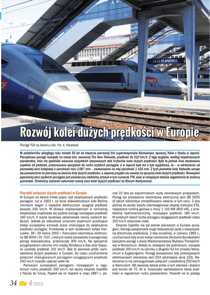 Systemy transportowe Andrzej Harassek Rozwój kolei dużych prędkości w Europie Pociągi TGV na dworcu Lille. Fot. A. Harassek W październiku ubiegłego roku minęło 50 lat od otwarcia pierwszej linii superekspresów Shinkansen, łączącej Tokio z Osaką w Japonii. Początkowo pociągi rozwijały na nowej linii, nazwanej The New Tokkaido, prędkość do 210 km/h. Z tego względu, według współczesnych standardów, linia nie spełniała wówczas wszystkich stosowanych dziś kryteriów kolei dużych prędkości. Była to jednak linia zbudowana zupełnie od podstaw, przeznaczona specjalnie do ruchu szybkich pociągów, a w Japonii była też o tyle wyjątkowa, że – w odróżnieniu od pozostałej sieci kolejowej o szerokości toru 1 067 mm – zastosowano na niej szerokość 1 435 mm. Z tych powodów linię Tokkaido uznaje się powszechnie za pierwszą na świecie linię dużych prędkości, a Japonię przyjęło się uważać za ojczyznę kolei dużych prędkości. Rozwojowi japońskiej sieci szybkich pociągów jest poświęcony oddzielny artykuł w tym numerze TTS, więc w niniejszym tekście zagadnienia te zostaną pominięte. Omówiony zostanie natomiast rozwój sieci kolei dużych prędkości na Starym Kontynencie. Początki połączeń dużych prędkości w Europie W Europie od dawna trwały prace nad zwiększaniem prędkości pociągów. Już w 1903 r. na torze doświadczalnym koło Berlina niemiecki wagon o napędzie elektrycznym osiągnął prędkość powyżej 200 km/h. W okresie międzywojennym w normalnej eksploatacji znajdowały się szybkie pociągi rozwijające prędkość 160 km/h. II wojna światowa zahamowała rozwój szybkich połączeń. Jednak po odbudowie zniszczeń wojennych przodujące koleje europejskie wznowiły prace zmierzające do zwiększenia prędkości pociągów. Przodowały w tych działaniach koleje francuskie. 28 i 29 marca 1955 r. francuskie lokomotywy elektryczne BB 9004 i CC 7107, z których każda prowadziła trzywagonowy pociąg doświadczalny, przekroczyły 300 km/h. Na specjalnie przygotowanym odcinku linii między Bordeaux a Dax obie maszyny uzyskały prędkość 331 km/h. Były to pierwsze próby wprowadzania dużych prędkości w Europie. Do czasu uruchomienia połączeń obsługiwanych pociągami osiągającymi prędkość 200 km/h musiało upłynąć wiele lat. Pierwszym europejskim pociągiem, rozwijającym w regularnym ruchu prędkość 200 km/h, był słynny ekspres Capitôle z Paryża do Tuluzy. Pojawił się on dopiero w maju 1967 r., po- 34 4 /2015 nad 22 lata po wspomnianych wyżej rekordowych przejazdach. Pociąg był prowadzony lokomotywą elektryczną serii BB 9200 (6 takich lokomotyw zmodyfikowano właśnie w tym celu). 3 lata później do służby weszły czterowagonowe zespoły trakcyjne ETG, napędzane turbiną gazową o mocy 1 150 KM (850 kW), z przekładnią hydromechaniczną, rozwijające prędkość 180 km/h. W kolejnych latach liczba pociągów osiągających prędkość rzędu 200 km/h stopniowo rosła. Ekspres Capitôle nie był jednak pierwszym w Europie pociągiem, którego pasażerowie mogli doświadczyć jazdy z niespotykaną dotychczas prędkością. 2 lata wcześniej, w czerwcu 1965 r., uruchamiane były przez koleje niemieckie Deutsche Bundesbahn specjalne pociągi z okazji Międzynarodowej Wystawy Transportowej w Monachium. Składy te, dostępne dla podróżnych, rozwijały prędkość 200 km/h na odcinku o długości 62 km (między Monachium a Augsburgiem). Pociągi prowadzone były prototypowymi elektrowozami ówczesnej serii E03 (późniejsza seria 103). Wydarzenie to nie zainaugurowało połączeń z prędkością 200 km/h w Niemczech. DB zawiesiły dalsze próby w tym zakresie i dopiero pod koniec lat 70. XX w. rozpoczęto wprowadzanie takiej prędkości w regularnym ruchu pasażerskim. Pozwolił na to postęp Systemy transportowe szeroko zakrojonej modernizacji linii kolejowych. Pierwsze li- – pociąg dużej prędkości). Skład został oddany do próbnej eksnie, na których pociągi rozwijały prędkość 200 km/h, to: Mona- ploatacji 4 kwietnia 1972 r. Na podstawie przeprowadzonych wcześniej studiów i analiz chium–Augsburg (1977), Augsburg–Donauwörth (1978–1981), Hanower–Hamburg (1978–1987), Hamburg–Brema–Münster we wczesnych latach 70. podjęto decyzję, iż pierwsza we Francji linia dużych prędkości połączy Paryż i Lyon. Połączenie Paryża (1978–1990), Hamm–Brackwede (1980). Prace nad zwiększeniem prędkości jazdy do około 200 km/h z Lyonem i z wybrzeżem Morza Śródziemnego (PLM–Paris–Lyon– trwały również w innych krajach. Prawie 10 lat po kolejach francu- Méditerranée) było zawsze jednym z najbardziej obciążonych kieskich pierwsze pociągi rozwijające taką prędkość w normalnym runków. Istniejąca tam linia kolejowa zelektryfikowana prądem ruchu uruchomiono w Wielkiej Brytanii. 4 października 1976 r. stałym o napięciu 1 500 V i w większości czterotorowa już w końweszły do eksploatacji pierwsze składy Inter-City 125 (od maksy- cu lat 60. przestała wystarczać. Ze względu na ukształtowanie malnej prędkości 125 mil/h, co odpowiada ok. 200 km/h), zwa- terenu nie było też możliwości zwiększenia prędkości powyżej ne też HST (High Speed Train). W odróżnieniu od pociągów fran- 160 km/h. Budowa nowej linii dużej szybkości była więc konieczcuskich i niemieckich, brytyjskie składy były napędzane silnikami nością i logiczną konsekwencją analizy sytuacji. spalinowymi z przekładnią elektryczną. Wynikało to z niezbyt szeBudowę nowej linii, oznaczonej w odróżnieniu od pociągów roko rozwiniętej w tym czasie elektryfikacji sieci kolejowej Króle- skrótem LGV Sud-Est (od Ligne à Grande Vitesse; linia znana stwa. Pierwsze połączenia były realizowane na trasie z Londynu jest także jako PSE: Paris–Sud-Est), rozpoczęto w końcu 1976 r. Paddington do Bristolu i Cardiff. W następnych latach połącze- Lini