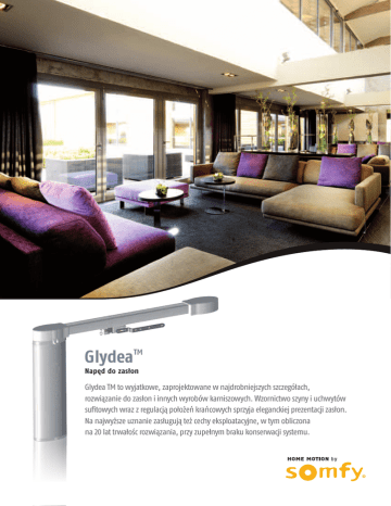 GlydeaTM Napęd do zasłon Glydea TM to wyjatkowe, zaprojektowane w najdrobniejszych szczegółach, rozwiązanie do zasłon i innych wyrobów karniszowych. Wzornictwo szyny i uchwytów sufitowych wraz z regulacją położeń krańcowych sprzyja eleganckiej prezentacji zasłon. Na najwyższe uznanie zasługują też cechy eksploatacyjne, w tym obliczona na 20 lat trwałośc rozwiązania, przy zupełnym braku konserwacji systemu. GlydeaTM spotyka się z uznaniem przy realizacji najbardziej prestiżowych projektów. Zmotoryzowane zasłony znajdują się na samej górze listy niezbędnych produktów przy projektowaniu i renowacji wysokiej klasy hoteli, luksusowych domów oraz sal konferencyjnych. Rozwiązanie GlydeaTM sprawi, iż Twoje miejsce będzie wyróżniało się pod względem wizerunku, użyteczności i funkcjonalności... lydeaTM poprawia wizerunek każdego miejsca, G a także czyni codzienne czynności prostszymi apęd GlydeaTM w znaczacy sposób przyczynia się do N oszczędzania energii, zapewnia komfort i bezpieczeństwo D zięki funkcji - ruch przez dotyk* - możliwe jest uruchomienie napędu elektrycznego poprzez delikatne szarpnięcie tkaniny i tym samym automatyczne otwarcie lub zamknięcie zasłony. Zalety rozwiązania Glydea Elastyczność Efektywność Estetyka Cisza Współpraca z różnymi systemami sterowań - zarówno radiowymi, jak i przewodowymi ·Funkcja ruch przez dotyk - zasłona otwiera się i zamyka przez pociągnięcie tkaniny. · Funkcja „my”, aby automatycznie sterować zasłoną i przesuwać ją do pozycji komfortowej. · Regulowana prędkość: 12,5 cm/s do 20 cm/s Innowacja w Somfy: Opatentowany estetyczny design obudowy ukrywający kable i chroniący moduły sterujące wewnątrz napędu Niski poziom hałasu szyny (<44db(A)) dzięki umieszczeniu paska napędowego w szynie. Pilot Telis 16 Nadajnik naścienny Smoove 1 RTS Przełącznik kablowy INIS UNO * Dotyczy GlydeaTM 60e DCT Somfy Sp. z o.o. ul. Marywilska 34J 03-228 Warszawa T: +48 (22) 509 53 00 F:+48 (22) 509 53 01 www.somfy.pl e-mail: [email protected] Copyright ® by Somfy 06/2011