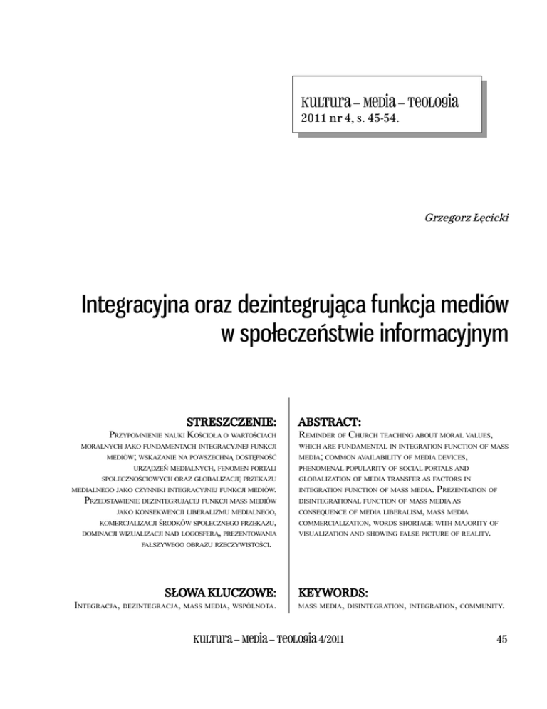Kultura – Media – Teologia 2011 nr 4, s. 45-54. Grzegorz Łęcicki Integracyjna oraz dezintegrująca funkcja mediów w społeczeństwie informacyjnym STRESZCZENIE: PRZYPOMNIENIE NAUKI KOŚCIOŁA O WARTOŚCIACH MORALNYCH JAKO FUNDAMENTACH INTEGRACYJNEJ FUNKCJI ABSTRACT: REMINDER OF CHURCH TEACHING ABOUT MORAL VALUES, WHICH ARE FUNDAMENTAL IN INTEGRATION FUNCTION OF MASS MEDIÓW; WSKAZANIE NA POWSZECHNĄ DOSTĘPNOŚĆ MEDIA; COMMON AVAILABILITY OF MEDIA DEVICES, URZĄDZEŃ MEDIALNYCH, FENOMEN PORTALI PHENOMENAL POPULARITY OF SOCIAL PORTALS AND SPOŁECZNOŚCIOWYCH ORAZ GLOBALIZACJĘ PRZEKAZU GLOBALIZATION OF MEDIA TRANSFER AS FACTORS IN MEDIALNEGO JAKO CZYNNIKI INTEGRACYJNEJ FUNKCJI MEDIÓW. PRZEDSTAWIENIE DEZINTEGRUJĄCEJ FUNKCJI MASS MEDIÓW JAKO KONSEKWENCJI LIBERALIZMU MEDIALNEGO, KOMERCJALIZACJI ŚRODKÓW SPOŁECZNEGO PRZEKAZU, DOMINACJI WIZUALIZACJI NAD LOGOSFERĄ, PREZENTOWANIA FAŁSZYWEGO OBRAZU RZECZYWISTOŚCI. SŁOWA KLUCZOWE: INTEGRACJA, DEZINTEGRACJA, MASS MEDIA, WSPÓLNOTA. INTEGRATION FUNCTION OF MASS MEDIA. PREZENTATION OF DISINTEGRATIONAL FUNCTION OF MASS MEDIA AS CONSEQUENCE OF MEDIA LIBERALISM, MASS MEDIA COMMERCIALIZATION, WORDS SHORTAGE WITH MAJORITY OF VISUALIZATION AND SHOWING FALSE PICTURE OF REALITY. KEYWORDS: MASS MEDIA, DISINTEGRATION, INTEGRATION, COMMUNITY. Kultura – Media – Teologia 4/2011 45 SUPERMARKET KULTURY W śród podstawowych zadań środków społecznego przekazu, obok informowania, edukacji oraz dostarczania rozrywki, wymienia się również funkcję integracyjną1. Dzięki wyjątkowemu postępowi w dziedzinie technologii komunikacyjnych, mających zastosowanie w mass mediach i przyczyniających się bezpośrednio do ich rozwoju oraz zasięgu, współczesna cywilizacja osiągnęła wymiar globalny, a techniczna symulacja świadomości stała się procesem rozszerzonym na całą społeczność 2. Nauczanie Kościoła katolickiego o wartościach moralnych jako fundamentach integracyjnej misji mediów Integracyjną funkcję środków społecznego przekazu - w kontekście dobra wspólnego, rozwoju i postępu - wyjątkowo mocno akcentuje doktryna Kościoła katolickiego dotycząca mass mediów, ich roli oraz znaczenia we współczesnym świecie 3. Na szczególną uwagę zasługuje nauczanie papieża Jana Pawła II, który uznał media za pierw szy współczesny areopag, który „jednoczy ludzkość i czyni z niej, jak to się określa, ‘światową wioskę’. Środki społecznego przekazu osiągnęły takie znaczenie, że dla wielu są głównym narzędziem informacyjnym i formacyjnym, przewodnikiem i natchnieniem w zachowaniach indywidualnych, rodzinnych, społecznych” 4. Podkreśleniu integracyjnego wymiaru mass mediów Jan Paweł II poświęcił kilka orędzi, wygłaszanych tradycyjnie na Światowe Dni Komunikacji Społecznej. Papież przypo mniał, że najcenniejszą zasługą mediów jest tworzenie więzi między narodami i kulturami; postulując realizację ideałów braterstwa i międzynarodowej solidarności Jan Paweł II wskazał na konieczność przestrzegania podstawowych wartości etycznych, sprzyjających budowaniu jedności całej rodziny ludzkiej. Wyliczając najszlachetniej sze cele mass mediów, a mianowicie przekazywanie i wyrażanie prawdy, sprawiedliwości, pokoju, dobrej woli, czynnego miłosierdzia, wzajemnej pomocy, miłości i wspólnoty, Papież uwypuklił również to, że wykorzystanie środków społecznego przekazu zależy od moralnej wizji oraz etycznej odpowiedzialności wszystkich zaan gażowanych w proces nadawania i odbioru informacji. Jan Paweł II podkreślił także znaczenie nowych, coraz doskonalszych metod i technologii w zakresie środków społecznego przekazu w dziele zacieśniania więzów braterstwa i wzajemnego zrozumienia ludzi różnych kultur i narodów5. W licznych wystąpieniach, orędziach oraz li1 2 3 4 5 46 Por. A. Lepa, Pedagogika mass mediów, Łódź 2003, s. 46. Zob. M. McLuhan, Zrozumieć media. Przedłużenia człowieka (tł. N. Szczucka), Warszawa 2004, s. 33. Zob. Dekret Inter mirifica o środkach społecznego przekazu, p. 5., w: Sobór Watykański II. Konstytucje, dekrety, deklaracje, Poznań 2002, ss. 88 – 89; Jan Paweł II, List apostolski Szybki rozwój o szybkim rozwoju środków społecznego przekazu, p. 3., w: Listy apostolskie Ojca Świętego Jana Pawła II, Kraków 2007, s. 762. Jan Paweł II, Encyklika Redemptoris missio o stałej aktualności posłania misyjnego, p. 37, w: Encykliki Ojca Świętego Jana Pawła II, Kraków 2007, s. 554. Zob. Jan Paweł II, Komunikacja społeczna w służbie braterstwa i solidarności wśród ludów i narodów, p. 3; Tenże, Środki komunikacji w służbie jedności i postępu rodziny ludzkiej, w: Orędzia papieskie na Kultura – Media – Teologia 4/2011 „ G. Łęcicki, Integracyjna oraz dezintegrująca funkcja mediów... We współczesnym społeczeństwie dominuje cywilizacja gry i zabawy; praca, wysiłek nie stanowią już wartości podstawowych1. Zadania środków społecznego przekazu, dawniej uważane za fundamentalne, a mianowicie informowanie, opisywanie i komentowanie rzeczywistości, edukowanie oraz wychowywanie, zostały więc zredukowane i zdominowane przez funkcję rozrywkową; nawet bowiem informacje dziennikarskie mają odbiorcom sprawiać przyjemność. stach skierowanych do ludzi mediów, rozmaitych redakcji prasowych, radiowych i telewizyjnych, stowarzyszeń i zrzeszeń dziennikarskich, Papież mocno akcentował to, że prawdziwą jedność ludzkości buduje się poprzez służbę prawdzie, dobru, pięk nu oraz afirmację i obronę godności człowieka 6. Papież Benedykt XVI w kolejnych orędziach na Światowe Dni Komunikacji Społecznej apelował do mediów o odpowiedzialność, służenie prawdzie, rzetelne relacjonowanie wydarzeń, wyczerpujące wyjaśnianie zagadnień publicznych, uczciwe przedstawienie rozmaitych opinii. Sprzeciwiał się temu, by media były tubą materializmu gospodarczego i relatywizmu etyczne