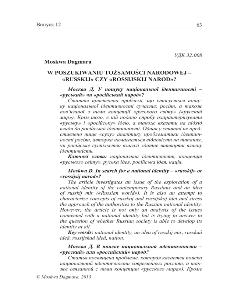 Випуск 12 Moskwa Dagmara 63 УДК 32:008 W poszukiwaniu tożsamości narodowej – «russkij» czy «rossijsKij narod»? Москва Д. У пошуку національної ідентичності – «руський» чи «російський народ»? Стаття присвячена проблемі, що стосується пошуку національної ідентичності сучасних росіян, а також пов’язаної з ними концепції «руського світу» («русский мир»). Крім того, в ній подано спробу охарактеризувати «руську» і «російську» ідею, а також вказати на підхід влади до російської ідентичності. Однак у статті не представлено лише «суху» аналітику проблематики ідентичності росіян, авторка намагається відповісти на питання, чи російське суспільство взагалі здатне витворти власну ідентичність. Ключові слова: національна ідентичність, концепція «руського світу», руська ідея, російська ідея, нація. Moskwa D. In search for a national identity – «russkij» or «rossijsij narod»? The article investigates an issue of the exploration of a national identity of the contemporary Russians and an idea of russkij mir («Russian world»). It is also an attempt to characterize concepts of russkoj and rossijskoj idei and stress the approach of the authorities to the Russian national identity. However, the article is not only an analysis of the issues connected with a national identity but is trying to answer to the question of whether Russian society is able to develop its identity at all. Key words: national identity, an idea of russkij mir, russkaâ ideâ, rossijskaâ ideâ, nation. Москва Д. В поиске национальной идентичности – «русский» или «российский» народ? Статья посвящена проблеме, которая касается поиска национальной идентичности современных россиян, а также связанной с ними концепции «русского мира»). Кроме © Moskwa Dagmara, 2013 Наукові записки. Серія «Культурологія» 64 того, в ней представлена попытка охарактеризовать «русскую» и «российскую» идею, а также указать на подход власти к российской идентичности. Тем не менее, в статье не представлена исключительно «сухая» аналитика идентичности россиян, авторка пытается ответить на вопрос, может ли российское общество создать собственную идентичность Ключевые слова: национальная идентичность, концепция «русского мира», русская идея, российская идея, нация. Matka Gruzinka, ojciec Ukrainiec; matka Kałmuczka, ojciec Czukcza, matka Rosjanka, ojciec Żyd... – Kim ja jestem? -»Rossijaninem»1. Niniejsza praca dotyka problematyki związanej z poszukiwaniem tożsamości narodowej przez współczesnych Rosjan oraz związanej z nią koncepcją russkogo mira («świat rosyjski»). Jest również próbą scharakteryzowania russkoj i rossijskoj idei, a także wskazania na stosunek władz do problemów tożsamościowych Rosjan. Problem zostanie przeanalizowany w następujących aspektach: – tożsamość narodowa – czym jest i w jaki sposób powstaje? – problem z tożsamością narodową współczesnych Rosjan; – podejście władz rosyjskich do rosyjskiej tożsamości narodowej; – charakterystyka koncepcji russkogo i rossijskogo naroda oraz russkogo mira (rosyjski świat); Poniższy szkic nie stanowi jedynie suchej analizy tożsamości narodowej Rosjan oraz ich funkcjonowania w świecie rosyjskim. Stara się bowiem odpowiedzieć na pytanie, czy społeczeństwo rosyjskie jest w stanie w ogóle wykształcić swoją tożsamość. Słowem wstępu Na wstępie niniejszej pracy postaram się zdefiniować najważniejsze dla niej pojęcia. Mówiąc o tożsamości narodowej, będącej przedmiotem badawczym wielu dyscyplin naukowych (m.in. socjologii, filozofii, historii, politologii, psychologii, kulturoznawstwa, psychologii czy etnologii)2, nie sposób nie przywołać Benedicta Andersona. Mówił A. De Lazari, Putinofilia i putinofobia, «Przegląd», 36/2009, http:// www.przeglad-tygodnik.pl/pl/artykul/putinofilia-putinofobia z 7 V 2012. 2 L. Dyczewski, R. Szwed, Wstęp, w: Odmiany tożsamości, red. D. Wilk, Lublin 2010, s. 5. 1 Випуск 12 65 on o narodach jako o wyobrażonych wspólnotach politycznych, wyobrażonych jako nieuchronnie ograniczonych i suwerennych. Idąc dalej, naród jest wspólnotą wyobrażoną, ponieważ członkowie nawet najmniej licznego narodu nigdy nie znają większości swych rodaków, nie spotykają ich, nic nawet o nich nie wiedzą, a mimo to pielęgnują w umyśle obraz wspólnoty. Narody są również ograniczone, gdyż nawet największe z nich (…) zajmują skończony, choćby i rozciągliwy obszar, poza którym żyją inne narody. Są też wspólnotami suwerennymi, ponieważ marzą o wolności, choćby pod władzą boską. Rękojmią i symbolem tej wolności jest suwerenne państwo1. Obraz wspólnoty wyobrażonej jest modyfikowany i uzupełniany w zależności od doświadczeń danej jednostki, jej przeżyć, wiedzy oraz poziomu komunikacji 