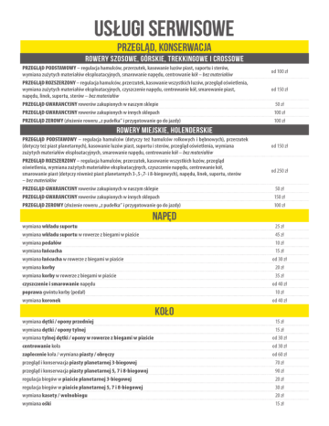 USŁUGI SERWISOWE PRZEGLĄD, KONSERWACJA rowery szosowe, górskie, trekkingowe i crossowe PRZEGLĄD PODSTAWOWY – regulacja hamulców, przerzutek, kasowanie luzów piast, suportu i sterów, wymiana zużytych materiałów eksploatacyjnych, smarowanie napędu, centrowanie kół – bez materiałów PRZEGLĄD ROZSZERZONY – regulacja hamulców, przerzutek, kasowanie wszystkich luzów, przegląd oświetlenia, wymiana zużytych materiałów eksploatacyjnych, czyszczenie napędu, centrowanie kół, smarowanie piast, napędu, linek, suportu, sterów – bez materiałów PRZEGLĄD GWARANCYJNY rowerów zakupionych w naszym sklepie PRZEGLĄD GWARANCYJNY rowerów zakupionych w innych sklepach PRZEGLĄD ZEROWY (złożenie roweru „z pudełka” i przygotowanie go do jazdy) od 100 zł od 150 zł 50 zł 100 zł 100 zł rowery miejskie, holenderskie PRZEGLĄD PODSTAWOWY – regulacja hamulców (dotyczy też hamulców rolkowych i bębnowych), przerzutek (dotyczy też piast planetarnych), kasowanie luzów piast, suportu i sterów, przegląd oświetlenia, wymiana zużytych materiałów eksploatacyjnych, smarowanie napędu, centrowanie kół – bez materiałów PRZEGLĄD ROZSZERZONY – regulacja hamulców, przerzutek, kasowanie wszystkich luzów, przegląd oświetlenia, wymiana zużytych materiałów eksploatacyjnych, czyszczenie napędu, centrowanie kół, smarowanie piast (dotyczy również piast planetarnych 3-,5-,7- i 8-biegowych), napędu, linek, suportu, sterów – bez materiałów PRZEGLĄD GWARANCYJNY rowerów zakupionych w naszym sklepie PRZEGLĄD GWARANCYJNY rowerów zakupionych w innych sklepach PRZEGLĄD ZEROWY (złożenie roweru „z pudełka” i przygotowanie go do jazdy) od 150 zł od 250 zł 50 zł 150 zł 100 zł NAPĘD wymiana wkładu suportu wymiana wkładu suportu w rowerze z biegami w piaście wymiana pedałów wymiana łańcucha wymiana łańcucha w rowerze z biegami w piaście wymiana korby wymiana korby w rowerze z biegami w piaście czyszczenie i smarowanie napędu poprawa gwintu korby (pedał) wymiana koronek 25 zł 45 zł 10 zł 15 zł od 30 zł 20 zł 35 zł od 40 zł 10 zł od 40 zł KOŁO wymiana dętki / opony przedniej wymiana dętki / opony tylnej wymiana tylnej dętki / opony w rowerze z biegami w piaście centrowanie koła zaplecenie koła / wymiana piasty / obręczy przegląd i konserwacja piasty planetarnej 3-biegowej przegląd i konserwacja piasty planetarnej 5, 7 i 8-biegowej regulacja biegów w piaście planetarnej 3-biegowej regulacja biegów w piaście planetarnej 5, 7 i 8-biegowej wymiana kasety / wolnobiegu wymiana ośki 15 zł 15 zł od 30 zł od 30 zł od 60 zł 70 zł 90 zł 20 zł 30 zł 20 zł 15 zł HAMULCE regulacja hamulca wymiana i regulacja klocków hamulcowych wymiana i regulacja pancerzy / linek hamulcowych montaż hamulców wymiana klamki odpowietrzenie hamulca hydraulicznego – bez płynu przegląd i konserwacja hamulca rolkowego (używamy smaru rekomendowanego przez Shimano) 15 zł 20 zł 30 zł od 25 zł od 30 zł 35 zł od 35 zł PRZERZUTKI regulacja przerzutki przedniej / tylnej wymiana i regulacja przerzutki przedniej / tylnej wymiana manetki regulacja biegów w piaście planetarnej 3-biegowej regulacja biegów w piaście planetarnej 5, 7 i 8-biegowej od 15 zł od 20 zł od 20 zł 20 zł 30 zł RAMA wymiana ramy złożenie roweru – na nowych komponentach, w zależności od typu roweru od 150 zł od 130 zł UKŁAD KIEROWNICZY wymiana kierownicy / wspornika wymiana widelca smarowanie sterów wymiana sterów wymiana gripów montaż owijki montaż licznika od 15 zł od 30 zł od 15 zł od 40 zł od 10 zł od 30 zł 15 zł OŚWIETLENIE przegląd oświetlenia na dynamo montaż lampek diodowych od 25 zł 5 zł INNE montaż bagażnika montaż błotników montaż kosza przedniego montaż fotelika dziecięcego montaż nóżki montaż osłony łańcucha 15 zł 10 zł od 15 zł 40 zł 10 zł od 30 zł Koszty części użytych podczas naprawy nie są uwzględnione w cenniku. Przed wykonaniem usługi informujemy Klienta o jej orientacyjnym koszcie. Części poniżej 30zł wymieniamy bez uzgodnienia z klientem. Ceny montażu akcesoriów rowerowych nie dotyczą akcesoriów zakupionych w naszym sklepie. W serwisie używamy tylko profesjonalnych płynów technicznych, smarów i narzędzi rekomendowanych przez producentów komponentów.