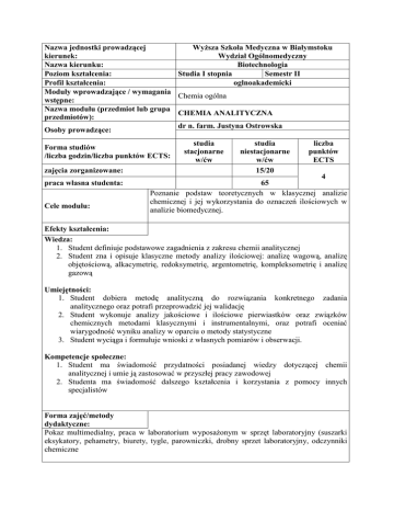 Nazwa jednostki prowadzącej Wyższa Szkoła Medyczna w Białymstoku kierunek: Wydział Ogólnomedyczny Nazwa kierunku: Biotechnologia Poziom kształcenia: Studia I stopnia Semestr II Profil kształcenia: oglnoakademicki Moduły wprowadzające / wymagania Chemia ogólna wstępne: Nazwa modułu (przedmiot lub grupa CHEMIA ANALITYCZNA przedmiotów): dr n. farm. Justyna Ostrowska Osoby prowadzące: Forma studiów /liczba godzin/liczba punktów ECTS: zajęcia zorganizowane: praca własna studenta: Cele modułu: studia stacjonarne w/ćw studia niestacjonarne w/ćw 15/20 liczba punktów ECTS 4 65 Poznanie podstaw teoretycznych w klasycznej analizie chemicznej i jej wykorzystania do oznaczeń ilościowych w analizie biomedycznej. Efekty kształcenia: Wiedza: 1. Student definiuje podstawowe zagadnienia z zakresu chemii analitycznej 2. Student zna i opisuje klasyczne metody analizy ilościowej: analizę wagową, analizę objętościową, alkacymetrię, redoksymetrię, argentometrię, kompleksometrię i analizę gazową Umiejętności: 1. Student dobiera metodę analityczną do rozwiązania konkretnego zadania analitycznego oraz potrafi przeprowadzić jej walidację 2. Student wykonuje analizy jakościowe i ilościowe pierwiastków oraz związków chemicznych metodami klasycznymi i instrumentalnymi, oraz potrafi oceniać wiarygodność wyniku analizy w oparciu o metody statystyczne 3. Student wyciąga i formułuje wnioski z własnych pomiarów i obserwacji. Kompetencje społeczne: 1. Student ma świadomość przydatności posiadanej wiedzy dotyczącej chemii analitycznej i umie ją zastosować w przyszłej pracy zawodowej 2. Studenta ma świadomość dalszego kształcenia i korzystania z pomocy innych specjalistów Forma zajęć/metody dydaktyczne: Pokaz multimedialny, praca w laboratorium wyposażonym w sprzęt laboratoryjny (suszarki eksykatory, pehametry, biurety, tygle, parowniczki, drobny sprzet laboratoryjny, odczynniki chemiczne Forma i warunki zaliczenia przedmiotu w odniesieniu do efektów kształcenia: Wiedza: Egzamin na ocenę w formie pisemnej, poprawne udzielenie odpowiedzi na 60 % zadanych pytań, Zaliczenie na ocenę ćwiczeń w formie wejściówek na ćwiczenia i sprawozdań z przeprowadzonych doświadczeń Umiejętności: poprawne konstruowanie wniosków i zdolność analitycznego myślenia Kompetencje: świadomość dalszego kształcenia i korzystania z pomocy innych specjalistów Treści programowe: Wykłady: studia niestacjonarne 1. Ogólne zagadnienia z analizy chemicznej – etapy procesu analitycznego. Precyzja, dokładność i niepewność pomiarów analitycznych. Źródła i rodzaje błędów w analizie chemicznej. Selektywność i czułość oznaczeń analitycznych - 3h 2. Analiza śladowa. Analiza procesowa. Analiza chemiczna ilościowa: a/ analiza wagowa: osad w analizie wagowej - rozpuszczalność i iloczyn rozpuszczalności, czynniki wpływające na rozpuszczalność osadów, otrzymywanie czystego osadu, postać osadu, odsączanie i przemywanie osadu, suszenie i prażenie osadów – 3h 3. Analiza objętościowa – gazometria i analiza miareczkowa: zasady analizy miareczkowej, klasyfikacja metod miareczkowych - podział wg typu reakcji wg sposobu indykacji punktu zachodzącej podczas miareczkowania, równoważnikowego i wg sposobu przeprowadzenia miareczkowania – 3h 4. Podstawy teoretyczne alkacymetrii – krzywe miareczkowania, wskaźniki; podstawy teoretyczne kompleksometrii - kompleksonometria: kompleksony i ich kompleksy, krzywe miareczkowania, wskaźniki, typy miareczkowań; podstawy teoretyczne miareczkowań strąceniowych - argentometria - krzywe miareczkowania, wskaźniki; podstawy teoretyczne miareczkowań redoksymetrycznych - zmiany potencjału utleniającego w czasie miareczkowania, wskaźniki, szybkość reakcji utlenianiaredukcji (manganometria, jodometria, chromianometria, bromianometria, cerometria) – 3h 5. Zasady walidacja metod analitycznych – 3h Ćwiczenia: studia niestacjonarne Ćwiczenia obejmują klasyczną analizę ilościową związków nieorganicznych. 1. Analiza wagowa. Wstępne zagadnienia z analizy wagowej; przyrządy i naczynia oraz podstawowe czynności w analizie wagowej: a/ wagi analityczne i techniczne, wagosuszarki; wielkości charakteryzujące wagę, zasady prawidłowego ważenia; b/ naczynia miarowe, eksykatory, tygle, naczynka wagowe; c/ rozpuszczalność osadów i iloczyn rozpuszczalności; rodzaje osadów w analizie ilościowej, zasady prawidłowego strącania osadów, sączenie i przemywanie osadów, suszenie i prażenie osadu (przygotowanie tygla, spalanie sączka) – 4h 2. Porównanie sposobu uzyskania stabilnego koloidalnego osadu w wyniku prażenia w płomieniu palnika oraz w piecu muflowym, na przykładzie oznaczania żelaza w postaci tlenku żelaza (III). (zasada oznaczania tlenku żelaza (III) o ściśle określonym składzie chemicznym, wykonanie oznaczenia, obliczenie zawartości żelaza, pojęcie błędu względnego i bezwzględnego); Porównanie różnych technik uzyskiwania stabilnego osadu [suszenia i prażenia] na przykładzie oznaczania zawartości wapnia w postaci tlenku wapnia i ołowiu w postaci chromianu (VI) ołowiu (II) (oznaczanie wapnia: zasady strącania grubokrystalicznego osadu szczawianu wapnia i przeprowadzenie szczawianu w tlenek wapnia podczas prażenia w płomieniu palnika; oznaczanie ołowiu w postaci chromianu (VI) ołowiu (II) i doprowadzenie osadu do stałej masy poprzez suszenie w suszarce laboratoryjnej). Oznaczanie wody higroskopijnej i krystalizacyjnej w hydracie siarczanu miedzi (wykonanie oznaczenia, obliczenie zawartości wody, obliczenie błędu względnego i bezwzględnego). Wagowe oznaczanie związków nieorganicznych w preparatach farmaceutycznych. Analiza miareczkowa – 4h 3. Zagadnienia podstawowe z analizy miareczkowej, pojęcia: roztwór mianowany, substancja podstawowa, punkt równoważnikowy i końcowy miareczkowania, typy miareczkowań (bezpośrednie, pośrednie, odwro