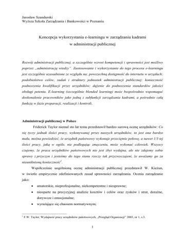 Jarosław Szandurski Wyższa Szkoła Zarządzania i Bankowości w Poznaniu Koncepcja wykorzystania e-learningu w zarządzaniu kadrami w administracji publicznej Rozwój administracji publicznej, a szczególnie wzrost kompetencji i sprawności jest możliwy poprzez „administrację wiedzy”. Zastosowanie i wykorzystanie do tego procesu e-learningu jest szczególnie uzasadnione ze względu na: powszechną dostępność do internetu w urzędach; podobieństwo celów, zadań i struktury jednostek administracji publicznej; konieczność podnoszenia kwalifikacji przez urzędników; dążenie do podnoszenia standardów jakości obsługi petenta. E-learning (szczególnie blended learning) może bezpośrednio wspomagać doskonalenie pracowników jako jedną z subfunkcji zarządzania kadrami, a pośrednio całą funkcję w fazie preparacji, realizacji i kontroli. Administracji publicznej w Polsce Friderick Taylor niemal sto lat temu przedstawił bardzo surową ocenę urzędników: Co się tyczy jednak ilości pracy, wykonywanej przez naszych urzędników, to jest ona bardzo mała, można powiedzieć, że urzędnik państwowy wykonuje przeciętnie połowę, a nawet 1/3 tej ilości pracy, jaką w ogóle, nie podlegając zmęczeniu, może wykonać człowiek. Wszyscy czujemy, że praca urzędników państwowych nie jest zbyt wydajna, ale nie zdajemy sobie sprawy z przyczyn i jesteśmy do tego stanu rzeczy tak przyzwyczajeni, że uważamy go za nieuniknioną konieczność1. Współcześnie uogólnioną ocenę administracji publicznej przedstawił W. Kieżun, w świetle empirycznie zdefiniowanych zasad sprawności zarządzania. Ocenia zarządzanie jako: • amatorskie, nieprofesjonalne, niekompetentne i niesprawne; • nieoparte na precyzyjnej analizie kosztów i celów oraz zysków i strat, doraźne, dorywcze i emocjonalne; • 1 wyrażające się chaosem normatywnym; F.W. Taylor, Wydajność pracy urzędników państwowych, „Przegląd Organizacji” 2003, nr 1, s.3. 1 • słabo nadzorowane i kontrolowane; • charakteryzujące się niedostateczną wyobraźnią strategiczną. Przedstawił on ponadto skutki zarządzania publicznego, które ma cechy opisane powyżej: • upowszechnianie indyferentyzmu moralnego, stymulującego różnorodne formy korupcji i nepotyzmu; • niedostatek instynktu państwowego i akceptacja priorytetu interesu osobistego, partyjnego i środowiskowego nad interesem narodu i społeczności lokalnej; • zachłanność na szybkie, osobiste dorobienie się; • niedostatek upowszechniania spolegliwości2. Wyniki badań, prowadzone przez różne instytucje, m.in. CBOS, Bank Światowy, Fundację im. St. Batorego, NIK, dowodzą postępującej patologii życia publicznego w Polsce. Szczególnie negatywna jest ocena społeczna dotycząca protekcjonizmu i upartyjnienia aparatu urzędniczego oraz wysokiego poziomu korupcji3. W badaniu, dotyczącym oceny społecznej administracji państwowej i samorządowej, przeprowadzonym w województwie mazowieckim oceniono także urzędników. Praca urzędnicza została oceniona na 3,5 (w skali 1-6). Podobnie została oceniona efektywność pracy urzędniczej (3,5), natomiast kulturę oceniono na 3,0. Wyżej oceniono przygotowanie merytoryczne urzędników - 4,5. Jednocześnie około 70% respondentów wyraziło niezadowolenie z powodu nadużywania przez urzędników swojej władzy, dominacji nad osobami występującymi w roli petentów4. Przedstawiony powyżej obraz administracji publicznej prowadzi do jednoznacznego wniosku o potrzebie wprowadzenie działań reformatorskich. Organizacja Współpracy Gospodarczej i Rozwoju (OECD) proponuje dwa kierunki poprawy działalności organizacji publicznych. Po pierwsze: poprawę zarządzania zasobami ludzkimi poprzez rekrutację wykwalifikowanych i uzdolnionych pracowników oraz ich rozwój, uzależnienie płac od osiąganych wyników, włączenie pracowników w większym stopniu w proces decyzyjny i zarządzanie organizacją, łagodzenie kontroli administracyjnej i wprowadzenie ściśle określonych celów działania, poprawę relacji z klientem. Po drugie: większe wykorzystanie sektora prywatnego do stworzenia niezawodnego, skutecznego, 2 W. Kieżun, Kryteria doboru kadr samorządowych, materiały z konferencji: O lepszą jakość kadr w administracji samorządu terytorialnego, Warszawa: Kancelaria Senatu 2003, s. 26. 3 Z. Jankowska, Profil osobowo-zawodowy i zasady doboru urzędnika, materiały z konferencji: O lepszą jakość kadr w administracji samorządu terytorialnego, Warszawa: Kancelaria Senatu 2003, s. 49. 4 W. Stelmach, Oceny społeczne administracji państwowej i samorządów, „Zarządzanie zasobami ludzkimi” 2004, nr 2, s. 93-95. 2 konkurencyjnego i otwartego na kontraktowanie usług systemu zaspokajania potrzeb publicznych, który umożliwia także kontraktowanie wewnętrzne w organizacji5. W większości krajów europejskich model administracji opartej na biurokratycznej racjonalności został zastąpiony przez model menedżerskiego zarządzania publicznego, charakteryzujący się m.in. tym, że administracja jest zorientowana na obywatela, wyodrębniono i oddzielono funkcje strategicznych od operacyjnych, a wykonanie usług publicznych przekazuje się konkurującym ze sobą organizacjom spoza administracji6. Perspektywa reformy i rozwoju administracji publicznej jest uzależniona od zaangażowania władz publicznych (centralnych i samorządowych) oraz samych pracowników zainteresowanych transferem wiedzy i tworzeniem kultury prorozwojowej. Znaczenie zarządzania kadrami w reformie administracji publicznej Sprawność państwa jako organizacji oraz efektywność systemu rządzenia zależą przede wszystkim od jakości zasobów ludzkich, jakimi państwo dysponuje oraz umiejętnego zarządzania nimi. Według Konstytucji RP organizacja demokratycznego państwa ma zapewnić działaniu instytucji publicznych rzetelność i sprawność. Jednym z głównych warunków sprawności administr