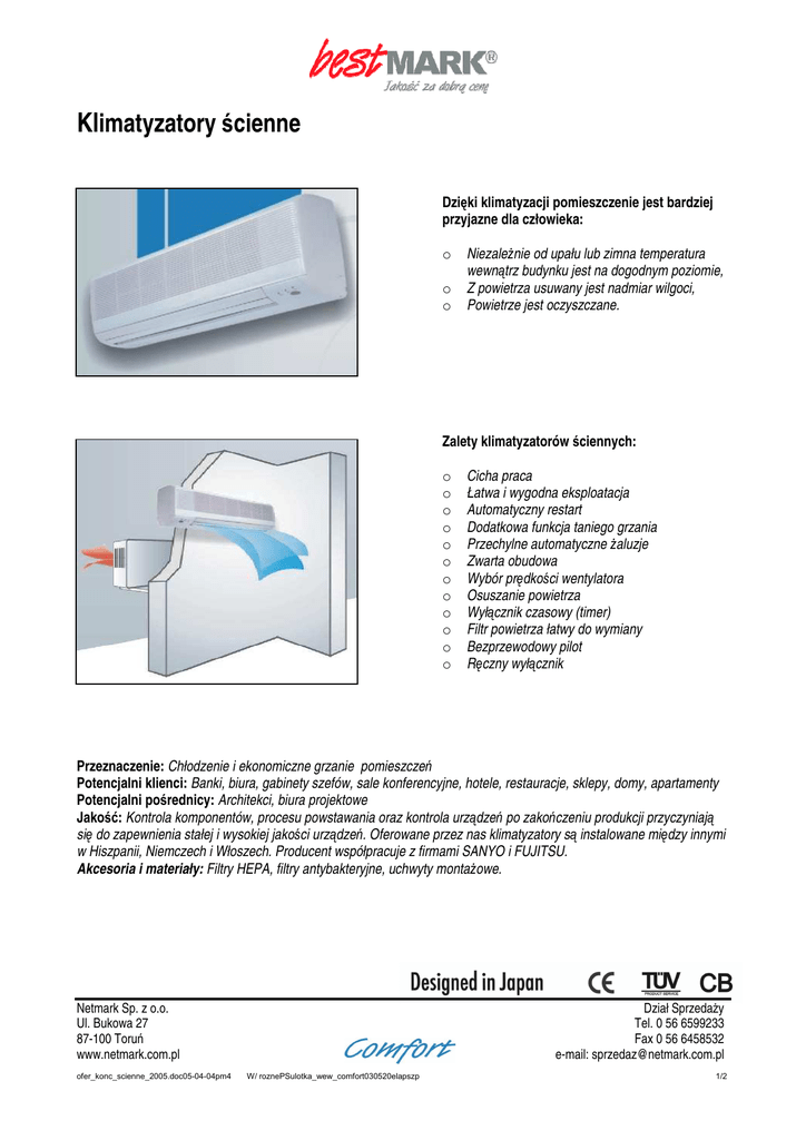 Klimatyzatory ścienne Dzięki klimatyzacji pomieszczenie jest bardziej przyjazne dla człowieka: o o o Niezależnie od upału lub zimna temperatura wewnątrz budynku jest na dogodnym poziomie, Z powietrza usuwany jest nadmiar wilgoci, Powietrze jest oczyszczane. Zalety klimatyzatorów ściennych: o o o o o o o o o o o o Cicha praca Łatwa i wygodna eksploatacja Automatyczny restart Dodatkowa funkcja taniego grzania Przechylne automatyczne żaluzje Zwarta obudowa Wybór prędkości wentylatora Osuszanie powietrza Wyłącznik czasowy (timer) Filtr powietrza łatwy do wymiany Bezprzewodowy pilot Ręczny wyłącznik Przeznaczenie: Chłodzenie i ekonomiczne grzanie pomieszczeń Potencjalni klienci: Banki, biura, gabinety szefów, sale konferencyjne, hotele, restauracje, sklepy, domy, apartamenty Potencjalni pośrednicy: Architekci, biura projektowe Jakość: Kontrola komponentów, procesu powstawania oraz kontrola urządzeń po zakończeniu produkcji przyczyniają się do zapewnienia stałej i wysokiej jakości urządzeń. Oferowane przez nas klimatyzatory są instalowane między innymi w Hiszpanii, Niemczech i Włoszech. Producent współpracuje z firmami SANYO i FUJITSU. Akcesoria i materiały: Filtry HEPA, filtry antybakteryjne, uchwyty montażowe. Netmark Sp. z o.o. Ul. Bukowa 27 87-100 Toruń www.netmark.com.pl ofer_konc_scienne_2005.doc05-04-04pm4 Dział Sprzedaży Tel. 0 56 6599233 Fax 0 56 6458532 e-mail: [email protected] W/ roznePSulotka_wew_comfort030520elapszp 1/2 Oferta dla dealerów z dnia: 05-04-01 Model Marka ważna do: 05-06-30 KFR-25GW/X2 Ba KFR-35GW/X2 Ba KFR-50GW/A2 Ba KFR-60GW/A2 Ba bestMARK bestMARK bestMARK bestMARK Powierzchnia pomieszczenia - około m2 Moc chłodzenia/ grzania Przepływ powietrza Osuszanie Max. poziom hałasu wewn./zewn. Napięcie / Częstotliwość/ Ilość faz Pobór prądu - chłodzenie/ grzanie Pobór mocy - chłodzenie/ grzanie EER Czynnik chłodzący Marka kompresora Średnica przewodów ciecz/gaz Pilot zdalnego sterowania Autorestart Wyłącznik ręczny Wymiary jednostki wewn. Wymiary jednostki zewn. Masa jedn. wewn./zewn. kW m3/h l/h dB(A) V/ Hz A W kW/kW mm Tak/Nie Tak/Nie Tak/Nie mm mm Kg Cena katalogowa netto Upust Upust Upust 12-20 15-28 22-42 32-60 2,5/ 2,78 350 0,95 37/ 51 230/ 50/ 1 4,65/4,6 1020/ 1000 2,5 R407C TOSHIBA 6,35/ 9,52 Tak Tak Tak 810x220x155 610x550x260 8/ 28 3,5/ 3,8 520 1,3 35/ 52 230/ 50/ 1 5,9/ 6,3 1320/ 1420 2,65 R407C TOSHIBA 6,35/ 12 Tak Tak Tak 815x275x183 760x540x256 11/ 38 5/ 5,5 880 2 40/ 58 230/ 50/ 1 8,7/ 8,8 1900/ 1920 2,5 R407C TOSHIBA 6,35/ 12 Tak Tak Tak 1000x320x190 800x690x310 15/ 55 6/ 6,3 880 2 43/ 62 230/ 50/ 1 11,7/ 12,5 2560/ 2750 2,5 R407C TOSHIBA 6,35/16 Tak Tak Tak 1000x320x190 800x690x310 16/ 57 1799 2099 3199 3999 % % Warunki sprzedaży Gwarancja i serwis 36 miesięcy, ok. 60 punktów serwisowych w całej Polsce Zapraszamy do współpracy Do ceny należy doliczyć 22% VAT. Ceny w PLN na warunkach gotówki z wyjątkiem * Płatność odrocz. Ceny dealera, subdystrybutora, hurtowa zawierają upust serwisowy gwarancyjny. Pozostałe szczegóły oferty są zawarte w Cenniku produktów, Warunkach zakupów, Tabeli upustów. Netmark Sp. z o.o. Ul. Bukowa 27 87-100 Toruń www.netmark.com.pl ofer_konc_scienne_2005.doc05-04-04pm4 Dział Sprzedaży Tel. 0 56 6599233 Fax 0 56 6458532 e-mail: [email protected] W/ roznePSulotka_wew_comfort030520elapszp 2/2