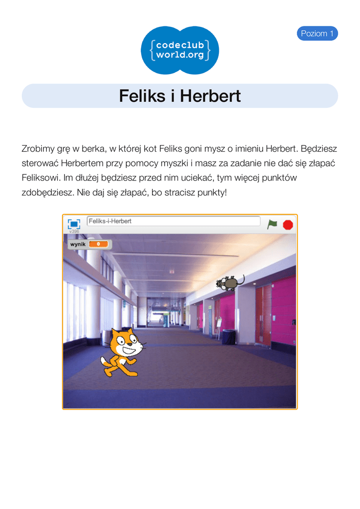 Poziom 1 Feliks i Herbert Zrobimy grę w berka, w której kot Feliks goni mysz o imieniu Herbert. Będziesz sterować Herbertem przy pomocy myszki i masz za zadanie nie dać się złapać Feliksowi. Im dłużej będziesz przed nim uciekać, tym więcej punktów zdobędziesz. Nie daj się złapać, bo stracisz punkty! Stwórz nowy projekt. Kliknij na scenę na lewo od duszka, następnie kliknij zakładkę później kliknij na obrazek Wybierz z bibliotekii Tła , a zaimportuj tło „hall” z kategorii „W pomieszczeniu”. Usuń puste tło z listy. Kliknij na duszka, następnie kliknij na ikonkę „i” w jego lewym górnym rogu. Zmień nazwę duszka na Feliks. Upewnij się, że Feliks obraca się tylko w lewo i prawo, wciskając ten przycisk: Stwórz poniższy skrypt: Kliknij zieloną flagę. Czy Feliks podąża za kursorem myszy? Czy wygląda jakby chodził? Czy porusza się z odpowiednią prędkością? Teraz sprawimy, aby Feliks zaczął gonić Herberta zamiast podążać za kursorem myszy. Stwórz następnego duszka. Kliknij wybierz nowego duszka z bibliotekii wybierz Zwierzęta/Mouse1. Zmień nazwę duszka na Herbert. Przełącz na zakładkę Kostiumy, a następnie kliknij na kostium na środku edytora. Pojawi się prostokąt wokół kostiumu. Przeciągnij róg prostokąta i zmniejsz Herberta tak, aby był mniejszy od Feliksa. Upewnij się, że Herbert obraca się tylko w lewo i prawo. Dodaj poniższy skrypt do Herberta: Wciśnij zieloną flagę. Czy Herbert podąża za kursorem myszy? Czy Feliks goni Herberta? Chcemy, aby Feliks nam powiedział, że złapał Herberta. Zmień skrypt Feliksa na poniższy: Wciśnij zieloną flagę. Czy Feliks mówi, że złapał Herberta? Zamiast wiadomości od Feliksa, że złapał mysz, chcemy, aby Herbert zamienił się w ducha. Zamień skrypt Feliksa na poniższy, aby nadać wiadomość o złapaniu Herberta. Dodaj Herbertowi nowy kostium: zaznacz Herberta, przejdź do zakładki Kostiumy i kliknij wybierz kostium z biblioteki. Wybierz kostium Fikcja/ghost2-a. Zmniejsz nowy kostium klikając na niego w edytorze i przeciągając róg prostokąta, który się pojawi. Zmień nazwy kostiumów Herberta: mysz nazwij „żywy”, a ducha „nieżywy”. Dodaj nowy skrypt do Herberta, który zamienia go w ducha: Wciśnij zieloną flagę. Czy Herbert zamienia się w ducha, gdy zostanie złapany? Czy Feliks wydaje odpowiednie odgłosy w odpowiednich momentach? Czy po złapaniu Feliks nie rusza się odpowiednio długo, aby Herbert mógł od niego uciec? Dodajmy licznik punktów, aby było widać, jak dobrze nam idzie ratowanie Herberta. Zaczniemy od zera i co sekundę będziemy dodawać jeden punkt. Gdy Feliks złapie Herberta, odejmiemy sto punktów. Stwórz zmienną o nazwie „Wynik” dla wszystkich duszków. Aby to zrobić, kliknij na Dane, stwórz zmienną i nazwij ją wynik. Upewnij się, że opcja "Dla wszystkich duszków" jest zaznaczona. Kliknij na Scenę i dodaj oba poniższe skrypty: Wciśnij zieloną flagę. Czy wynik rośnie co sekundę o jeden punkt? Czy ilość punktów spada o 100, kiedy Herbert zostanie złapany? Co się dzieje, kiedy Herbert zostanie złapany zanim wynik wzrośnie do 100? Czy wynik zeruje się przy rozpoczęciu nowej gry? Brawo! To by było na tyle, teraz możesz cieszyć się swoją grą! Nie zapomnij, że możesz podzielić się swoją grą ze swoimi przyjaciółmi i rodziną. Żeby to zrobić, kliknij menu Udostępnij. These projects are for use outside the UK only. More information is available on our website at http://www.codeclub.org.uk/. This coursework is developed in the open on GitHub (https://github.com/CodeClub), come and join us! © 2014 Code Club. This work is licensed under a BY-NC-SA 4.0 International License.