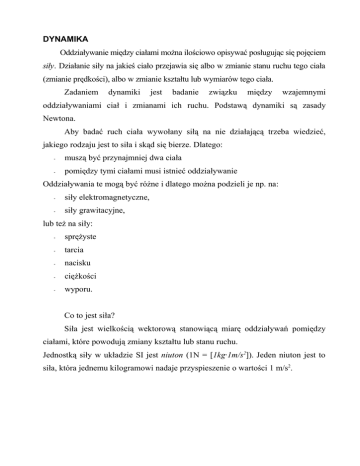 DYNAMIKA Oddziaływanie między ciałami można ilościowo opisywać posługując się pojęciem siły. Działanie siły na jakieś ciało przejawia się albo w zmianie stanu ruchu tego ciała (zmianie prędkości), albo w zmianie kształtu lub wymiarów tego ciała. Zadaniem dynamiki jest badanie związku między wzajemnymi oddziaływaniami ciał i zmianami ich ruchu. Podstawą dynamiki są zasady Newtona. Aby badać ruch ciała wywołany siłą na nie działającą trzeba wiedzieć, jakiego rodzaju jest to siła i skąd się bierze. Dlatego: - muszą być przynajmniej dwa ciała - pomiędzy tymi ciałami musi istnieć oddziaływanie Oddziaływania te mogą być różne i dlatego można podzieli je np. na: - siły elektromagnetyczne, - siły grawitacyjne, lub też na siły: - sprężyste - tarcia - nacisku - ciężkości - wyporu. Co to jest siła? Siła jest wielkością wektorową stanowiącą miarę oddziaływań pomiędzy ciałami, które powodują zmiany kształtu lub stanu ruchu. Jednostką siły w układzie SI jest niuton (1N = [1kg·1m/s2]). Jeden niuton jest to siła, która jednemu kilogramowi nadaje przyspieszenie o wartości 1 m/s2. io Przykłady znanych sił: Rodzaj siły Wzór Oznaczenia Uwag dotyczy ciał siła ciężkości Fg mg m - masa znajdujących się g - przyspieszenie w pobliżu powierzchni grawitacyjne Ziemi, lub innej planety m1, m2 - masy ciał siła grawitacji m m r - odległość między F G 1 3 2 r środkami ciał r dla wszystkich ciał niebieskich G - stała grawitacji siła sprężysta siła tarcia F kx T N k - współczynnik siła jest zawsze proporcjonalności przeciwnie skierowana x – wychylenie do wychylenia N – siła nacisku na jest powierzchnię, współczynnikiem - współczynnik tarcia statycznego lub tarcia dynamicznego g - przyspieszenie siła wyporu Fw gV ziemskie V - objętość ciężar wypartej cieczy - gęstość Siła nacisku Siła nacisku jest jedną z najczęściej spotykanych w naszym codziennym świecie sił i zawsze związana jest z jakąś powierzchnią. Jeśli siła nacisku działa ze strony podłoża na ciało na tym podłożu spoczywające (lub poruszające się) to nazywamy ją siłą reakcji podłoża. 2 io Siła nacisku ma jedną ważną własność: jest prostopadła do powierzchni, na która działa, np. na równi siła reakcji - nacisku działa prostopadle do powierzchni, na jakiej spoczywa. Siła tarcia Jeżeli dwie stykające się powierzchnie przesuwają się względem siebie, to obserwuje się zjawisko tarcia statycznego. Ruch ten wymaga stałego działania siły. W typowych sytuacjach tarcia statycznego stosunek siły tarcia fs do nacisku Fn trących powierzchni jest stały. Jego wartość nazywana jest współczynnikiem tarcia statycznego. s 3 fs . Fn io Współczynnik ten jest bezwymiarową wielkością zależną od własności powierzchni trących. Tarcia statycznego występuje, gdy zaczynamy przesuwać (ruszamy z miejsca) stykające się powierzchnie różnych ciał. W odróżnieniu do niego tarcie kinetyczne zachodzi już podczas ruchu. Ponieważ najczęściej trudniej jest ruszyć ciało z miejsca, to w większości przypadków tarcie statyczne jest większe od dynamicznego. Współczynnik tarcia kinetycznego: k fk Fn nie zależy od prędkości poruszającego się ciała i pola powierzchni stykających się. Co się dzieje z energią kinetyczną obiektów podlegających tarciu? W większości przypadków energia ta zamieniana jest na energię cieplną. Dlatego samoloty poruszające się z dużymi prędkościami bardzo się rozgrzewają, opony (felgi) samochodów, które wróciły z trasy są ciepłe, a tarcie kawałków drewna o siebie jest starą metodą rozniecania ognia. Jeżeli więc w jakimś ruchu pojawia się tarcie, to oznacza, że w ruchu tym energia mechaniczna nie jest zachowana, ponieważ jej część zamienia się na energię wewnętrzną np. ciepło. 4 io Co się stanie, gdy na ciało zaczyna działać niezrównoważona siła? Ciało wówczas zmieni swój stan ruchu - zacznie przyspieszać, zwalniać, ewentualnie zmieniać kierunek ruchu. Ciało nie porusza się ruchem postępowym, gdy suma wektorowa wszystkich sił działających na ciało jest równa zero. Jest to warunek konieczny, ale nie wystarczający. Jeżeli na ciało o masie m działa pojedyncza siła F , to definiujemy ją jako zmianę w czasie pędu ciała: d p , F dt po rozwinięciu d( mv ) d m dv F vm dt dt dt Dla ciała o stałej masie dv Fm ma . dt Pierwsza zasada dynamik Pierwszą zasadę dynamiki można sformułować następująco: 5 io Każde ciało pozostaje w spoczynku lub w ruchu prostoliniowym jednostajnym względem spoczywającego lub poruszającego się ruchem jednostajnym prostoliniowym układu odniesienia, dopóki działanie innych ciał nie zmusi je do zmiany tego stanu Zasada ta wyraża bardzo ważną właściwość ciał polegającą na tym, że każde ciało samorzutnie podtrzymuje swój stan spoczynku lub ruchu prostoliniowego jednostajnego, gdy nie działają na nie inne ciała lub, gdy działanie innych ciał nie powoduje zmiany pierwotnego stanu tego ciała. Właściwość tę nazywamy bezwładnością ciała. Posługując się już wprowadzonym pojęciem siły, można sformułować pierwszą zasadę dynamiki w sposób następujący: Gdy na ciało nie działa żadna siła lub, gdy wypadkowa sił działających na nie jest równa zeru, to ciało to pozostaje w spoczynku lub porusza się ruchem prostoliniowym jednostajnym względem spoczywającego lub poruszającego się ruchem jednostajnym prostoliniowym układu odniesienia. Zasada bezwładności, jak się często nazywa I zasadę dynamiki została odkryta i sformułowana dopiero w pierwszych latach XVII wieku. Pierwsza zasada dynamiki leży u podstaw statyki punktu materialnego. Określa ona, bowiem warunki, przy spełnieniu, których punkty materialne spoczywają. Jeżeli punkt materialny ma spoczywać, to według I zasady dynamiki nie mogą nań działać żadne