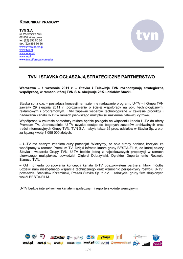 KOMUNIKAT PRASOWY TVN S.A. ul. Wiertnicza 166 02-952 Warszawa tel. (22) 856 60 60 fax. (22) 856 66 66 www.investor.tvn.pl www.tvn.pl www.onet.pl www.n.pl www.tvn.pl/grupatvn/media TVN I STAVKA OGŁASZAJĄ STRATEGICZNE PARTNERSTWO Warszawa – 1 września 2011 r. – Stavka i Telewizja TVN rozpoczynają strategiczną współpracę, w ramach której TVN S.A. obejmuje 25% udziałów Stavki. Stavka sp. z o.o. – posiadacz koncesji na naziemne nadawanie programu U-TV – i Grupa TVN zawarły 29 sierpnia 2011 r. porozumienie o ścisłej współpracy na polu technologicznym, reklamowym i programowym. TVN zapewni wsparcie technologiczne w zakresie produkcji i nadawania kanału U-TV w ramach pierwszego multipleksu naziemnej telewizji cyfrowej. Współpraca w zakresie sprzedaży reklam będzie polegała na włączeniu kanału U-TV do oferty Premium TV. Jednocześnie, U-TV uzyska dostęp do bogatych zasobów archiwalnych oraz treści informacyjnych Grupy TVN. TVN S.A. nabyła także 25 proc. udziałów w Stavka Sp. z o.o. za łączną kwotę 1 095 000 złotych. – U-TV ma naszym zdaniem duży potencjał. Wierzymy, że obie strony odniosą korzyści ze współpracy w ramach Premium TV. Dzięki infrastrukturze grupy BESTA-FILM, do której należy Stavka i wsparciu Grupy TVN, U-TV będzie jedną z najciekawszych propozycji w ramach pierwszego multipleksu, powiedział Olgierd Dobrzyński, Dyrektor Departamentu Rozwoju Biznesu TVN. – Od momentu opracowania koncepcji kanału U-TV poszukiwałem partnera, który mógłby udzielić nam niezbędnego wsparcia technicznego oraz wzmocnić perspektywy rozwoju U-TV, powiedział Stanisław Krzemiński, Prezes Stavka Sp. z o.o. i założyciel grupy firm skupionych wokół BESTA-FILM. U-TV będzie interaktywnym kanałem społecznym i reportersko-interwencyjnym. 1/4 *** BESTA-FILM to grupa firm założonych przez Stanisława Krzemińskiego. Od ponad 20 lat BESTA-FILM, STUDIO-BESTA, BESTA-FILM Sp. z o.o., TELEMARK Sp. z o.o. produkują seriale dokumentalne i fabularne dla stacji telewizyjnych w Polsce, Niemczech, Szwecji i Francji. W roku 1996 założyciel grupy BESTA FILM otrzymał nagrodę FELIXA przyznawaną przez EUROPEJSKĄ AKADEMIĘ FILMOWĄ za wkład w rozwój europejskiego filmu dokumentalnego. Na naszym rynku grupa znana jest z pierwszych w Polsce seriali dokumentalnych typu docu-soap (m. in. serial „CENTRUM NADZIEI dla TVN) oraz takich tytułów jak PLEBANIA czy LONDYŃCZYCY. *** Grupa TVN jest wiodącą prywatną grupą medialną w Polsce. Nadaje dziesięć kanałów telewizyjnych. TVN, główny kanał telewizyjny Grupy, jest na polskim rynku uznawany za czołowy program telewizyjny, oferujący wysokiej jakości programy rozrywkowe oraz rzetelne i niezależne audycje informacyjne. TVN dociera do 91% gospodarstw domowych w Polsce. TVN7 to kanał telewizyjny o profilu filmowo-serialowym, uzupełniający ofertę programową TVN. Kanał dociera do 64% gospodarstw domowych w Polsce. TVN24 jest pierwszym polskim 24-godzinnym informacyjno-publicystycznym kanałem telewizyjnym docierającym do 58% gospodarstw domowych w Polsce. TVN CNBC jest kanałem informacyjnym o tematyce biznesowej, przygotowywanym we współpracy z CNBC Europe. Kanał dociera do 35% gospodarstw domowych w Polsce. TVN Meteo to pierwszy polski kanał telewizyjny o pogodzie, docierający do 55% gospodarstw domowych w Polsce. TVN Turbo jest pierwszym polskim kanałem tematycznym adresowanym do mężczyzn i zarazem pierwszym poświęconym głównie motoryzacji. Kanał dociera do 56% gospodarstw domowych. TVN Style jest kanałem telewizyjnym poświęconym urodzie, stylom życia, modzie oraz zdrowiu adresowanym do kobiet. Dociera do 56% gospodarstw domowych. ITVN jest kanałem telewizyjnym skierowanym do widowni pochodzenia polskiego zamieszkałej za granicą, dostępnym w Europie, Ameryce Północnej i w Australii. Telezakupy Mango to jedyny w Polsce całodobowy kanał telesprzedażowy, docierający do 58% gospodarstw domowych. NTL jest lokalnym kanałem telewizyjnym adresowanym do mieszkańców Radomska i okolic. Do Grupy TVN należy również TVN News & Services Agency, najbardziej wszechstronnie działająca agencja mediowa w Europie Środkowej i Wschodniej, która jako jedyna w regionie oferuje pełną kompleksowość usług. 2/4 Grupa TVN jest też właścicielem Onet.pl, który jest największym i najczęściej odwiedzanym portalem internetowym w Polsce. Onet.pl jest pionierem dywersyfikacji przychodów wśród polskich portali. Poza przychodami marketingowymi (reklama, e-commerce, reklama wyszukiwarkowa) osiąga przychody z usług świadczonych użytkownikom portalu (płatne serwisy treściowe, usługi pocztowe i hostingowe, serwisy aukcyjne, ogłoszeniowe i towarzyskie, usługi telekomunikacyjne). Od 2000 roku Onet.pl jest nieprzerwanie niekwestionowanym liderem na rynku reklamy internetowej. Onet.pl jest także liderem pod względem liczby użytkowników w głównych kategoriach tematycznych: biznes, finanse, prawo; informacje, publicystyka, media; sport; turystyka. Sukces w swoich kategoriach odnoszą również: OnetBlog – największa blogosfera w polskiej sieci. Sympatia.pl – najpopularniejszy w Polsce serwis towarzysko-randkowy. Onet.tv – innowacyjna platforma multimedialna. OnetLajt – specjalna wersja portalu komórkowych i urządzeń mobilnych. dla użytkowników telefonów OnetSkype - polska wersja najpopularniejszego na świecie komunikatora internetowego. Zumi - nowe, niespotykane wcześniej na polskim rynku narzędzie, łączące cechy serwisów mapowych, nawigacyjnych i ogłoszeniowych. vod.onet.pl to najnowszy wspólny projekt Onetu i TVN. Internetowy serwis „wideo na życzenie” umożliwia oglądanie za pomocą przeglądarki internetowej polskich i zagranicznych seriali, programów telewizyjnych oraz pełnometrażowych filmów fabularnych. Do Grupy TVN należy również: tvn24.pl - pierwszy w Polsce wortal informacyjny, który łączy w sobie tekst, dźwięk i o