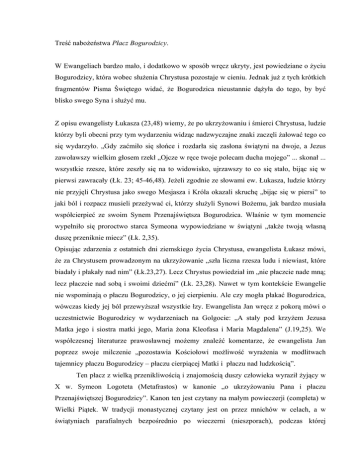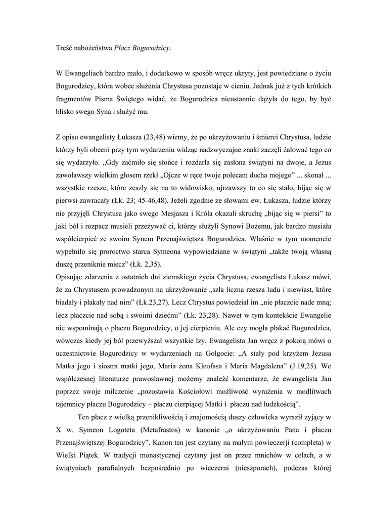 Treść nabożeństwa Płacz Bogurodzicy. W Ewangeliach bardzo mało, i dodatkowo w sposób wręcz ukryty, jest powiedziane o życiu Bogurodzicy, która wobec służenia Chrystusa pozostaje w cieniu. Jednak już z tych krótkich fragmentów Pisma Świętego widać, że Bogurodzica nieustannie dążyła do tego, by być blisko swego Syna i służyć mu. Z opisu ewangelisty Łukasza (23,48) wiemy, że po ukrzyżowaniu i śmierci Chrystusa, ludzie którzy byli obecni przy tym wydarzeniu widząc nadzwyczajne znaki zaczęli żałować tego co się wydarzyło. „Gdy zaćmiło się słońce i rozdarła się zasłona świątyni na dwoje, a Jezus zawoławszy wielkim głosem rzekł „Ojcze w ręce twoje polecam ducha mojego” ... skonał ... wszystkie rzesze, które zeszły się na to widowisko, ujrzawszy to co się stało, bijąc się w pierwsi zawracały (Łk. 23; 45-46,48). Jeżeli zgodnie ze słowami ew. Łukasza, ludzie którzy nie przyjęli Chrystusa jako swego Mesjasza i Króla okazali skruchę „bijąc się w piersi” to jaki ból i rozpacz musieli przeżywać ci, którzy służyli Synowi Bożemu, jak bardzo musiała współcierpieć ze swoim Synem Przenajświętsza Bogurodzica. Właśnie w tym momencie wypełniło się proroctwo starca Symeona wypowiedziane w świątyni „także twoją własną duszę przeniknie miecz” (Łk. 2,35). Opisując zdarzenia z ostatnich dni ziemskiego życia Chrystusa, ewangelista Łukasz mówi, że za Chrystusem prowadzonym na ukrzyżowanie „szła liczna rzesza ludu i niewiast, które biadały i płakały nad nim” (Łk.23,27). Lecz Chrystus powiedział im „nie płaczcie nade mną; lecz płaczcie nad sobą i swoimi dziećmi” (Łk. 23,28). Nawet w tym kontekście Ewangelie nie wspominają o płaczu Bogurodzicy, o jej cierpieniu. Ale czy mogła płakać Bogurodzica, wówczas kiedy jej ból przewyższał wszystkie łzy. Ewangelista Jan wręcz z pokorą mówi o uczestnictwie Bogurodzicy w wydarzeniach na Golgocie: „A stały pod krzyżem Jezusa Matka jego i siostra matki jego, Maria żona Kleofasa i Maria Magdalena” (J.19,25). We współczesnej literaturze prawosławnej możemy znaleźć komentarze, że ewangelista Jan poprzez swoje milczenie „pozostawia Kościołowi możliwość wyrażenia w modlitwach tajemnicy płaczu Bogurodzicy – płaczu cierpiącej Matki i płaczu nad ludzkością”. Ten płacz z wielką przenikliwością i znajomością duszy człowieka wyraził żyjący w X w. Symeon Logoteta (Metafrastos) w kanonie „o ukrzyżowaniu Pana i płaczu Przenajświętszej Bogurodzicy”. Kanon ten jest czytany na małym powieczerji (completa) w Wielki Piątek. W tradycji monastycznej czytany jest on przez mnichów w celach, a w świątyniach parafialnych bezpośrednio po wieczerni (nieszporach), podczas której wyniesiona zostaje na środek świątyni płaszczenica. W tym miejscu należy zaznaczyć, że historia liturgiki zna w tradycji greckiej jeszcze jeden kanon „Płacz Bogurodzicy” autorstwa św. Romana Melodosa, który jednak nie wszedł do użytku liturgicznego. Kanon Symeona Logotety składa się z ośmiu pieśni zawierających łącznie 32 tropariony oraz kontakion z ikosem. Pod względem treści 5 troparionów ma charakter wyraźnie narracyjny. Ukazują one wydarzenia przy Krzyżu i mówią o odczuciach Bogurodzicy. „Dziewica Czysta widząc na Krzyżu Syna i Pana w bólu gorzko wołała” (P.1 tr.1) „Matka, która nie poznała męża, przyjęła Go z płaczem i położyła na swoich kolanach, modląc się ze łzami i całując, błagając gorzko łkała i krzyczała” (P. 5 tr. 2) [ Ikonograficzną ilustracją tego troparionu jest ikony „Położenie do grobu”, „Zdjęcie z krzyża” (Pieta) „Nie płacz po mnie Matko” bardzo charakterystyczne dla greckiej tradycji, ale które również możemy spotkać w niektórych naszych cerkwiach (Cerkiew Męki Pańskiej w Katedrze Metropolitalnej w Warszawie).] Największa ilość troparionów omawianego kanonu (20 z 32) jest westchnieniami i wezwaniami do ukrzyżowanego Zbawiciela. W tych troparionach wyrażona jest nie dająca się opisać słowami nieskończona miłość Bogurodzicy do swego Syna. Porażająca jest moc Bogomacierzyńskiego uczucia ukazana w kanonie. Każdy uważnie słuchający słów żalu Bogurodzicy, jej modlitewnych wezwań, cichego bólu musi dostrzec głębię cierpień Matki Bożej i nierozerwalność jej wewnętrznego życia z życiem Chrystusa. „Widzę Ciebie, ukochane i umiłowane moje Dziecię na krzyżu wiszące i boleję w sercu” (P.1 tr. 2) „Teraz jestem pozbawiona mej radości i wesela, Syna mego i Pana, biada mi, boleje serce moje” (P.1 tr. 4) „Otoczyły mnie boleści troski i westchnienia ... oto widzę Ciebie, Dziecię moje ukochane, nagiego i opuszczonego, zmarłego i wonnościami namaszczonego” (P.5, tr. 4) „Gdy widzę Ciebie martwego, o Miłujący człowieka, który wskrzeszasz umarłych i wszystko trzymasz w swoich dłoniach, zranione jest moje łono, chcę umrzeć z Tobą ... nie zniosę bowiem tego widoku, że ty jesteś martwy i bez tchnienia” (P.6, tr. 1) „Zabierz mnie ze sobą, abym i ja zstąpiła z Tobą Władco do otchłani, ... nie mogę żyć nie widząc Ciebie” (P. 7, tr. 2) „Oto światłość moja i radość moja zstępuje do grobu, nie zostawię go samego, umrę tutaj i zostanę z nim pogrzebana” (P.9, tr. 1) Do bólu i płaczu Bogurodzicy w kanonie dołącza się Józef z Arymatei, którego Bogurodzica „płacząc prosi „Idź Józefie do Piłata i poproś aby zdjęto z krzyża twojego nauczyciela” (P.4, tr. 2). Józef wykonując prośbę „z płaczem prosi Piłata „daj mi ciało mojego Boga” (P.4, tr.3). Obok Józefa w kanonie występuje również Nikodem, którzy wspólnie składają ciało do grobu „łkając, płacząc i opiewając Go jak Boga” (P.5, tr.1). Płacząca i cierpiąca Bogurodzica wzywa niewiasty niosące wonności, możemy powiedzieć, że również wszystkich chrze