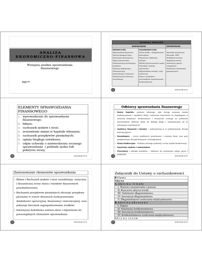 MATERIAŁY ŹRÓDŁOWE WEWNĘTRZNE ANALIZA EKONOMICZNO-FINANSOWA Wstępna analiza sprawozdania finansowego ZEWNĘTRZNE: EWIDENCYJNE: POZAEWIDENCYJNE: •Sprawozdania finansowe; •Plany krótko- i długookresowe, •Roczniki statystyczne; •System księgowy firmy; biznesplany; •Roczniki GPW; •Statystyka ekonomiczna; •Kosztorysy, kalkulacje •Publikacje fachowe; •Spisy inwentarzowe; wstępne; •Regulacje prawne; •Dokumentacja produkcyjna, •Wynik dotychczasowych analiz; •Informacje agencji handlowa; •Protokoły i wnioski ratingowych; •Systemy kalkulacyjne; pokontrolne; •Informacje wywiadowni •Dokumentacja •Sprawozdania zarządu i rady gospodarczych konstrukcyjno-techniczna; nadzorczej; •Dokumentacja dotyczącą •Dane z wywiadów z zatrudnienia; pracownikami, kontrahentami, Slajd 49 kredytodawcami 2 Odbiorcy sprawozdania finansowego ELEMENTY SPRAWOZDANIA FINANSOWEGO Dawcy 3. 4. 5. 6. 7. własnego, jaki obcego ponoszą ryzyko 2016-04-28 10:10 sprawozdania zdolność firmy do obsługi długu i wywiązywania się ze zobowiązań odsetkowych Analitycy finansowi i doradcy – wykorzystują je w podejmowaniu decyzji inwestycyjnych Zarządzający – ocena możliwości przetrwania i rozwoju firmy oraz przy podejmowaniu decyzji bieżących i strategicznych Firmy konkrecyjne – budowa strategii rynkowej i ocena ryzyka konkurencji, Instytucje rządowe i samorządowe, Pracownicy i związki zawodowe – zdolność do utrzymanie miejsc pracy i 4 Zastosowanie elementów sprawozdania 2016-04-28 10:10 Załącznik do Ustawy o rachunkowości i dynamiczną ocenę stanu i wyników finansowych przedsiębiorstwa; Rachunek przepływów pieniężnych obrazuje przepływy pieniężne w trzech obszarach funkcjonowania: działalności operacyjnej, finansowej i inwestycyjnej, oraz pokazuje kierunek zagospodarowania środków; Informacja dodatkowa zawiera dane i objaśnienia do poszczególnych elementów sprawozdania 2016-04-28 10:10 podwyżek. Bilans Aktywa A. A k t y w a t r w a ł e I. Wartości niematerialne i prawne II. Rzeczowe aktywa trwałe III. Należności długoterminowe IV. Inwestycje długoterminowe V. Długoterminowe rozliczenia międzyokresowe B. A k t y w a o b r o t o w e I. Zapasy II. Należności krótkoterminowe III. Inwestycje krótkoterminowe IV. Krótkoterminowe rozliczenia międzyokresowe Aktyw a r a ze m Bilans i Rachunek zysków i strat umożliwiają: statyczną 5 zarówno ostatniej kolejności, kredytodawcy i wierzyciele oceniają na podstawie finansowego; bilans; rachunek zysków i strat; zestawienie zmian w kapitale własnym; rachunek przepływów pieniężnych; opinia biegłego rewidenta; odpis uchwały o zatwierdzeniu rocznego sprawozdania i podziale zysku lub pokryciu straty 3 kapitału, funkcjonowania i upadłości firmy; roszczenia inwestorów są zaspakajane w 1. wprowadzenie do sprawozdania 2. 2016-04-28 10:10 6 2016-04-28 10:10 Bilans Pasywa A. K a p i t a ł (f u n d u s z) w ł a s n y I. Kapitał (fundusz) podstawowy II. Należne wpłaty na kapitał podstawowy (wielkość ujemna) III. Udziały (akcje) własne (wielkość ujemna) IV. Kapitał (fundusz) zapasowy V. Kapitał (fundusz) z aktualizacji wyceny VI. Pozostałe kapitały (fundusze) rezerwowe VII. Zysk (strata) z lat ubiegłych VIII. Zysk (strata) netto IX. Odpisy z zysku netto w ciągu roku obrotowego (wielkość ujemna) B. Z o b o w i ą z a n i a i r e z e r w y n a z o b o w i ą z a n i a I. Rezerwy na zobowiązania II. Zobowiązania długoterminowe III. Zobowiązania krótkoterminowe IV. Rozliczenia międzyokresowe Pasywa razem Układ bilansu slajd 27;Wskaźniki wyposażenie przedsiębiorstwa w kapitały własne ... 7 2016-04-28 10:10 Jako podstawowy element sprawozdania stanowi zestawienie składników majątkowych i źródeł ich sfinansowania Prezentuje statyczny obraz posiadanych lub kontrolowanych przez jednostkę zasobów majątkowych, które w wyniku przyszłych zdarzeń przyczynią się do powstania korzyści ekonomicznych (związane ze zużyciem w procesie wytwórczym, z możliwością zamiany na środki pieniężne, z obniżeniem kosztów działalności) Sporządzany na dany moment (tzw. moment bilansowy) 8 Bilans 2016-04-28 10:10 ETAPY ANALIZY BILANSU W bilansie nie wykazuje się strumieni wartości, jakie towarzyszą WSTĘPNA ANALIZA BILANSU: prowadzeniu działalności gospodarczej (przychody, koszty, wyniki), ale skutki tych procesów, co ma odzwierciedlenie Analiza pozioma: badanie dynamiki sumy bilansowej oraz w zmianach wartości aktywów i pasywów. ważniejszych pozycji aktywów i pasywów. Wykorzystywane Składniki majątkowe są ujmowane w wartościach netto (po mierniki uwzględnieniu ich dotychczasowego umorzenia) Składniki majątku są uszeregowane tempo zmiany i rozwoju podmiotu i stopień wzrostu kapitałów finansujących ten proces. Różne tempo zmian składników aktywów i Składniki pasywów są uporządkowane wg zasady wzrastającej pasywów bilansu determinuje zmiany w strukturze majątku i (pilności zwrotu) – kapitał własny, zobowiązania źródeł jego finansowania. długoterminowe i zobowiązania krótkoterminowe 9 2016-04-28 10:10 10 ETAPY ANALIZY BILANSU 2016-04-28 10:10 Analiza Analiza pionowa: badanie struktury aktywów i pasywów oraz pionowa: badanie struktury aktywów i pasywów oraz wewnętrznej struktury wybranych pozycji wewnętrznej struktury wybranych pozycji bilansu Analiza pionowo – pozioma: badanie struktury kapitałowomajątkowej bilansu. Struktura odnośnie sytuacji aktywów rozwinięcie analizy bilansu dostarcza informacji finansowej podmiotu. Struktura - informacje o sposobie zaangażowania kapitałów w przedsiębiorstwie, a struktura pasywów – o wstępnej, oparta na badaniu wzajemny relacji zachodzących źródłach ich pochodzenia. W analizie pionowej stosuje pomiędzy poszczególnymi elementami pasywów i aktywów. się wskaźniki wyposażenia przedsiębiorstwa w środki Pogłębiona analiza powinna również obejmowa