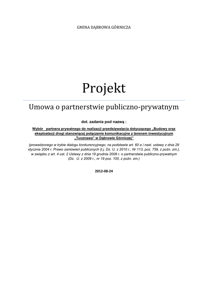 GMINA DĄBROWA GÓRNICZA Projekt Umowa o partnerstwie publiczno-prywatnym dot. zadania pod nazwą : Wybór partnera prywatnego do realizacji przedsięwzięcia dotyczącego „Budowy oraz eksploatacji drogi stanowiącej połączenie komunikacyjne z terenem inwestycyjnym „Tucznawa” w Dąbrowie Górniczej” (prowadzonego w trybie dialogu konkurencyjnego, na podstawie art. 60 a i nast. ustawy z dnia 29 stycznia 2004 r. Prawo zamówień publicznych (t.j. Dz. U. z 2010 r., Nr 113, poz. 759, z poźn. zm.), w związku z art. 4 ust. 2 Ustawy z dnia 19 grudnia 2008 r. o partnerstwie publiczno-prywatnym (Dz. U. z 2009 r., nr 19 poz. 100, z poźn. zm.) 2012-08-24 Projekt umowy Spis treści § 1. Przedsięwzięcie…………………………….…………………………………………………….2 § 2. Droga………………………….………………………………………………………..…………2 § 3. Obowiązki i uprawnienia Podmiotu Publicznego…………….……………………………….3 § 4. Użyczenie Pasa Drogowego………………………………………...………………………….4 § 5. Obowiązki i uprawnienia Partnera Prywatnego……………………………………………....5 § 6. Obowiązywanie umowy………………………………………………………………………… 6 § 7. Budowa Drogi………………………………………………………………….………………... 7 § 8. Dokumentacja Techniczna……………………………………...……..………………………. 8 § 9. Zezwolenia………………………………………………………………………………………..9 § 10. Wykonanie Robót Budowlanych……………………………………….……………………..9 § 11. Otwarcie Drogi…………………………………………………………………………………13 § 12. Eksploatacja Drogi………………………………………………………..…………………..13 § 13. Wynagrodzenie……………………………………………………………………..………...16 § 14. Płatności……………………………………………………………………….……..………..17 § 15. Prawo kontroli i dostępu do Pasa Drogowego………………………………...……...…...19 § 16. Zobowiązania sprawozdawcze……………………………………………………………...20 § 17. Ubezpieczenia…………………………………………………………..…………………….20 § 18. Wygaśnięcie umowy…………………………………………………………..……………...21 § 19. Zwrot Drogi………………………………………………………………………….…………22 § 20. Skutki wygaśnięcia umowy…………………………………………………………..………23 § 21. Poufność……………………………………………………………………………………….26 § 22. Prawo własności intelektualnej……………………………………………………………...27 § 23. Cesja/Zastaw/Zbycie przez Partnera Prywatnego………………………………………...28 § 24. Siła Wyższa…………………………………………………………………………………....28 § 25. Dobre Praktyki Branżowe…………………………………………………………………....29 § 26. Zmiany umowy……………………………………………………………………….………..29 § 27. Spory………………………………………………………………………………….……..…30 § 28. Powiadomienia………………………………………………………………………...………31 § 29. Egzemplarze…………………………………………………………………………..………32 § 30. Prawo właściwe i klauzula prorogacyjna…………………………………………….……. 32 1 UMOWA O PARTNERSTWIE PUBLICZNO – PRYWATNYM zawarta w dniu [●] r., zwana dalej „Umową”, POMIĘDZY: Gminą Dąbrowa Górnicza (dalej zwaną „Podmiotem Publicznym”) reprezentowaną przez Prezydenta Miasta Dąbrowa Górnicza Zbigniewa Podrazę [●] oraz I Z-cę Prezydenta Miasta Henryka Zagułę [●]; a [●] (dalej zwanym „Partnerem Prywatnym”) z siedzibą w [●], zarejestrowanym w Rejestrze Przedsiębiorców Krajowego Rejestru Sądowego prowadzonego przez Sąd Rejonowy w [●] Wydział Gospodarczy pod numerem [●], NIP [●], REGON [●], mającym kapitał zakładowy w wysokości [●][●] złotych, opłacony w [●] %, reprezentowanym przez [●] i [●], należycie umocowanych. Podmiot Publiczny i Partner Prywatny określani będą także w niniejszej Umowie indywidualnie jako „Strona”, zaś łącznie jako „Strony”. Niniejsza Umowa została zawarta w wyniku postępowania wszczętego w dniu 26 stycznia 2012 r. (publikacja ogłoszenia w Dzienniku Urzędowym Unii Europejskiej Nr 2012/S [●] w dniu [●] 2012 r.) i przeprowadzonego przez Podmiot Publiczny w celu dokonania wyboru najkorzystniejszej oferty oraz wyboru Partnera Prywatnego do realizacji przedmiotowej inwestycji zgodnie z Ustawą z dnia 19 grudnia 2008 r. o partnerstwie publiczno-prywatnym (Dz. U. Nr 19, poz. 100 z 2009 r. ze zm.), a także zgodnie z innymi obowiązującymi przepisami. § 1. Przedsięwzięcie Niniejsza umowa dotyczy przedsięwzięcia pn. „Budowa oraz eksploatacja drogi stanowiącej połączenie komunikacyjne z terenem inwestycyjnym „Tucznawa” w Dąbrowie Górniczej”. Podmiot Publiczny i Partner Prywatny podejmują się współpracy przy realizacji przedsięwzięcia w formie partnerstwa publiczno - prywatnego, polegającego na zapewnieniu przejezdności drogi stanowiącej połączenie komunikacyjne z terenem inwestycyjnym „Tucz