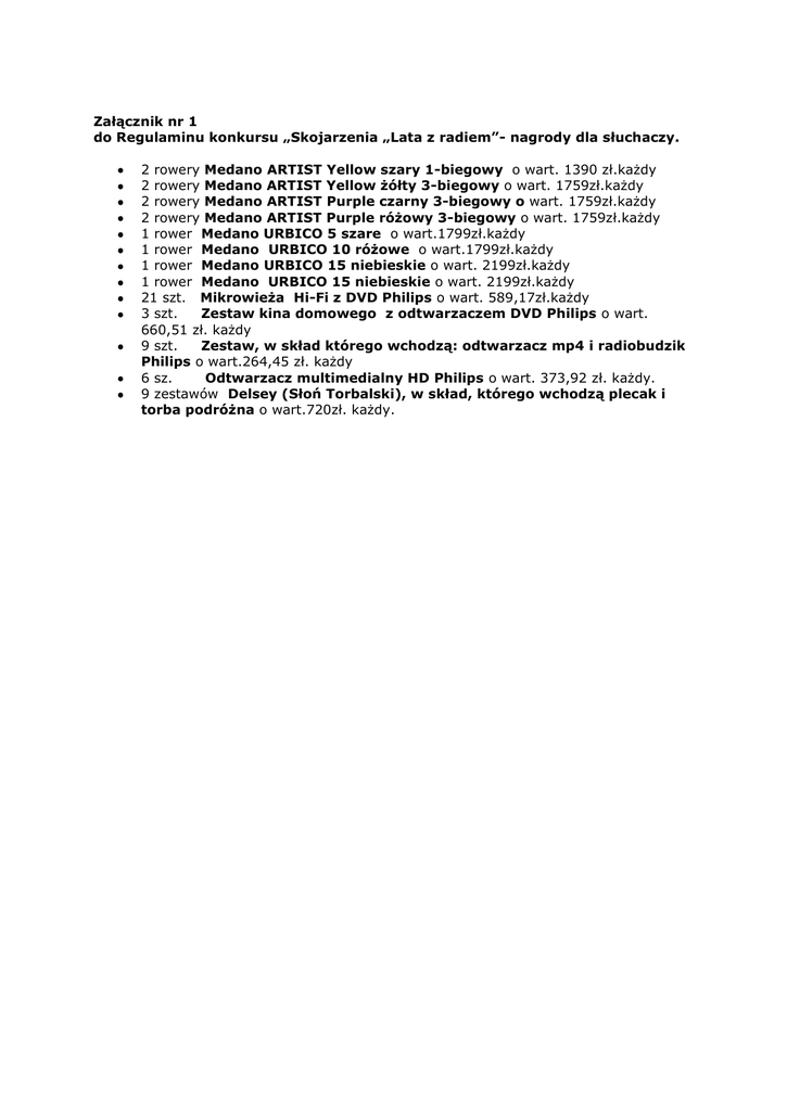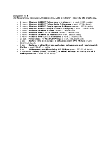 Załącznik nr 1 do Regulaminu konkursu „Skojarzenia „Lata z radiem”- nagrody dla słuchaczy. 2 rowery Medano ARTIST Yellow szary 1-biegowy o wart. 1390 zł.każdy 2 rowery Medano ARTIST Yellow żółty 3-biegowy o wart. 1759zł.każdy 2 rowery Medano ARTIST Purple czarny 3-biegowy o wart. 1759zł.każdy 2 rowery Medano ARTIST Purple różowy 3-biegowy o wart. 1759zł.każdy 1 rower Medano URBICO 5 szare o wart.1799zł.każdy 1 rower Medano URBICO 10 różowe o wart.1799zł.każdy 1 rower Medano URBICO 15 niebieskie o wart. 2199zł.każdy 1 rower Medano URBICO 15 niebieskie o wart. 2199zł.każdy 21 szt. Mikrowieża Hi-Fi z DVD Philips o wart. 589,17zł.każdy 3 szt. Zestaw kina domowego z odtwarzaczem DVD Philips o wart. 660,51 zł. każdy 9 szt. Zestaw, w skład którego wchodzą: odtwarzacz mp4 i radiobudzik Philips o wart.264,45 zł. każdy 6 sz. Odtwarzacz multimedialny HD Philips o wart. 373,92 zł. każdy. 9 zestawów Delsey (Słoń Torbalski), w skład, którego wchodzą plecak i torba podróżna o wart.720zł. każdy.