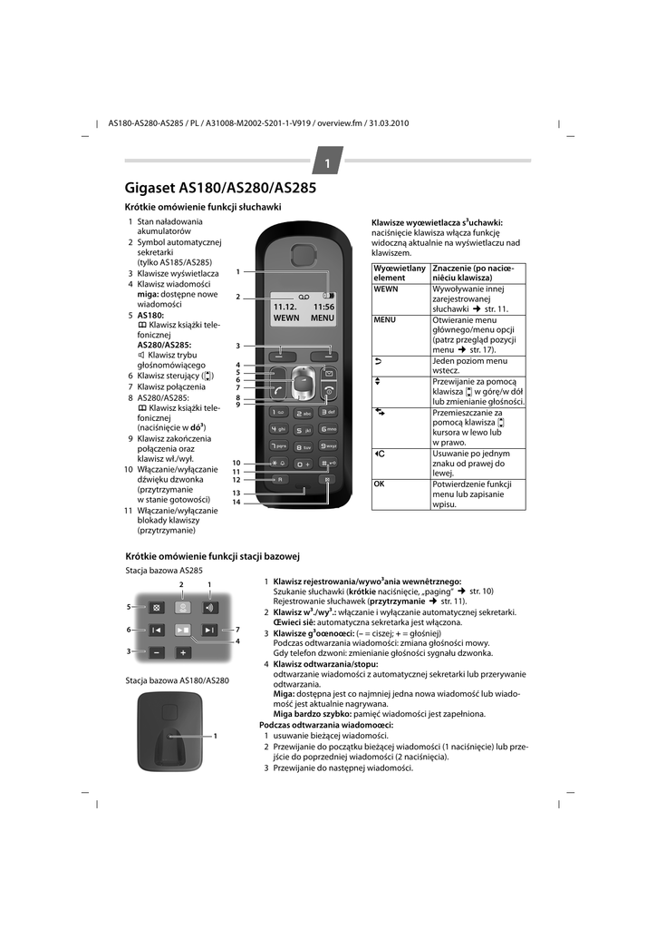 AS180-AS280-AS285 / PL / A31008-M2002-S201-1-V919 / overview.fm / 31.03.2010 1 Gigaset AS180/AS280/AS285 Krótkie omówienie funkcji słuchawki 1 Stan naładowania akumulatorów 2 Symbol automatycznej sekretarki (tylko AS185/AS285) 3 Klawisze wyświetlacza 4 Klawisz wiadomości miga: dostępne nowe wiadomości 5 AS180: h Klawisz książki telefonicznej AS280/AS285: d Klawisz trybu głośnomówiącego 6 Klawisz sterujący (u) 7 Klawisz połączenia 8 AS280/AS285: h Klawisz książki telefonicznej (naciśnięcie w dó3) 9 Klawisz zakończenia połączenia oraz klawisz wł./wył. 10 Włączanie/wyłączanie dźwięku dzwonka (przytrzymanie w stanie gotowości) 11 Włączanie/wyłączanie blokady klawiszy (przytrzymanie) Klawisze wyœwietlacza s3uchawki: naciśnięcie klawisza włącza funkcję widoczną aktualnie na wyświetlaczu nad klawiszem. 1 2 ± 11.12. WEWN V 11:56 MENU Wyœwietlany Znaczenie (po naciœelement niêciu klawisza) WEWN Wywoływanie innej zarejestrowanej str. 11. słuchawki MENU Otwieranie menu głównego/menu opcji (patrz przegląd pozycji str. 17). menu “ Jeden poziom menu wstecz. U Przewijanie za pomocą klawisza u w górę/w dół lub zmienianie głośności. T Przemieszczanie za pomocą klawisza u kursora w lewo lub w prawo. ˜ Usuwanie po jednym znaku od prawej do lewej. OK Potwierdzenie funkcji menu lub zapisanie wpisu. ¢ ¢ 3 4 5 6 7 8 9 10 11 12 13 14 Krótkie omówienie funkcji stacji bazowej Stacja bazowa AS285 2 1 ¢ 5 6 7 4 3 Stacja bazowa AS180/AS280 1 ¢ 1 Klawisz rejestrowania/wywo3ania wewnêtrznego: str. 10) Szukanie słuchawki (krótkie naciśnięcie, „paging” str. 11). Rejestrowanie słuchawek (przytrzymanie 2 Klawisz w3./wy3.: włączanie i wyłączanie automatycznej sekretarki. Œwieci siê: automatyczna sekretarka jest włączona. 3 Klawisze g3oœnoœci: (– = ciszej; + = głośniej) Podczas odtwarzania wiadomości: zmiana głośności mowy. Gdy telefon dzwoni: zmienianie głośności sygnału dzwonka. 4 Klawisz odtwarzania/stopu: odtwarzanie wiadomości z automatycznej sekretarki lub przerywanie odtwarzania. Miga: dostępna jest co najmniej jedna nowa wiadomość lub wiadomość jest aktualnie nagrywana. Miga bardzo szybko: pamięć wiadomości jest zapełniona. Podczas odtwarzania wiadomoœci: 1 usuwanie bieżącej wiadomości. 2 Przewijanie do początku bieżącej wiadomości (1 naciśnięcie) lub przejście do poprzedniej wiadomości (2 naciśnięcia). 3 Przewijanie do następnej wiadomości. AS180-AS280-AS285 / PL / A31008-M2002-S201-1-V919 / overview.fm / 31.03.2010 2 Wskazówki dotyczące bezpieczeństwa Przed użyciem aparatu należy dokładnie przeczytać instrukcję obsługi oraz wskazówki dotyczące bezpieczeństwa. Z informacjami tymi należy zapoznać również dzieci. $ Należy używać wyłącznie dostarczonego zasilacza. Należy używać tylko zalecanych akumulatorów. Oznacza to, że nie należy używać akumulatorów innego typu lub jednorazowych baterii, ponieważ nie można wtedy wykluczyć zagrożenia dla str. 13). bezpieczeństwa lub zdrowia ( System telefoniczny może zakłócać pracę urządzeń medycznych. Należy przestrzegać ograniczeń technicznych związanych z danym środowiskiem pracy (np. w gabinecie lekarskim). Nie należy odwracać słuchawki tylną stroną do ucha, gdy telefon dzwoni. Może to doprowadzić do poważnych, trwałych uszkodzeń słuchu. Słuchawka może powodować nieprzyjemny szum w aparatach słuchowych. Telefonu nie należy ustawiać w łazience ani w pobliżu prysznica. Ani słuchawka, ani baza nie są wodoszczelne. ¢ Nie należy używać telefonu w środowiskach, w których zachodzi ryzyko wybuchu, np. w lakierniach. ƒ Aparat telefoniczny Gigaset należy przekazywać osobom trzecim tylko wraz z instrukcją obsługi. Uszkodzone stacje bazowe należy wycofać z eksploatacji lub naprawić w naszym serwisie, aby uniknąć generowania ewentualnych zakłóceń radiowych. Utylizacja Akumulatorów nie wolno wyrzucać do śmietnika. Należy je utylizować zgodnie z miejscowymi przepisami dotyczącymi likwidacji odpadów. Odpowiednie informacje można uzyskać w urzędzie gminy lub u sprzedawcy, u którego nabyto produkt. Wszelkie urządzenia elektryczne i elektroniczne należy utylizować w wyznaczonych przepisami punktach. Nie wolno ich wyrzucać z odpadkami. Produkty oznaczone symbolem przekreślonego kosza podlegają Dyrektywie Europejskiej 2002/96/ EC. Prawidłowa utylizacja i oddzielna zbiórka zużytych urządzeń obniżają szkodliwość tych odpadów dla zdrowia i i środowiska. Jest to niezbędne do ponownego wykorzystania i recyklingu zużytych urządzeń elektrycznych i elektronicznych. Szczegółowe informacje na temat utylizacji zużytych urządzeń można uzyskać w urzędzie gminy, zakładzie oczyszczania lub u sprzedawcy, u którego nabyto produkt. ¢ W przypadku ustawionej blokady klawiszy ( str. 1) wybieranie numerów alarmowych jest niemożliwe. Niektóre z funkcji opisanych w niniejszej instrukcji obsługi są niedostępne w niektórych krajach. Konserwacja Stację bazową, ładowarkę i słuchawkę należy czyścić czystą wilgotn1 szmatką lub ściereczką antystatyczną (nie używać środków czyszczących). Nigdy nie należy używać suchej szmatki. Stwarza to niebezpieczeństwo gromadzenia się ładunku statycznego. Kontakt z cieczami ! W przypadku kontaktu słuchawki z cieczą należy: 1 Wy31czyæ natychmiast s3uchawkê i wyj1æ z niej akumulatory. 2 Umożliwić wypłynięcie cieczy ze słuchawki. 3 Wytrzeć do sucha wszystkie elementy i umieścić słuchawkę na co najmniej 72 godziny z otwartą wnęką akumulatorów i klawiaturą skierowaną ku dołowi w suchym, ciepłym miejscu (nie w: kuchence mikrofalowej, piekarniku itp.). 4 S3uchawkê nale¿y w31czyæ dopiero po jej ca3kowitym wyschniêciu. Po całkowitym wyschnięciu na ogół urządzenia można znowu używać. Tryb ECO DECT Telefon Gigaset AS180/AS280/AS285 jest przyjazny dla środowiska. Zmniejszenie zuż