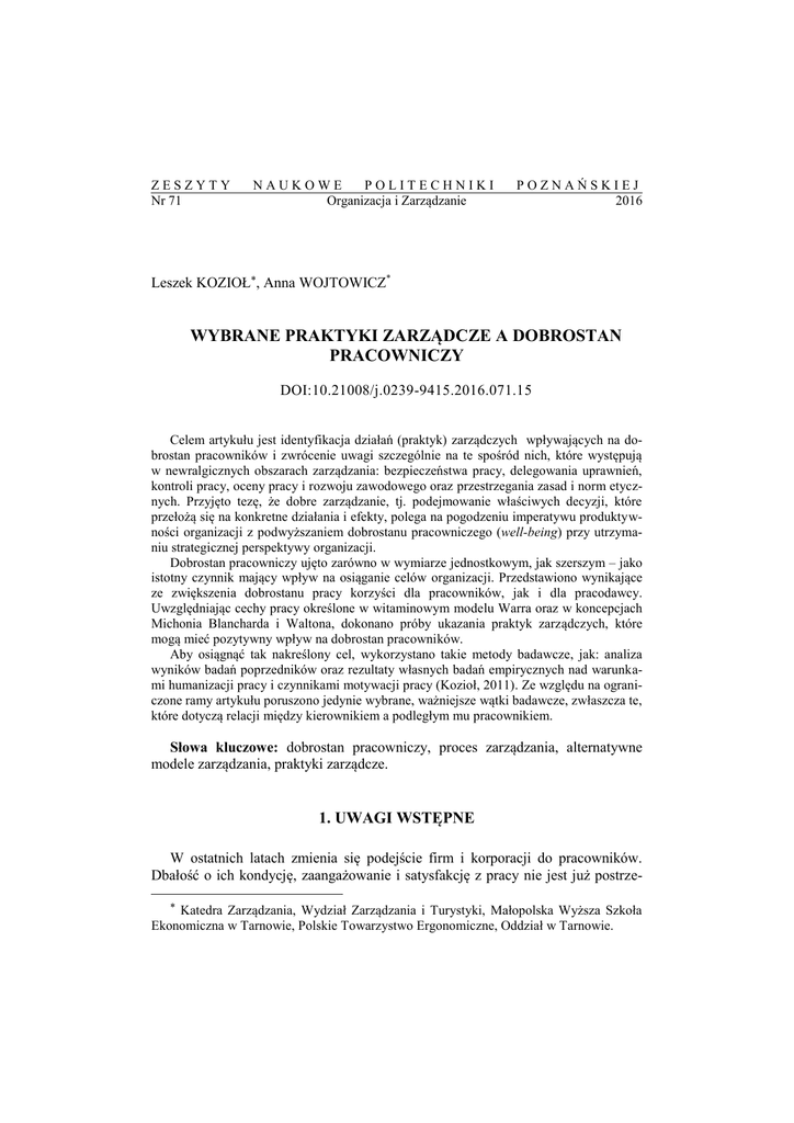 ZESZYTY Nr 71 NAUKOWE POLITECHNIKI Organizacja i Zarządzanie POZNAŃSKIEJ 2016 Leszek KOZIOŁ*, Anna WOJTOWICZ* WYBRANE PRAKTYKI ZARZĄDCZE A DOBROSTAN PRACOWNICZY DOI:10.21008/j.0239-9415.2016.071.15 Celem artykułu jest identyfikacja działań (praktyk) zarządczych wpływających na dobrostan pracowników i zwrócenie uwagi szczególnie na te spośród nich, które występują w newralgicznych obszarach zarządzania: bezpieczeństwa pracy, delegowania uprawnień, kontroli pracy, oceny pracy i rozwoju zawodowego oraz przestrzegania zasad i norm etycznych. Przyjęto tezę, że dobre zarządzanie, tj. podejmowanie właściwych decyzji, które przełożą się na konkretne działania i efekty, polega na pogodzeniu imperatywu produktywności organizacji z podwyższaniem dobrostanu pracowniczego (well-being) przy utrzymaniu strategicznej perspektywy organizacji. Dobrostan pracowniczy ujęto zarówno w wymiarze jednostkowym, jak szerszym – jako istotny czynnik mający wpływ na osiąganie celów organizacji. Przedstawiono wynikające ze zwiększenia dobrostanu pracy korzyści dla pracowników, jak i dla pracodawcy. Uwzględniając cechy pracy określone w witaminowym modelu Warra oraz w koncepcjach Michonia Blancharda i Waltona, dokonano próby ukazania praktyk zarządczych, które mogą mieć pozytywny wpływ na dobrostan pracowników. Aby osiągnąć tak nakreślony cel, wykorzystano takie metody badawcze, jak: analiza wyników badań poprzedników oraz rezultaty własnych badań empirycznych nad warunkami humanizacji pracy i czynnikami motywacji pracy (Kozioł, 2011). Ze względu na ograniczone ramy artykułu poruszono jedynie wybrane, ważniejsze wątki badawcze, zwłaszcza te, które dotyczą relacji między kierownikiem a podległym mu pracownikiem. Słowa kluczowe: dobrostan pracowniczy, proces zarządzania, alternatywne modele zarządzania, praktyki zarządcze. 1. UWAGI WSTĘPNE W ostatnich latach zmienia się podejście firm i korporacji do pracowników. Dbałość o ich kondycję, zaangażowanie i satysfakcję z pracy nie jest już postrzeKatedra Zarządzania, Wydział Zarządzania i Turystyki, Małopolska Wyższa Szkoła Ekonomiczna w Tarnowie, Polskie Towarzystwo Ergonomiczne, Oddział w Tarnowie. * 166 Leszek Kozioł, Anna Wojtowicz gana jako obowiązek, ale jako szansa. Działania te przyczyniają się do zwiększania produktywności i skuteczności organizacji oraz pozytywnie wpływają na wizerunek firmy. W tym kontekście nie dziwi wzrastające wśród praktyków i teoretyków zarządzania zainteresowanie zadowoleniem pracowników w sytuacji pracy, bądź też jego brakiem. Takie spojrzenie nie jest całkiem nowe – już w 1984 r. Drucker, nawiązując do koncepcji społecznej odpowiedzialności przedsiębiorstwa, zauważył, że „właściwą społeczną odpowiedzialnością w przypadku biznesu jest „przemieniać społeczne problemy w ekonomiczne szanse i ekonomiczne korzyści” (Drucker, 1984, s. 62). Porter i Kramer rozwinęli przedstawioną przez Druckera myśl, proponując koncepcję tworzenia wspólnej wartości, która została zdefiniowana jako „polityka i działania operacyjne, które wyznaczają konkurencyjność przedsiębiorstwa, jednocześnie prowadząc do poprawy warunków ekonomicznych i społecznych w społecznościach, w których ono funkcjonuje. Tworzenie wspólnej wartości koncentruje się na identyfikowaniu powiązań między rozwojem społecznym i ekonomicznym” (Porter, Kramer, 2011, s. 66). Dbałość o rozwój zasobów ludzkich w przedsiębiorstwie jest mocno akcentowane w jednym z nurtów badawczych CSR, określanym terminem „odpowiedzialność społeczna jako proces zarządczy”1. Problem ten należy do pogranicza nauk społecznych i nauk o zarządzaniu. W nowym nurcie ergonomii oraz psychologii pozytywnej, badających czynniki mające wpływ na poczucie zadowolenia człowieka w różnych obszarach jego funkcjonowania, kluczowym pojęciem stał się dobrostan (ang. well-being). Dobrostan najczęściej jest charakteryzowany przez ocenę stanu psychicznego i właściwości osoby i często bywa sprowadzany do ogólnej oceny tej sytuacji, na przykład do odczuwanego szczęścia (Trzebońska, 2008). Ponieważ jedną z najistotniejszych aktywności życiowych dorosłego człowieka jest jego praca zawodowa, dlatego też w dużym stopniu determinuje ona sposób, w jaki ocenia on swoje życie. Można zatem stwierdzić, że poczucie dobrostanu w miejscu pracy ma kluczowe znaczenie dla poczucia ogólnego dobrostanu każdego człowieka. Z perspektywy praktycznej dobrostan jest utożsamiany z zadowoleniem z pracy, jednak badacze reprezentujący różne dyscypliny naukowe zajmujące się dobrostanem pracowników ujmują je szerzej, zwracając uwagę na trzy jego wymiary (Grant, Christianson, Prive, 2007, s. 52-53): 1 Maignan i Ferrell (2004) zidentyfikowali cztery takie nurty: odpowiedzialność społeczna jako zobowiązanie społeczne, odpowiedzialność społeczna jako zobowiązanie wobec interesariuszy, odpowiedzialność społeczna z pobudek etycznych, odpowiedzialność społeczna jako proces zarządczy. Procesy te mogą się mieścić w ramach zarządzania zagadnieniami (issues management) bądź być wynikiem wdrożenia w przedsiębiorstwie różnego rodzaju norm i standardów dotyczących społecznej odpowiedzialności biznesu. Wybrane praktyki zarządcze a dobrostan pracowniczy 167 wymiar psychologiczny – subiektywne samopoczucie psychiczne (m.in. zadowolenie z pracy, poczucie własnej wartości i możliwości); wymiar fizyczny – doświadczenie zdrowia ciała (m.in. fizyczne bezpieczeństwo pracy, opieka zdrowotna); wymiar społeczny – jakość relacji z innymi ludźmi (m.in. zaufanie, wsparcie społeczne, współpraca). Dobrostan w pracy oznacza zatem zaspokojenie istotnych potrzeb pracowników, daje im poczucie bezpieczeństwa w pracy i satysfakcji z pracy. Osiąganie dobrych rezultatów w pracy wynika z dobrostanu przejawiającego