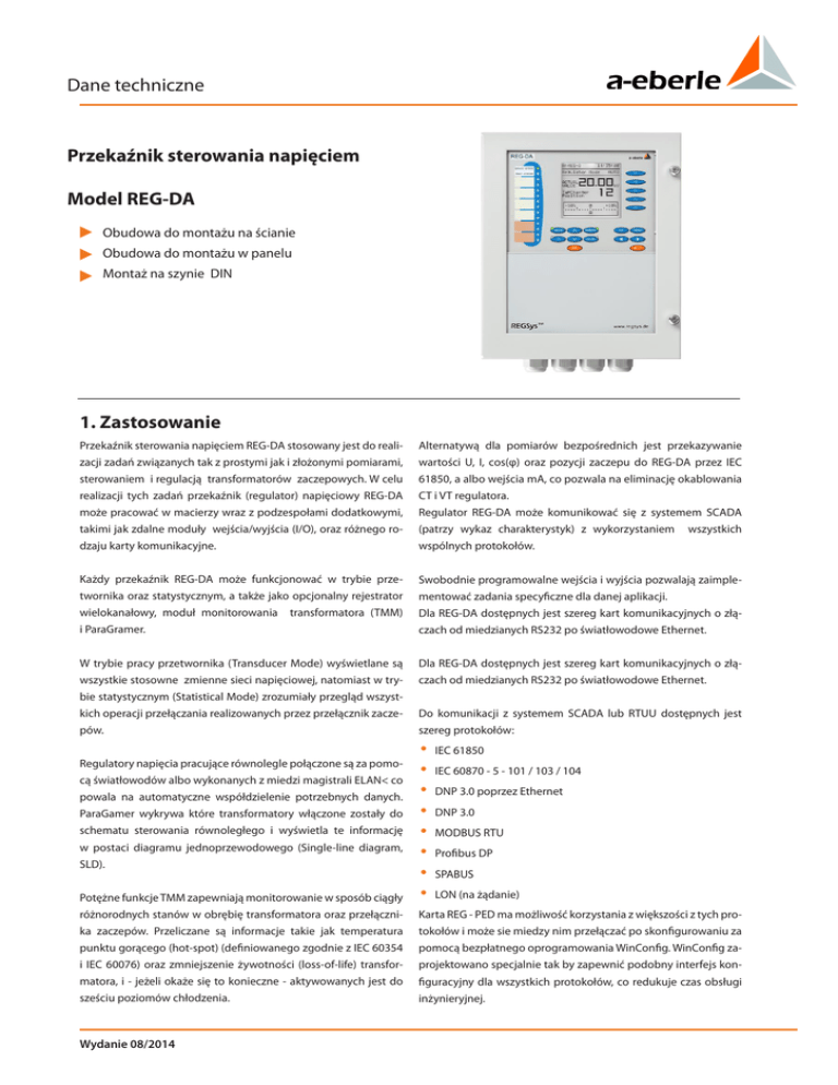 Technical Data Dane techniczne Relay forsterowania Voltage Control Przekaźnik napięciem Model REG-DA Model REG-DA Obudowa do housing montażu na ścianie 1 Wall mounting Obudowa do montażu 1 Panel mounting housing w panelu Montażmounting na szynie DIN 1 Din-rail 1. Zastosowanie Application Przekaźnik sterowania napięciem REG-DA stosowany jest do realiThe REG-DA relay for voltage control is used to perform both complex and simple measurement, control and regulation zacji zadań związanych tak z prostymi jak i złożonymi pomiarami, tasks on tap-changing To achieve these tasks, sterowaniem i regulacjątransformers. transformatorów zaczepowych. W celu the REG-DA be usednapięciowy with an array of realizacji tychvoltage zadań regulator przekaźnikcan (regulator) REG-DA add-on components, such as the BIN-D and ANA-D remote może pracować w macierzy wraz z podzespołami dodatkowymi, I/O modules, and an assortment of communication cards. takimi jak zdalne moduły wejścia/wyjścia (I/O), oraz różnego ro- Each REG-DA has transducer and statistical modes, as well as dzaju kartymulti-channel komunikacyjne. optional recorder, transformer monitoring module (TMM) and ParaGramer. Każdy przekaźnik funkcjonować trybie przeTransducer ModeREG-DA displaysmoże all of the relevantw measured twornika oraz statystycznym, a także jako variables of the voltage network, whileopcjonalny Statisticalrejestrator Mode provides a clear overview of the transformatora various switching wielokanałowy, moduł monitorowania (TMM) operations of the tap changer. i ParaGramer. Voltage regulators operating in parallel are connected via a fibre opticpracy or copper ELAN bus, which enables automaticsą W trybie przetwornika (Transducer Mode)the wyświetlane sharing of relevant data. ParaGramer then detects which wszystkie stosowne zmienne sieci napięciowej, natomiast w trytransformers have been switched into a parallel control bie statystycznym (Statistical zrozumiały wszystscheme and displays this Mode) information via przegląd a single-line kich operacji przełączania realizowanych przez przełącznik zaczediagram. pów. powerful TMM functions enable the continuous The monitoring of various conditions within the transformer and tap changer. Information suchrównolegle as hot-spot temperature (IEC Regulatory napięcia pracujące połączone są za pomo60354 or IEC 60076) and transformer loss-of-life are cą światłowodów albo wykonanych z miedzi magistrali ELAN< co calculated, and if necessary up to six cooling levels can be powala na automatyczne współdzielenie potrzebnych danych. activated. ParaGamer wykrywa które transformatory włączone zostały do As an alternative to direct measurement, the U, I, tap schematuand sterowania równoległego wyświetla te informację position cos(ϕ) value can also i be transmitted to the w postacivia diagramu jednoprzewodowego diagram, REG-DA either IEC 61850 or by mA(Single-line inputs, thereby eliminating the need for CT and VT cabling to the regulator. SLD). The REG-DA regulator can communicate with a SCADA system (see list ofzapewniają characteristics) throughw all of ciągły the Potężne funkcje TMM monitorowanie sposób common protocols. różnorodnych stanów w obrębię transformatora oraz przełączni- Freely programmable and outputs the ka zaczepów. Przeliczaneinputs są informacje takie jakenable temperatura implementation of application specific tasks. punktu gorącego (hot-spot) (definiowanego zgodnie z IEC 60354 A number of different communication cards are available for the REG-DA, with connections that range from copper RS232 to fibre opticdla Ethernet. Alternatywą pomiarów bezpośrednich jest przekazywanie wartości U, of I, cos(φ) orazare pozycji zaczepu do REG-DA przez A variety protocols available to communicate withIEC a SCADAa system or RTU: 61850, albo wejścia mA, co pozwala na eliminację okablowania CT 0i VTIECregulatora. 61850 0 IEC 60870 - 5 -może 101 /komunikować 103 / 104 Regulator REG-DA się z systemem SCADA 0 DNPwykaz 3.0 viacharakterystyk) Ethernet (patrzy z wykorzystaniem 0 DNP 3.0 wspólnych protokołów. wszystkich 0 MODBUS RTU 0 Profibus DP Swobodnie programowalne wejścia i wyjścia pozwalają zaimple0 SPABUS mentować zadania specyficzne dla danej aplikacji. 0 LON (on request) Dla REG-DA dostępnych jest szereg kart komunikacyjnych o złą- The REG-PED is capable of po most of these protocols and may czach od miedzianych RS232 światłowodowe Ethernet. be switched between them and configured using the free WinConfig software. WinConfig is specifically designed to Dla REG-DA dostępnych jest szereg kart komunikacyjnych o złąprovide a similar configuration interface for all of the czach od miedzianych RS232 po światłowodowe protocols, thereby reducing engineering time. Ethernet. Do komunikacji z systemem SCADA lub RTUU dostępnych jest szereg protokołów: • • • • • • • • IEC 61850 IEC 60870 - 5 - 101 / 103 / 104 D NP 3.0 poprzez Ethernet D NP 3.0 M ODBUS RTU P rofibus DP S PABUS L ON (na żądanie) Karta REG - PED ma możliwość korzystania z większości z tych protokołów i może sie miedzy nim przełączać po skonfigurowaniu za pomocą bezpłatnego oprogramowania WinConfig. WinConfig za- i IEC 60076) oraz zmniejszenie żywotności (loss-of-life) transfor- projektowano specjalnie tak by zapewnić podobny interfejs kon- matora, i - jeżeli okaże się to konieczne - aktywowanych jest do figuracyjny dla wszystkich protokołów, co redukuje czas obsługi sześciu poziomów chłodzenia. inżynieryjnej. Wydanie 08/2014 Issue 08/2014 g Tworzymy nowąofjakość We take care it. 2. Charakterystyka REG-DA • (128x128) wyświetlacz LCDof pokazu wszystkie istotne 2.D uży Characteristics thejacyREG-DA informacje (zaczep, napięcie, itp.) 0 • • 0 0 • 3. Opis 3. Description Large backlit LCD (128 allφ,important Funkcje pomiarowe (U. I,xP,128) Q, S,with cos φ, i sin φ, f ) information (tap, volta