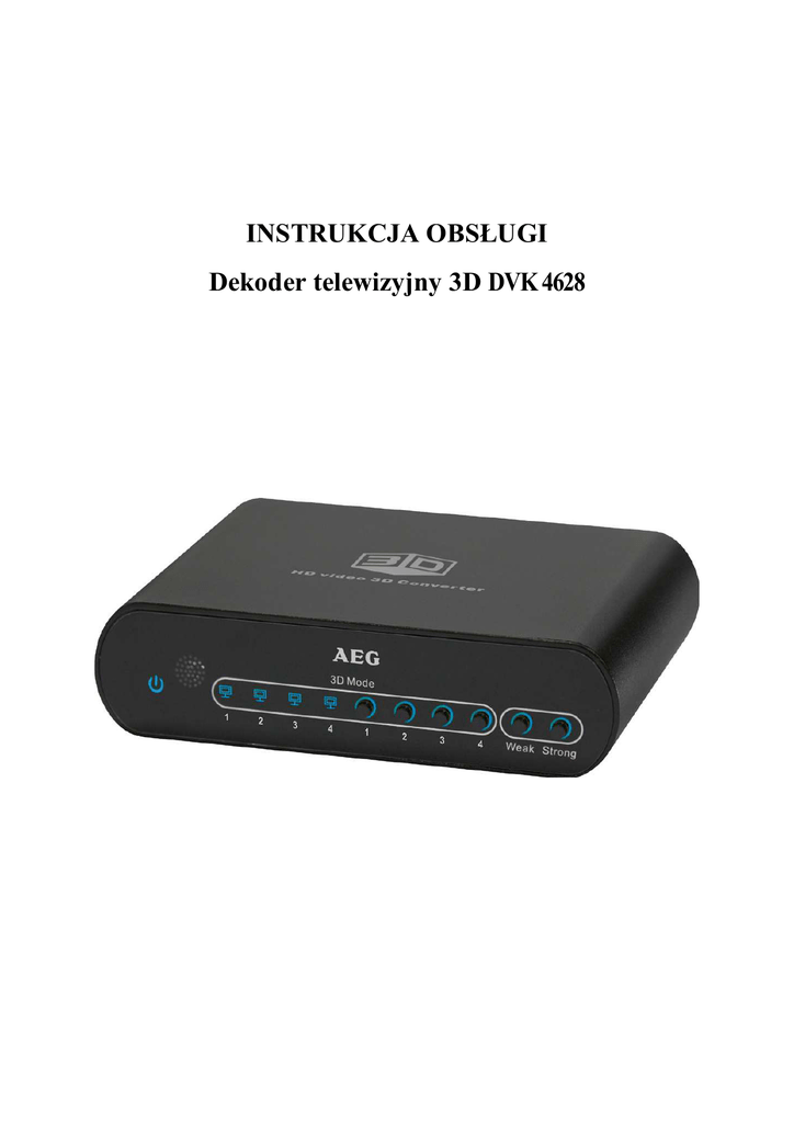 INSTRUKCJA OBSŁUGI Dekoder telewizyjny 3D DVK 4628 Wskazówki dot. bezpieczeństwa Przed użyciem urządzenie proszę dokładnie przeczytać i zachować instrukcję obsługi oraz kartę gwarancyjną, paragon oraz w miarę możliwości pudełko z opakowaniem wewnętrznym. W przypadku gdy przekazują Państwo osobie trzeciej należy przekazać także instrukcję obsługi. • • • • • • • • • • • Aby uniknąć ryzyka pożaru lub porażenia prądem nie należy narażać urządzenia na działanie deszczu lub wilgotności. Nie używać dekodera w bezpośrednim sąsiedztwie wody (w łazience, na basenie, w wilgotnej piwnicy). Korzystać z urządzenia wyłącznie do celów prywatnych i przewidzianych. Urządzenie nie jest przeznaczone do użytku publicznego. Upewnij się, że kabel zasilający nie jest skręcony, przygnieciony i nie ma kontaktu ze źródłem ciepła. Upewnij się, że kabel zasilający jest wolny od przeszkód. Zasilacz jest przeznaczony tylko do użytku w suchych pomieszczeniach. Zasilacz podłączać tylko do prawidłowo zainstalowanego gniazda. Upewnij się, wyjściowe napięcie elektryczne i polaryzacja zasilacza pokrywają się z informacjami na podłączonym urządzeniu! Nie dotykać podłączonego do sieci zasilacza wilgotnymi rękami! Odłącz zasilacz sieciowy z gniazdka gdy nie używasz urządzenia przez dłuższy czas, w trakcie czyszczenia lub w razie uszkodzeń. Urządzenie i kabel sieciowy muszą być regularnie sprawdzane pod kątem występowania uszkodzeń. W przypadku stwierdzenia uszkodzeń nie należy używać urządzenia. Nie należy naprawiać uszkodzonego urządzenia samodzielnie, należy zwrócić się do autoryzowanego fachowca. Aby uniknąć niebezpieczeństw kabel sieciowy powinien być wymieniony przez producenta, nasz punkt serwisowy lub podobnie wykwalifikowaną osobę. Nie używać innych zasilaczy sieciowych niż dołączony do urządzenia. Te symbole mogą znajdować się na urządzeniu. Należy zwrócić uwagę na: Symbol pioruna powinien wskazywać użytkownikowi części we wnętrzu urządzenia gdzie przepływa prąd o wysokim napięciu. Symbol z wykrzyknikiem powinien wskazywać użytkownikowi ważne wskazówki dot. konserwacji i obsługi urządzenia zawarte w instrukcji obsługi. Symbole użyte w instrukcji obsługi Ważne informacje dotyczące bezpieczeństwa są szczególnie oznakowane. Zawsze należy przestrzegać tych instrukcji, aby uniknąć wypadków i uszkodzenia urządzenia: OSTRZEŻENIE: Ostrzega przed zagrożeniami dla zdrowia i pokazuje potencjalne ryzyko obrażeń UWAGA: Wskazuje na potencjalne niebezpieczeństwo dla urządzenia i innych przedmiotów. WSKAZÓWKA: Podkreśla porady i informacje dla użytkowników. Dzieci i osoby starsze • Dla bezpieczeństwa Państwa dzieci nie należy zostawiać elementów opakowania (plastikowe torebki, karton, styropian itp.) w miejscach dla nich dostępnych. OSTRZEŻENIE! Nie należy pozwalać małym dzieciom bawić się folią. Isnieje ryzyko uduszenia! • • Urządzenie nie jest przeznaczone do użytku przez osoby (w tym dzieci) o ograniczonej sprawności fizycznej, zdolności sensorycznej lub umysłowej lub bez potrzebnego doświadczenia i / lub wiedzy, chyba że są one nadzorowane przez osobę odpowiedzialną za ich bezpieczeństwo lub otrzymały wskazówki, w jaki sposób korzystać z urządzenia. Dzieci powinny być nadzorowane, aby nie bawiły się urządzeniem. Specjalne środki ostrożności dla tego urządzenia • • • Jeżeli podczas korzystania z dekodera 3D dojdzie do jakichkolwiek reakcji organizmu, należy zrezygnować z korzystania z tego sprzętu. Podczas oglądania filmów w 3D widzowie mogą odczuwać bóle i zawroty głowy oraz nudności. Przyczyną tych dolegliwości jest zwiększone obciążenie oczu. Jeżeli jesteście Państwo w złej kondycji fizycznej, np. niewyspani bądź po spożyciu alkoholu, należy zrezygnować z korzystania z urządzenia. Przegląd elementów do obsługi Panel przedni 1. (!) Lampka kontrolna wskazująca działanie 2. IR Czujnik do pilota zdalnego sterowania 3. Kontrolka BYPASS 4. Kontrolka PROGRAMU 2D/ 2DTV 5. Kontrolka PROGRAMU 3D/ 2DTV 6. Kontrolka PROGRAMU 2D/ 3DTV 7. Przycisk BYPASS ( bez konwersji) 8. Przycisk PROGRAMU 2D/ 2DTV 9. Przycisk PROGRAMU 3D/ 2DTV 10. Przycisk PROGRAMU 2D/ 3DTV 11. Przycisk WEAK (słabszy efekt 3D) 12. Przycisk STRONG (mocniejszy efekt 3D) Panel tylny 13. Gniazdo zasilacza DC 14. I/O włącznik zasilania (wł/wył) 15. Złącze HDMI (wyjście) 16. Złącze HDMI (wejście) Pilot zdalnego sterowania 1. Przycisk BYPASS ( bez konwersji) 2. Przycisk PROGRAMU 2D/ 3DTV 3. Przycisk PROGRAMU 3D/ 3DTV 4. Przycisk STRONG (silny efekt 3D) 5. Przycisk MEDIUM (średni efekt 3D) 6. Przycisk WEAK (słaby efekt 3D) 7. Przycisk PROGRAMU 3D/ 2DTV 8. Przycisk PROGRAMU 2D/ 2DTV 9. Przycisk POWER (działanie/ stan czuwania) Opis produktu Urządzenie konwertuje obraz cyfrowy (cyfrowa telewizja satelitarna, DVB-T, telewizja kablowa, DVD, gry, itp.) do formatu 3D i przekazuje go ponownie w formacie HD – Ready lub FULL HD do odbiornika telewizyjnego. Zawartość opakowania 1x dekoder 3D, 1x zasilacz, 1x pilot zdalnego sterowania, 2x okulary 3D Uruchomienie urządzenia • • Wybierz odpowiednie miejsce dla urządzenia. Odpowiednia będzie sucha, płaska, antypoślizgowa powierzchnia, na której można dobrze obsługiwać urządzenie. Usuń, jeżeli występuje, folię ochronną z urządzenia. Zasilanie • Podłącz zasilacz do poprawnie zainstalowanego gniazda z uziemieniem 230 V, 50 Hz. Podłącz urządzenie do zasilacza poprzez włożenie wtyczki dekodera do gniazda zasilacza (13) z tyłu urządzenia. • Upewnij się, że napięcie w sieci odpowiada specyfikacji na tabliczce znamionowej. UWAGA! • Dołączony zasilacz może być używany tylko z tym urządzeniem. Nie może być używana do innych urządzeń. • Używać tylko zasilacza 5,5 V [schemat elektryczny]. Inny zasilacz może spowodować uszko