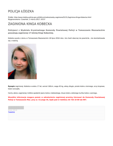 POLICJA ŁÓDZKA Źródło: http://www.lodzka.policja.gov.pl/ld/kryminalne/osoby-zaginione/5215,Zaginiona-Kinga-Kobecka.html Wygenerowano: Czwartek, 2 marca 2017, 03:57 ZAGINIONA KINGA KOBECKA Policjanci z Wydziału Kryminalnego Komendy Powiatowej Policji w Tomaszowie Mazowieckim poszukują zaginionej 17-letniej Kingi Kobeckiej. Kobieta wyszła z domu w Tomaszowie Mazowieckim 18 lipca 2016 roku i do chwili obecnej nie powróciła , nie skontaktowała się z rodziną. Rysopis zaginionej: Kobieta w wieku 17 lat, wzrost 160cm, waga 45 kg, włosy długie, proste koloru ciemnego, oczy brązowe, twarz szczupła, Cechy ubioru zaginionej: krótkie spodenki jeans koloru niebieskiego, bluza koloru zielonego kurtka koloru czarnego, Wszelkie informacje mogące pomóc w odnalezieniu zaginionej prosimy kierować do Komendy Powiatowej Policji w Tomaszowie Maz. przy ul. O.Lange 44, bądź pod nr telefonu 44 726 10 00 lub 997. Ocena: 2/5 (2) Tweetnij