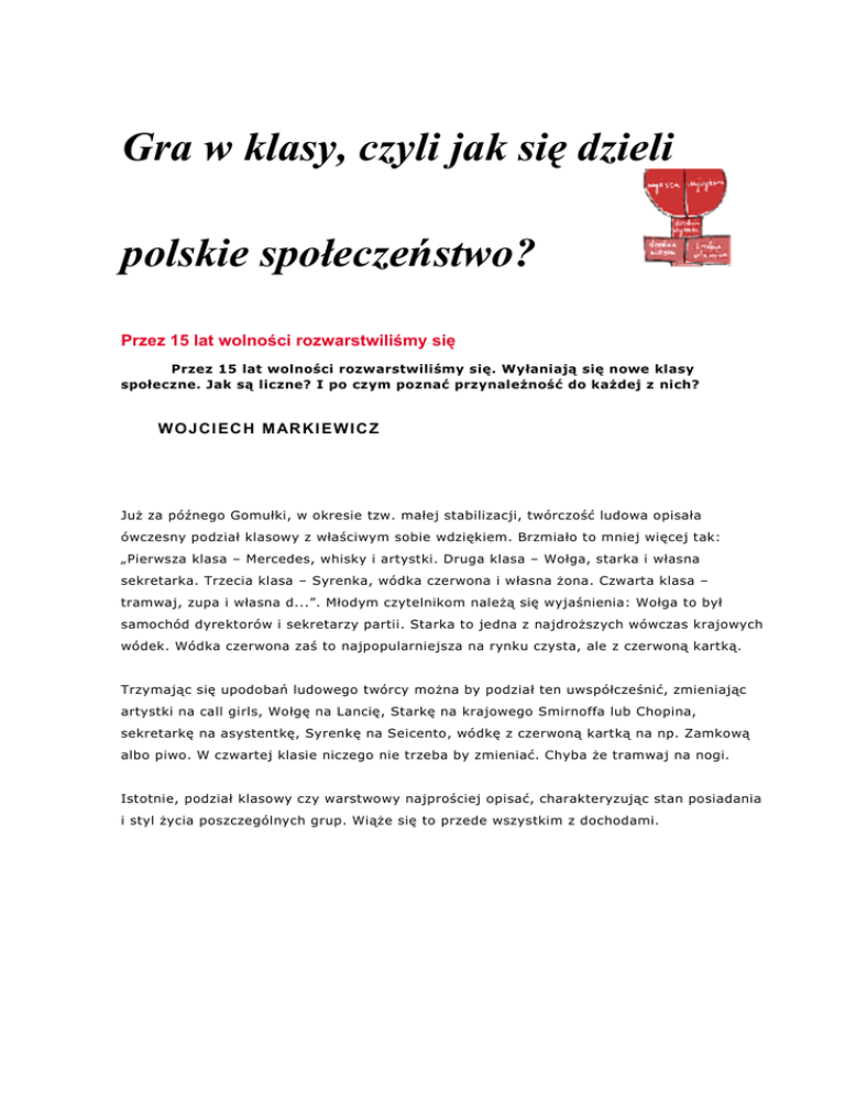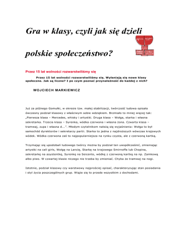 Gra w klasy, czyli jak się dzieli polskie społeczeństwo? Przez 15 lat wolności rozwarstwiliśmy się Przez 15 lat wolności rozwarstwiliśmy się. Wyłaniają się nowe klasy społeczne. Jak są liczne? I po czym poznać przynależność do każdej z nich? W O J CI EC H M AR KI EW I C Z Już za późnego Gomułki, w okresie tzw. małej stabilizacji, twórczość ludowa opisała ówczesny podział klasowy z właściwym sobie wdziękiem. Brzmiało to mniej więcej tak: „Pierwsza klasa – Mercedes, whisky i artystki. Druga klasa – Wołga, starka i własna sekretarka. Trzecia klasa – Syrenka, wódka czerwona i własna żona. Czwarta klasa – tramwaj, zupa i własna d...”. Młodym czytelnikom należą się wyjaśnienia: Wołga to był samochód dyrektorów i sekretarzy partii. Starka to jedna z najdroższych wówczas krajowych wódek. Wódka czerwona zaś to najpopularniejsza na rynku czysta, ale z czerwoną kartką. Trzymając się upodobań ludowego twórcy można by podział ten uwspółcześnić, zmieniając artystki na call girls, Wołgę na Lancię, Starkę na krajowego Smirnoffa lub Chopina, sekretarkę na asystentkę, Syrenkę na Seicento, wódkę z czerwoną kartką na np. Zamkową albo piwo. W czwartej klasie niczego nie trzeba by zmieniać. Chyba że tramwaj na nogi. Istotnie, podział klasowy czy warstwowy najprościej opisać, charakteryzując stan posiadania i styl życia poszczególnych grup. Wiąże się to przede wszystkim z dochodami. Pewną w nich orientację dają progi podatkowe. Wiadomo, że 90 proc. Polaków mieści się w pierwszym 19-proc. progu, 9 proc. w drugim, 1 proc. w najwyższym 40-proc. Ale ten podział fiskalny jest zbyt prosty. Wiadomo (dowiodła tego Joanna Solska w artykule „Bogaci nie płacą”, POLITYKA 29/03), że ponad 75 proc. najbogatszych nie płaci podatków w Polsce, tylko rejestruje interesy za granicą. Z kolei 90 proc. podatników najniższego progu nie sposób wrzucić do jednego worka. Ponadto duża część gospodarki to szara i czarna strefa, więc nie wiadomo dokładnie, jakie kto ma dochody. Spróbujmy jednak posłużyć się sprawdzonym amerykańskim wzorem, który dzieli społeczeństwo na trzy klasy: niższą, środkową (średnią) i wyższą. Z kolei każdą z tych klas dzieli się na trzy kolejne. Jest więc np. lower middle class (średnia niższa), middle class (właściwa średnia) i upper middle (wyższa średnia). Mimo że nasza struktura społeczna nie ma jeszcze takiej trwałości i stabilności, postanowiliśmy skorzystać z podobnego modelu i – po konsultacji z socjologami – wyróżniliśmy w klasie najniższej dwie podgrupy, w średniej trzy, a w najwyższej znów dwie. Podstawowym kryterium przynależności do danej klasy uczyniliśmy stopień zależności socjalnej i społecznej, ten zaś wyraża się w określonych aspiracjach materialnych. Tak zatem do klasy niższej należą ci, którzy są – w mniejszym lub większym stopniu – społecznie ubezwłasnowolnieni, a ich egzystencja zależy od wsparcia socjalnego. Klasę średnią wyróżnia elementarne poczucie bezpieczeństwa związane z posiadaniem mieszkania (nawet niewykupionego na własność, ale jednak) oraz stałej pracy (tu znajduje się większość pracobiorców). Z kolei dla klasy wyższej (głównie pracodawcy i właściciele dochodowych interesów)typowe są już nie proste wskaźniki materialne, ale styl życia związany z gromadzeniem luksusowych dóbr, czy – jak się mówi w języku socjologii – konsumowaniem na pokaz. By określić liczebność poszczególnych klas, posłużyliśmy się podziałem na grupy dochodowe, jaki wynika z masowego badania socjologicznego „Diagnoza społeczna 2003”. Podział i nasze wyliczenia mają charakter umowny i szacunkowy, bo klasy, głównie te niższe, przenikają się. Kto co ma – szczególnie u szczytu drabiny społecznej – dokładnie nie wiadomo, bo klasa wyższa chowa się za wysokimi płotami, ochroną, nie dopuszcza do siebie ankieterów, a strzegąc prywatności – dziennikarzy. Co się stało z naszymi klasami? Komentuje socjolog prof. Jacek Wasilewski Najważniejsza zmiana, która odróżnia dzisiejszą strukturę społeczną od tej, którą pamiętamy z czasów PRL-u, polega na tym, że zanika to, co nazywamy rozchwianiem czynników statusu. To rozchwianie dobrze pamiętamy: wyrażało się tym, że wysokiej pozycji w jednej sferze nie odpowiadała kiedyś taka sama pozycja w innej. Przykładowo: wykształcenie wyższe nie szło w parze z zasobnością materialną. Tworzące się dziś klasy są bardziej koherentne, a to oznacza, że tworzą się właściwe proporcje między wykształceniem a dochodami. Charakterystyczne jest także zwiększanie się dystansu między klasami. Coraz większą rolę odgrywać przy tym będzie punkt startu: zamożniejsi i wykształceni rodzice są gwarantem, że ich potomek znajdzie się – najpewniej – w tej samej klasie co oni. Jeśli zaś chodzi o wyznaczniki pozycji społecznej, to poza dochodami i wykształceniem coraz większą rolę odgrywać będzie styl życia, związany choćby ze sposobami spędzania czasu wolnego. To właśnie styl życia często definiuje naszą pozycję społeczną: nasze zachowania są tu przejawem zarówno naszych aspiracji, jak i potwierdzaniem miejsca w społeczeństwie. Po czym więc poznać, że ktoś należy do określonej klasy? Pozostają tzw. znamiona zewnętrzne: jak mieszka, czym jeździ, gdzie i w co się ubiera, co i gdzie jada, gdzie i jak wypoczywa. Ci z samego dołu Dochód miesięczny do 600 zł netto. Tu, z oczywistych względów, opis stanu posiadania musi być najkrótszy. Jak mieszka niższa klasa oraz dająca się z niej wyodrębnić ta najniższa? Ci z samego dołu, bezdomni (według różnych szacunków jest ich w Polsce 40–65 do 200 tys.) zimą nocują w śmietnikach, bo śmiecie grzeją, w węzłach ciepłowniczych, w kanałach, na klatkach schodowych, dworcach, w noclegowniach, w 