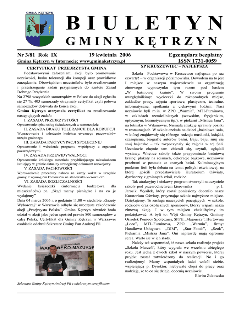 BIULETYN GMINY KĘTRZYN Nr 3/81 Rok IX 19 kwietnia 2006 Gmina Kętrzyn w Internecie; www.gminaketrzyn.pl CERTYFIKAT PRZEJRZYSTA GMINA Podstawowymi założeniami akcji było promowanie uczciwości, braku tolerancji dla korupcji oraz prawidłowe zarządzanie. Obowiązkiem uczestników było zrealizowanie i przestrzeganie zadań przypisanych do sześciu Zasad Dobrego Rządzenia. Na 2798 wszystkich samorządów w Polsce do akcji zgłosiło się 27 %. 403 samorządy otrzymały certyfikat czyli połowa samorządów dotrwała do końca akcji. Gmina Kętrzyn otrzymała certyfikat za zrealizowanie następujących zadań: I. ZASADA PRZEJRZYSTOŚCI Opracowanie opisu usług świadczonych w samorządzie. II. ZASADA BRAKU TOLERANCJI DLA KORUPCJI Wypracowanie i wdrożenie kodeksu etycznego pracowników urzędu gminnego. III. ZASADA PARTYCYPACJI SPOŁECZNEJ Opracowanie i wdrożenie programu współpracy z organami pozarządowymi. IV. ZASADA PRZEWIDYWALNOCI Opracowanie krótkiego materiału przybliżającego mieszkańcom istniejący w gminie aktualny strategiczny dokument rozwojowy. V. ZASADA FACHOWOŚCI Wprowadzenie procedury naboru na każdy wakat w urzędzie gminy, z wymogiem konkursów na stanowiska kierownicze. VI. ZASADA ROZLICZALNOŚCI Wydanie książeczki (informacja budżetowa dla mieszkańców) pt. „Skąd mamy pieniądze i na co je wydajemy” Dnia 04 marca 2006 r. o godzinie 11.00 w siedzibie „Gazety Wyborczej” w Warszawie odbyło się uroczyste zakończenie akcji „Przejrzysta Polska”. Gmina Kętrzyn również brała udział w akcji jako jeden spośród prawie 800 samorządów z całej Polski. Certyfikat dla Gminy Kętrzyn w Warszawie osobiście odebrał Sekretarz Gminy Pan Andrzej Fil. Sekretarz Gminy Kętrzyn Andrzej Fil z odebranym certyfikatem Egzemplarz bezpłatny ISSN 1731-0059 SP KRUSZEWIEC – NAJLEPSZA Szkoła Podstawowa w Kruszewcu najlepsza po raz czwarty! – w organizacji półzimowiska. Dowodem na to jest I miejsce w naszym województwie za organizację zimowego wypoczynku tym razem pod hasłem „W baśniowej krainie”. W swoim programie uwzględniliśmy: wycieczki do różnorodnych miejsc, zakładów pracy, zajęcia sportowe, plastyczne, teatralne, informatyczne, spotkania z ciekawymi ludźmi. Nasi uczniowie byli m.in. w ZPO „Warmia”, MTI-Furninova, w zakładach rzemieślniczych (szewskim, fryzjerskim, optycznym, kosmetycznym itp.), w piekarni „Mistrza Jana”, na lotnisku w Wilamowie. Niemałą atrakcję sprawiły posiłki w restauracjach. W szkole czekała na dzieci „baśniowa’ sala, w której znajdowały się różnego rodzaju maskotki, książki, czasopisma, biografie autorów baśni. Baju, baju, snuj się snuj bajeczko – tak rozpoczynały się zajęcia w tej Sali. Uczniowie chętnie tam zbierali się, czytali, oglądali wystawy. Wnętrze szkoły także przypominało baśniową krainę: plakaty na ścianach, dekoracje bajkowe, uczniowie przebrani w postacie ze znanych baśni. Kulminacyjnym punktem ferii była debata na temat polityki oświatowej, na której gościli przedstawiciele Kuratorium Oświaty, dyrektorzy z gminnych szkół, rodzice. Tak atrakcyjny i ciekawy program stworzyli nauczyciele szkoły pod przewodnictwem kierownika p. I. Jarosik. Wysiłek, który został poniesiony doceniło nasze Kuratorium Oświaty, przyznając szkole najwyższe miejsce. Dziękujemy. To zasługa nauczycieli pracujących w szkole, rodziców oraz okolicznych sponsorów, którzy wsparli nasza zimową akcję. I w tym miejscu chcielibyśmy im podziękować. A byli to: Wójt Gminy Kętrzyn, Gminny Ośrodek Pomocy Społecznej, SPPH „Majonezy”, Hurtownia „Loco”, MTI–Furninova, ZPO „Warmia”, firmy: Handlowo–Usługowa „DIM”, „Star–Foods”, „Szok”, Piekarnia „Mistrza Jana”. Oni naprawdę mają ogromne serca. Warto iść w ich ślady. Należy też wspomnieć, iż nasza szkoła realizuje projekt „Szkoła Marzeń”, który wygrała we wrześniu ubiegłego roku. Jest jedną z dwóch szkół w naszym powiecie, której projekt został zatwierdzony do realizacji. No i go realizujemy! Mamy wspaniałych ludzi wokół siebie, wspierającą p. Dyrektor, niebywałe chęci do pracy oraz nadzieję, że to co się dzieje, docenią uczniowie. Elwira Żukowska DELEGACJA Z ŁOTWY W dniach od 8 do 11 marca na terenie naszego powiatu przebywała delegacja z powiatu Gulbene. W 9 osobowym składzie delegacji znaleźli się: Anna Kokorevica - radna powiatu Gulbene i jednocześnie konsultant ds. zdrowia, pracy socjalnej i ochrony praw dziecka, dyrektorzy dwóch Centrów Pomocy Rodzinie, powiatowy szef Czerwonego Krzyża i pracownicy socjalni z kilku gmin, w tym Liga Romanowa z gminy Stradi – współpracującej z naszą gminą. Goście z Łotwy zapoznali się z funkcjonowaniem Powiatowego Centrum Pomocy Rodzinie w Kętrzynie, Warsztatów Terapii Zajęciowej, Powiatowego Urzędu Pracy, Domu Pomocy Społecznej i Gminnego Ośrodka Pomocy Społecznej w Kętrzynie. W dniu 9 marca goście z Łotwy odwiedzili GOPS Kętrzyn. Spotkanie informacyjne odbyło się w sali konferencyjnej Urzędu Gminy z udziałem wójta Sławomira Jarosika i przewodniczącego Rady Gminy Władysława Dudy. Goście zwiedzili pomieszczenia GOPS, w tym Klubu Integracji Społecznej. Kierownik GOPS Andrzej Sobczak towarzyszył również grupie gości jako przewodnik turystyczny. Goście zapoznali się z historią miasta i okolic oraz zwiedzili: w Kętrzynie kościół ewangelicki św. Jana, kościół katolicki św. Jerzego, muzeum w zamku, w Świętej Lipce bazylikę z wysłuchaniem koncertu organowego oraz zamek biskupów warmińskich w Reszlu. Z pracy GOPS gości najbardziej interesowało: Funkcjonowanie KIS oraz przymiarki do tworzenia spółdzielni socjalnych. W trakcie rozmów goście z Łotwy wyrazili chęć wspólnego pisania projektów na pozyskanie środków finansowych z Unii Europejskiej. (as) __________________________________________________ GMINNE FORUM OŚWIATOWE W dniu 6 kwietnia w 