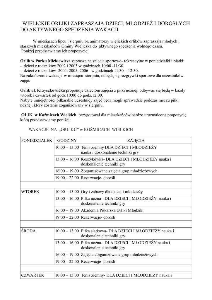 WIELICKIE ORLIKI ZAPRASZAJĄ DZIECI, MŁODZIEŻ I DOROSŁYCH DO AKTYWNEGO SPĘDZENIA WAKACJI. W miesiącach lipcu i sierpniu br. animatorzy wielickich orlików zapraszają młodych i starszych mieszkańców Gminy Wieliczka do aktywnego spędzenia wolnego czasu. Poniżej przedstawiamy ich propozycje: Orlik w Parku Mickiewicza zaprasza na zajęcia sportowo- rekreacyjne w poniedziałki i piątki: - dzieci z roczników 2002 i 2003 w godzinach 10:00 -11:30, - dzieci z roczników 2004, 2005, 2006 w godzinach 11:30 – 12:30. Na zakończenie wakacji w miesiącu sierpniu, odbędą się rozgrywki sportowe dla uczestników zajęć. Orlik ul. Krzyszkowicka proponuje dzieciom zajęcia z piłki nożnej, odbywać się będą w każdy wtorek i czwartek od godz 10:00 do godz.12:00. Nabyte umiejętności piłkarskie uczestnicy zajęć będą mogli sprawadzić podczas meczu piłki nożnej, który zostanie zoganizowany w sierpniu. OLIK w Koźmicach Wielkich przygotował dla mieszkańców bardzo urozmaiconą propozycję którą przedstawiamy poniżej: WAKACJE NA „ORLIKU” w KOŹMICACH WIELKICH PONIEDZIAŁEK GODZINY ZAJĘCIA 10:00 – 13:00 Tenis ziemny DLA DZIECI I MŁODZIEŻY nauka i doskonalenie techniki gry 13:00 – 16:00 Koszykówka- DLA DZIECI I MŁODZIEŻY nauka i doskonalenie techniki gry 16:00 – 19:00 Zorganizowane zajęcia grup młodzieżowych 19:00 – 22:00 Rezerwacje- dorośli WTOREK 10:00 – 13:00 Gry i zabawy dla dzieci i młodzieży 13:00 – 16:00 Piłka nożna- DLA DZIECI I MŁODZIEŻY nauka i doskonalenie techniki gry 16:00 – 19:00 Akademia Piłkarska Orliki Młodziki 19:00 – 22:00 Rezerwacje- dorośli ŚRODA 10:00 – 13:00 Piłka siatkowa- DLA DZIECI I MŁODZIEŻY nauka i doskonalenie techniki gry 13:00 – 16:00 Piłka nożna- DLA DZIECI I MŁODZIEŻY nauka i doskonalenie techniki gry 16:00 – 19:00 Zajęcia zorganizowane grup młodzieżowych 19:00 – 22:00 Rezerwacje- dorośli CZWARTEK 10:00 – 13:00 Tenis ziemny- DLA DZIECI I MŁODZIEŻY nauka i doskonalenie techniki gry 13:00 – 16:00 Gry i zabawy dla dzieci i młodzieży 16:00 – 19:00 Zajęcia zorganizowane grup młodzieżowych 19:00 – 22:00 Rezerwacje- dorośli PIĄTEK 10:00 – 13:00 Koszykówka- DLA DZIECI I MŁODZIEŻY nauka i doskonalenie techniki gry 13:00 – 16:00 Piłka nożna- DLA DZIECI I MŁODZIEŻY nauka i doskonalenie techniki gry 16:00 – 19:00 Akademia Piłkarska Orliki Młodziki 19:00 – 22:00 Rezerwacje- dorośli SOBOTA 10:00 – 13:00 Gry i zabawy dla dzieci z rodzicami 13:00 – 16:00 Piłka nożna- małe gry i zabawy dla dzieci z rodzicami 16:00 – 18:00 Piłka nożna-zorganizowane grupy młodzieżowe 18:00 – 22:00 Rezerwacje-dorośli NIEDZIELA 10:00 – 13:00 Konkursy rodzinne 13:00 – 16:00 Rodzinny tor przeszkód 16:00 – 22:00 Rezerwacje-dorośli Orlik w Śledziejowicach zorganizuje: - dla dzieci i ich rodziców mecze piłki nożnej - dzieci kontra rodzice, - mecz "w dwa ognie" dziewcząt, - zajęcia sportowe, z rywalizacją w tle, dla dzieci i młodzieży z elementów koszykówki, siatkówki i piłki nożnej. Terminy w/w propozycji proszę uzgodnić z animatorami Orlika w Śledziejowicach. Serdecznie zapraszamy.