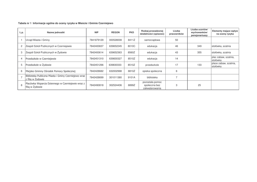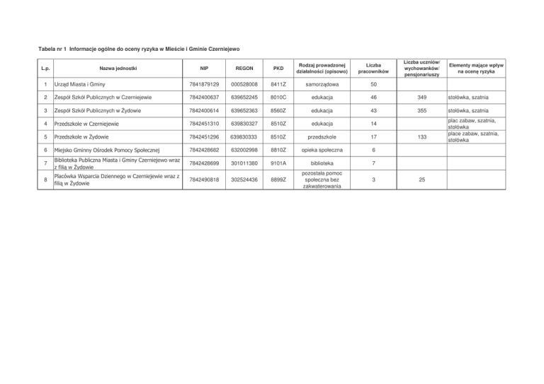Tabela nr 1 Informacje ogólne do oceny ryzyka w Mie cie i Gminie Czerniejewo L.p. Nazwa jednostki NIP REGON PKD Rodzaj prowadzonej działalno ci (opisowo) Liczba pracowników Liczba uczniów/ wychowanków/ pensjonariuszy Elementy maj ce wpływ na ocen ryzyka 1 Urz d Miasta i Gminy 7841879129 000528008 8411Z samorz dowa 50 2 Zespół Szkół Publicznych w Czerniejewie 7842400637 639652245 8010C edukacja 46 349 stołówka, szatnia 3 Zespół Szkół Publicznych w ydowie 7842400614 639652363 8560Z edukacja 43 355 stołówka, szatnia 4 7842451310 639830327 8510Z edukacja 14 5 7842451296 639830333 8510Z przedszkole 17 6 7842428682 632002998 8810Z opieka społeczna 6 7842428699 301011380 9101A biblioteka 7 7842490818 302524436 8899Z pozostała pomoc społeczna bez zakwaterowania 3 7 8 ! " ! # $ % 133 25 plac zabaw, szatnia, stołówka place zabaw, szatnia, stołówka Tabela nr 2 - Wykaz budynków i budowli w Mie cie i Gminie Czerniejewo lp. nazwa budynku/ budowli przeznaczenie budynku/ budowli czy budynek jest u ytkowany? (TAK/NIE) rok budowy rodzaj zabezpieczenia warto ci (znane zabiezpieczenia p(ksi gowa suma ubezpieczenia po i przeciw brutto - KB / (warto ) odtworzeniow kradzie owe) a - O) (2) Rodzaj materiałów budowlanych, z jakich wykonano budynek opis stanu technicznego budynku wg poni szych elementów budynku lokalizacja (adres) mury stropy dach konstukcja i (konstrukcja pokrycie i pokrycie) dachu intalacja elekryczna sie wodnokanalizacyjna oraz cenralnego ogrzewania stolarka okienna i drzwiowa instalacja gazowa instalacja wentylacyjn ai kominowa dobry dobry dobry brak dobra dobry dobry dobry brak dobra dobry dobry dobry brak dobra dobry dobry dobry brak dobra dobra dobra dobra bark dobra 1. Urz d Miasta i Gminy płyty azbestow płyty Czerniejewo A. Pozna 33 azbestow płyty Czerniejewo A. Pozna 35 azbestow 1 4 mieszkania mieszkalny TAK 1969-1973 26 353,00 zł KB Czerniejewo A. Pozna 31 2 5 mieszka mieszkalny TAK 1969-1973 39 158,00 zł KB 3 5 mieszka mieszkalny TAK 1969-1973 37 749,90 zł KB 4 4 mieszkania mieszkalny TAK 1969-1973 49 706,00 zł KB Czerniejewo A. Pozna 37 pustak drewniany 5 8 mieszka mieszkalny TAK 1920 8 462,18 zł KB Czerniejewo, 1Maja 9 cegła drewniany 6 2 mieszkania mieszkalny TAK 1973 64 916,10 zł KB Czerniejewo A. Pozna 20 7 1 mieszkanie mieszkalny TAK 1981 5 656,94 zł KB 8 1 mieszkanie mieszkalny TAK 1976 30 814,60 zł KB 9 5 mieszka mieszkalny TAK 1982-1984 42 612,08 zł KB Czerniejewo cegła dziurawka wielka Czerniejewo A. Pozna 22 płyta Czerniejewo, G. Lipskiego cegła 9 drewniany drewniany drewniany drewniana,pa dobry pa drewniana,pa dobry pa drewniana,pa dobry pa drewniana,pa dobry pa drewniana,da dostateczna chówka betonowy papa dobra dobra dobra dobra brak dobra betonowy papa dobra dobra dobra dobra brak dobra betonowy papa dobra dobra dobra dobra brak dobra cegła drewniane papa dobra dobra dobra dobra brak dobra 10 2 mieszkania mieszkalny TAK 1939-1945 2 941,60 zł KB Czerniejewo, Os. Działkowe 11 6 mieszka mieszkalny TAK 1920-1930 49 195,00 zł KB Czerniejewo, Pałacowa 4 cegła drewniane dachówka dobra dobra dobra dobra brak dobra 12 4 mieszkania mieszkalny TAK 1920-1930 40 870,66 zł KB Czerniejewo, Pałacowa 25 cegła drewnina papa dobra dobra dobra dobra brak dobra 13 3 mieszkania mieszkalny TAK 1920-1930 11 527,10 zł KB Czerniejewo, Pałacowa 32 cegła drewnina papa dobra dobra dobra dobra brak dobra cegła drewniana dachówka dostateczne dobra dobra dobra brak dobra cegła drewnina blacha ocynk dobra dobra dobra dobra brak dobra Czerniejewo, Kopczy skiego 3 Czerniejewo, Kopczy skiego 5 14 7 mieszka mieszkalny TAK 1920-1930 8 462,16 zł KB 15 1 mieszkanie mieszkalny TAK 1920-1930 12 596,70 zł KB 16 4 mieszkania mieszkalny TAK 1920-1930 31 449,29 zł KB Czerniejewo, W. Ludów 13 cegła drewniana papa dobra dobra dobra dobra brak dobra 17 3 mieszkania mieszkalny TAK 1920-1930 9 813,00 zł KB Czerniejewo, W. Ludów 15 cegła drewniany papa dobra dobra dobra dobra brak dobra 18 1 mieszkanie mieszkalny TAK 1979 88 225,56 zł KB Czerniejewo, Szkolna 3 cegła betonowy papa dobra dobra dobra dobra brak dobra dobra dobra dobra brak dobra 19 3 mieszkania mieszkalny TAK 1939 6 933,00 zł KB Czerniejewo, W ska 1 cegła blachodachów drewniany bardzo dobra ka cegła drewniany dachówka bardzo dobra dobra dobra dobra tak dobra cegła drewniany płyta onduline dobra dobra dobra dobra brak dobra dostateczne dobra dobra dobra brak dobra dostateczne dostateczna dostateczna dostateczn a brak dostateczna 20 1 mieszkanie mieszkalny TAK 1920 30 000,00 zł KB Czerniejewo, Wyszy skiego 6 21 2 mieszkania mieszkalny TAK 1939 8 462,16 zł KB Graby 18 dachówka cementowa dachówka cementowa 22 1mieszkanie mieszkalny TAK 1939 8 462,16 zł KB Graby 24 cegła drewniany 23 1 mieszkanie mieszkalny TAK 1920 114 199,15 zł KB K piel 9 cegła drewniany 24 2 mieszkania mieszkalny TAK 1986 7 765,60 zł KB Lipki 2 cegła betonowy papa dobra dobra dobra dobra brak dobra 25 6 mieszka mieszkalny TAK 1920 94 701,69 zł KB Nidom 13 cegła drewniany dachówka cementowa dostateczna dobra dobra dobra brak dobra 26 3 mieszkania mieszkalny TAK 1920 33 929,00 zł KB Pakszyn 1 cegła drewniany dachówka dostateczna dostateczna dobra brak dobra 27 1mieszkanie mieszkalny TAK 1920 3 651,24 zł KB Pakszyn 2 cegła drewniany dachówka dostateczna dostateczna dobra brak dobra 28 3 mieszkania mieszkalny TAK 1900 8 309,40 zł KB Pakszyn 35 cegła drewniany dobra dostateczne brak dostateczne 29 1 mieszkanie mieszkalny TAK 1920 4 666,00 zł KB Szczytniki Czerniejewo 6 cegła drewniany dostateczna dostateczna brak dostateczne Strona 1 z 3 płyta onduline dostateczna dachówka dostateczna dostateczn a dostateczn a dostateczn e dostateczn a 30 4 mieszkania mieszkalny TAK 1936 27 986,22 zł KB ydowo, Ojca w. 7 cegła drewniany dachówka bardzo dobry dobry dobry dobry brak dobry 31 2 mieszkanie mieszkalny TAK 1920 6 297,60 zł KB ydowo, Pl. Obr. -wo 12 cegła drewniany dachówka dobry dobry dobry dobry