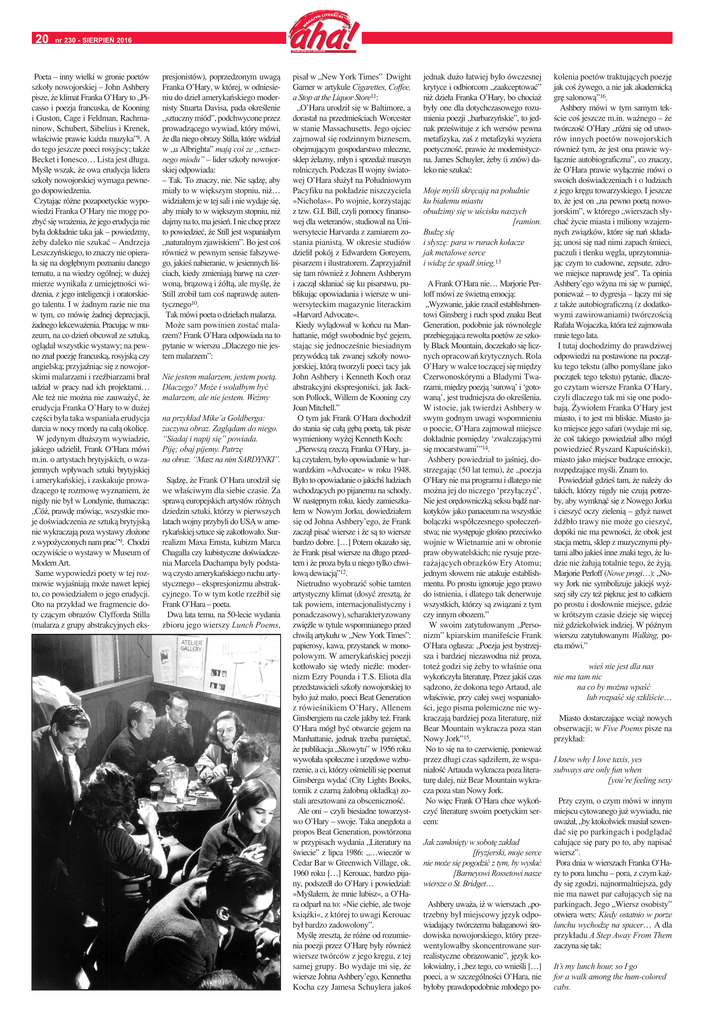 20 nr 230 - SIERPIEŃ 2016 Poeta – inny wielki w gronie poetów szkoły nowojorskiej – John Ashbery pisze, że klimat Franka O’Hary to „Picasso i poezja francuska, de Kooning i Guston, Cage i Feldman, Rachmaninow, Schubert, Sibelius i Krenek, właściwie prawie każda muzyka”8. A do tego jeszcze poeci rosyjscy; także Becket i Ionesco… Lista jest długa. Myślę wszak, że owa erudycja lidera szkoły nowojorskiej wymaga pewnego dopowiedzenia. Czytając różne pozapoetyckie wypowiedzi Franka O’Hary nie mogę pozbyć się wrażenia, że jego erudycja nie była dokładnie taka jak – powiedzmy, żeby daleko nie szukać – Andrzeja Leszczyńskiego, to znaczy nie opierała się na dogłębnym poznaniu danego tematu, a na wiedzy ogólnej; w dużej mierze wynikała z umiejętności widzenia, z jego inteligencji i oratorskiego talentu. I w żadnym razie nie ma w tym, co mówię żadnej deprecjacji, żadnego lekceważenia. Pracując w muzeum, na co dzień obcował ze sztuką, oglądał wszystkie wystawy; na pewno znał poezję francuską, rosyjską czy angielską; przyjaźniąc się z nowojorskimi malarzami i rzeźbiarzami brał udział w pracy nad ich projektami… Ale też nie można nie zauważyć, że erudycja Franka O’Hary to w dużej części była taka wspaniała erudycja darcia w nocy mordy na całą okolicę. W jedynym dłuższym wywiadzie, jakiego udzielił, Frank O’Hara mówi m.in. o artystach brytyjskich, o wzajemnych wpływach sztuki brytyjskiej i amerykańskiej, i zaskakuje prowadzącego tę rozmowę wyznaniem, że nigdy nie był w Londynie, tłumacząc: „Cóż, prawdę mówiąc, wszystkie moje doświadczenia ze sztuką brytyjską nie wykraczają poza wystawy złożone z wypożyczonych nam prac”9. Chodzi oczywiście o wystawy w Museum of Modern Art. Same wypowiedzi poety w tej rozmowie wyjaśniają może nawet lepiej to, co powiedziałem o jego erudycji. Oto na przykład we fragmencie doty czącym obrazów Clyfforda Stilla (malarza z grupy abstrakcyjnych eks- presjonistów), poprzedzonym uwagą Franka O’Hary, w której, w odniesieniu do dzieł amerykańskiego modernisty Stuarta Davisa, pada określenie „sztuczny miód”, podchwycone przez prowadzącego wywiad, który mówi, że dla niego obrazy Stilla, które widział w „u Albrighta” mają coś ze „sztucznego miodu” – lider szkoły nowojorskiej odpowiada: – Tak. To znaczy, nie. Nie sądzę, aby miały to w większym stopniu, niż… widziałem je w tej sali i nie wydaje się, aby miały to w większym stopniu, niż dajmy na to, ma jesień. I nie chcę przez to powiedzieć, że Still jest wspaniałym „naturalnym zjawiskiem”. Bo jest coś również w pewnym sensie fałszywego, jakieś nabieranie, w jesiennych liściach, kiedy zmieniają barwę na czerwoną, brązową i żółtą, ale myślę, że Still zrobił tam coś naprawdę autentycznego10. Tak mówi poeta o dziełach malarza. Może sam powinien zostać malarzem? Frank O’Hara odpowiada na to pytanie w wierszu „Dlaczego nie jestem malarzem”: Nie jestem malarzem, jestem poetą. Dlaczego? Może i wolałbym być malarzem, ale nie jestem. Weźmy na przykład Mike’a Goldberga: zaczyna obraz. Zaglądam do niego. “Siadaj i napij się” powiada. Piję; obaj pijemy. Patrzę na obraz. “Masz na nim SARDYNKI”. Sądzę, że Frank O’Hara urodził się we właściwym dla siebie czasie. Za sprawą europejskich artystów różnych dziedzin sztuki, którzy w pierwszych latach wojny przybyli do USA w amerykańskiej sztuce się zakotłowało. Surrealizm Maxa Ernsta, kubizm Marca Chagalla czy kubistyczne doświadczenia Marcela Duchampa były podstawą czysto amerykańskiego ruchu artystycznego – ekspresjonizmu abstrakcyjnego. To w tym kotle rzeźbił się Frank O’Hara – poeta. Dwa lata temu, na 50-lecie wydania zbioru jego wierszy Lunch Poems, pisał w „New York Times” Dwight Garner w artykule Cigarettes, Coffee, a Stop at the Liquor Store11: „O’Hara urodził się w Baltimore, a dorastał na przedmieściach Worcester w stanie Massachusetts. Jego ojciec zajmował się rodzinnym biznesem, obejmującym gospodarstwo mleczne, sklep żelazny, młyn i sprzedaż maszyn rolniczych. Podczas II wojny światowej O’Hara służył na Południowym Pacyfiku na pokładzie niszczyciela »Nicholas«. Po wojnie, korzystając z tzw. G.I. Bill, czyli pomocy finansowej dla weteranów, studiował na Uniwersytecie Harvarda z zamiarem zostania pianistą. W okresie studiów dzielił pokój z Edwardem Goreyem, pisarzem i ilustratorem. Zaprzyjaźnił się tam również z Johnem Ashberym i zaczął skłaniać się ku pisarstwu, publikując opowiadania i wiersze w uniwersyteckim magazynie literackim »Harvard Advocate«. Kiedy wylądował w końcu na Manhattanie, mógł swobodnie być gejem, stając się jednocześnie biesiadnym przywódcą tak zwanej szkoły nowojorskiej, którą tworzyli poeci tacy jak John Ashbery i Kenneth Koch oraz abstrakcyjni ekspresjoniści, jak Jackson Pollock, Willem de Kooning czy Joan Mitchell.” O tym jak Frank O’Hara dochodził do stania się całą gębą poetą, tak pisze wymieniony wyżej Kenneth Koch: „Pierwszą rzeczą Franka O’Hary, jaką czytałem, było opowiadanie w harwardzkim »Advocate« w roku 1948. Było to opowiadanie o jakichś ludziach wchodzących po pijanemu na schody. W następnym roku, kiedy zamieszkałem w Nowym Jorku, dowiedziałem się od Johna Ashbery’ego, że Frank zaczął pisać wiersze i że są to wiersze bardzo dobre. […] Potem okazało się, że Frank pisał wiersze na długo przedtem i że proza była u niego tylko chwilową dewiacją”12. Nietrudno wyobrazić sobie tamten artystyczny klimat (dosyć zresztą, że tak powiem, internacjonalistyczny i ponadczasowy), scharakteryzowany zwięźle w tytule wspomnianego przed chwilą artykułu w „New York Times”: papierosy, kawa, przystanek w monopolowym. W amerykańskiej poezji kotłowało się wtedy nieźle: modernizm Ezry Pounda i