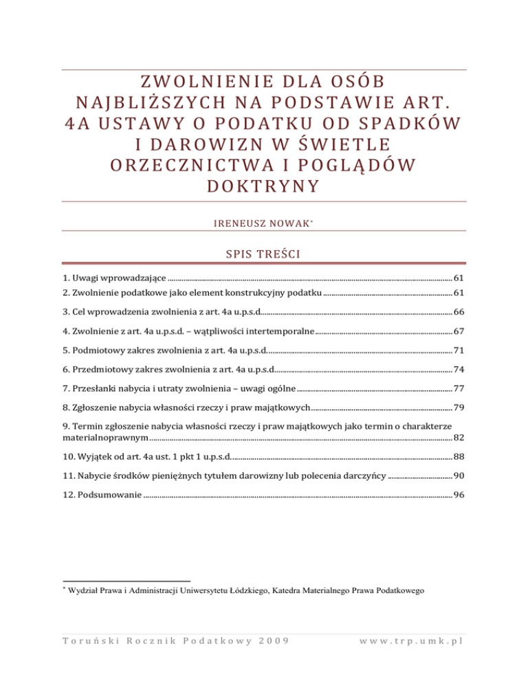 ZWOLNIENIE DLA OSÓB NAJBLIŻSZYCH NA PODSTAWIE ART. 4A USTAWY O PODATKU OD SPADKÓW I DAROWIZN W ŚWIETLE ORZECZNICTWA I POGLĄDÓW DOKTRYNY IRENEUSZ NOWAK SPIS TREŚCI 1. Uwagi wprowadzające ............................................................................................................................................. 61 2. Zwolnienie podatkowe jako element konstrukcyjny podatku ................................................................ 61 3. Cel wprowadzenia zwolnienia z art. 4a u.p.s.d............................................................................................... 66 4. Zwolnienie z art. 4a u.p.s.d. – wątpliwości intertemporalne .................................................................... 67 5. Podmiotowy zakres zwolnienia z art. 4a u.p.s.d. ........................................................................................... 71 6. Przedmiotowy zakres zwolnienia z art. 4a u.p.s.d. ....................................................................................... 74 7. Przesłanki nabycia i utraty zwolnienia – uwagi ogólne ............................................................................. 77 8. Zgłoszenie nabycia własności rzeczy i praw majątkowych ...................................................................... 79 9. Termin zgłoszenie nabycia własności rzeczy i praw majątkowych jako termin o charakterze materialnoprawnym ...................................................................................................................................................... 82 10. Wyjątek od art. 4a ust. 1 pkt 1 u.p.s.d. ............................................................................................................. 88 11. Nabycie środków pieniężnych tytułem darowizny lub polecenia darczyńcy ................................ 90 12. Podsumowanie ......................................................................................................................................................... 96 Wydział Prawa i Administracji Uniwersytetu Łódzkiego, Katedra Materialnego Prawa Podatkowego Toruński Rocznik Podatkowy 2009 www.trp.umk.pl 1. UWAGI WPROWADZAJĄCE Z dniem 1 stycznia 2007 r. zaczął obowiązywać art. 4a ustawy o podatku od spadków i darowizn164, w którym uregulowane jest zwolnienie podatkowe dla osób najbliższych tj. małżonka, wstępnych, zstępnych, pasierba, rodzeństwo, ojczyma i macochy. Biorąc pod uwagę ponad 5-letni okres funkcjonowania tego przepisu, warto poddać analizie problemy, jakie wyłoniły się na tle obowiązywania tego zwolnienia. W opracowaniu zostanie w szczególności zaprezentowane, jakie poglądy w zakresie wykładni art. 4a u.p.s.d. formułowały organy podatkowe, sądy i przedstawiciele doktryny. Aby poglądy te poddać analizie, należy w pierwszym rzędzie wskazać na właściwe rozumienie i rozróżnianie elementów konstrukcyjnych podatku, w szczególności zwolnień i ulg podatkowych, które - jak to zostanie niżej wykazane - nie stanowią przywilejów podatkowych, które należy interpretować w sposób ścisły. W opracowaniu ponadto omówiono cel wprowadzenia zwolnienia podatkowego z art. 4a u.p.s.d., jego podmiotowy i przedmiotowy zakres, wątpliwości intertemporalne oraz przesłanki nabycia i utraty zwolnienia. 2. ZWOLNIENIE PODATKOWE JAKO ELEMENT KONSTRUKCYJNY PODATKU Konstrukcja podatku, jako daniny publicznej o charakterze pieniężnym, składa się z elementów podstawowych (samoistnych), do których zaliczamy podmiot podatku, przedmiot podatku, podstawę opodatkowania i stawki podatkowe, oraz elementów dodatkowych (niesamoistnych), m.in. ulg, zwolnień i wyłączeń165. 164 Tekst jednolity: Dz. U. z 2009 r., Nr 93, poz. 768 ze zm.; dalej u.p.s.d. W. Nykiel (red.), W. Chróścielewski, K. Koperkiewicz-Mordel, M. Sęk, M. Wilk, Polskie prawo podatkowe. Podręcznik akademicki, Warszawa 2011, s. 13; L. Etel (red.), R. Dowgier, G. Liszewski, M. Popławski, S. Presnarowicz, Prawo podatkowe, Warszawa 2005, s. 27; A. Gomułowicz, J. Małecki, Podatki i prawo podatkowe, Warszawa 2010, s. 117. 165 61 Toruński Rocznik Podatkowy 2012 www.trp.umk.pl Zwolnienia podatkowe są ograniczaniem zakresu kwalitatywnych (jakościowych) elementów konstrukcji podatku (podmiotu i przedmiotu opodatkowania)166, czyli stanowią „formę redukcji (…) zakresu podmiotowego (zwolnienia podmiotowe) bądź przedmiotowego (zwolnienia przedmiotowe)”167. Ponadto w piśmiennictwie zauważa się, że „ze zwolnieniem podatkowym mamy do czynienia wówczas, gdy określona kategoria stanów faktycznych bądź prawnych mieści się w ogólnych ramach przedmiotowo-podmiotowych podatku, ale przepis prawa wyłącza w sposób wyraźny od opodatkowania”168. Powyższa analiza wskazuje, że zwolnienia podatkowe to „definitywne wyłączenie określonej przepisami kategorii podmiotów i przedmiotów spod opodatkowania”169. Biorąc pod uwagę konstrukcję podatku, należy podkreślić, iż bez elementów podstawowych norma podatkowoprawna nie może funkcjonować, w przeciwieństwie do elementów wtórnych (niesamoistnych), jakimi są zwolnienia podatkowe czy też ulgi podatkowe170. Tym samym zwolnienie podatkowe, analogicznie jak ulga podatkowa, nie stanowi stałego (obligatoryjnego, samoistnego) elementu struktury podatku. Jak przyjmuje się w doktrynie „instytucja zwolnień (…) jest szeroko wykorzystywana przez naszego ustawodawcę, podobnie jak przez ustawodawców innych państw, w przepisach odnoszących się do wielu podatków. Jednakże dla bytu konstrukcji podatku zwolnienia nie są niezbędne. Można sobie bowiem wyobrazić podatek, w którym nie występują zwolnienia”171. Jednakże z momentem wprowadzenia ich do konstrukcji danego podatku będą miały wpływ na wysokość ciężaru podatkowego, będąc pomimo swego niesamoistnego charakteru elementem normy podatkowoprawnej172. W związku z powyższym należy przyjąć za A. Mariańskim, że