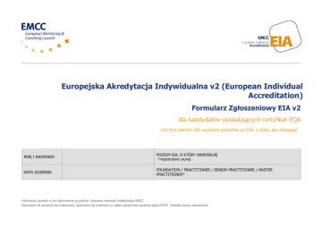 Europejska Akredytacja Indywidualna v2 (European Individual Accreditation) Formularz Zgłoszeniowy EIA v2 dla kandydatów posiadających certyfikat EQA (na tym samym lub wyższym poziomie co EIA, o który się ubiegają) IMIĘ I NAZWISKO DATA ZŁOŻENIA POZIOM EIA, O KTÓRY WNIOSKUJĘ *niepotrzebne usunąć FOUNDATION / PRACTITIONER / SENIOR PRACTITIONER / MASTER PRACTITIONER* Informacje zawarte w tym dokumencie są poufne i stanowią własność intelektualną EMCC. Dokument nie powinien być kopiowany, ujawniany lub omawiany w żaden sposób bez wyraźnej zgody EMCC. Wszelkie prawa zastrzeżone. EIA v2 Przewodnik Kandydata dla osób posiadających certyfikat EQA oraz Struktura Kompetencji EMCC pomogą Ci wypełnić niniejszy formularz. Jeśli posiadasz certyfikat EQA na poziomie niższym niż poziom EIA, o który wnioskujesz, korzystaj z Przewodnika Kandydata EIA v2 dla kandydatów nieposiadających certyfikatu EQA oraz złóż Formularz Zgłoszeniowy EIA v2 dla kandydatów nieposiadających certyfikatu EQA. Uwaga: „posiadacze certyfikatu EQA”, którzy otrzymali go (na tym samym lub wyższym poziomie co akredytacja EIA, o którą się starają) na więcej niż 24 miesiące przed złożeniem wniosku o EIA, muszą także złożyć dziennik refleksji. Można go otrzymać od lokalnych dyrektorów akredytacji w Niemczech, Holandii, Szwecji oraz Wielkiej Brytanii lub (w przypadku innych krajów) pobrać ze strony internetowej EMCC. Twój wniosek (który musi być opatrzony spisem treści z wyraźnie oznaczonymi częściami poprzez indeksowanie, numery stron, etykiety i załączniki) powinien odzwierciedlać strukturę niniejszego formularza. 1. Dane osobowe 2. Praktyka 3. Rozwój zawodowy 4. Dowody kwalifikacji EQA 5. Deklaracja 6. Lista kontrolna © EMCC Maj 2012 Europejska Akredytacja Indywidualna (EIA) v2 Formularz zgłoszeniowy dla kandydatów posiadających certyfikat EQA Strona 2 z 11 1. Dane osobowe Imię i Nazwisko Adres Numer telefonu Numer telefonu komórkowego Adres E-mail Faks Internet Data przystąpienia do EMCC Do jakich innych organizacji należysz? Z jakimi tematami/wątkami najczęściej pracujesz jako coach/mentor? Opisz typy klientów, z którymi najczęściej pracujesz © EMCC Maj 2012 Europejska Akredytacja Indywidualna (EIA) v2 Formularz zgłoszeniowy dla kandydatów posiadających certyfikat EQA Strona 3 z 11 Oświadczenie osobiste (wraz z odniesieniem się do Kodeksu Etyki i Oświadczenia o Różnorodności) OŚWIADCZENIE OSOBISTE [Tu wprowadź tekst – 300-500 słów] Prosimy także o załączenie kopii aktualnego życiorysu. © EMCC Maj 2012 Europejska Akredytacja Indywidualna (EIA) v2 Formularz zgłoszeniowy dla kandydatów posiadających certyfikat EQA Strona 4 z 11 2. Praktyka 2.1 Okres doświadczenia OKRES DOŚWIADCZENIA [Tu wprowadź tekst] 2.2 Liczba godzin konsultacji z klientami i liczba klientów DATA (OD-DO) KLIENT TYP ORGANIZACJI KLIENTA/ NAZWA STANOWISKO KLIENTA LICZBA GODZIN PRZEPRACOWANY ZAKRES SPRAW KOMENTARZ EGZAMINATORA [w razie potrzeby wprowadź więcej wierszy] Całkowita liczba godzin Całkowita liczba Klientów 2.3 Informacje zwrotne od Klientów (wymaganych jest 5 informacji) Informacje zwrotne od klientów znajdują się w załącznikach do wniosku © EMCC Maj 2012 Tak/Nie Europejska Akredytacja Indywidualna (EIA) v2 Formularz zgłoszeniowy dla kandydatów posiadających certyfikat EQA Strona 5 z 11 3. Rozwój zawodowy OPISZ SWOJE PODEJŚCIE DO USTAWICZNEGO ROZWOJU ZAWODOWEGO NA PRZESTRZENI OSTATNICH 12 MIESIĘCY [Tu wprowadź tekst] 3.1 Ustawiczny Rozwój Zawodowy – wykaz godzin DATA LICZBA GODZIN WYDARZENIE/DZIAŁANIE KOMPETENCJE OBJĘTE KSZTAŁCENIEM KOMENTARZ EGZAMINATORA [w razie potrzeby wprowadź więcej wierszy] Całkowita liczba godzin © EMCC Maj 2012 Europejska Akredytacja Indywidualna (EIA) v2 Formularz zgłoszeniowy dla kandydatów posiadających certyfikat EQA Strona 6 z 11 3.2 Superwizja mentora/coacha - wykaz godzin DATA LICZBA GODZIN RODZAJ KOMPETENCJE OBJĘTE KSZTAŁCENIEM KOMENTARZ EGZAMINATORA [w razie potrzeby wprowadź więcej wierszy] Całkowita liczba godzin superwizji (ostatnie 12 miesięcy) Całkowita liczba godzin mentoringu/coachingu (ostatnie 12 miesięcy) Stosunek superwizji do wykonanego mentoringu/coachingu (ostatnie 12 miesięcy) – superwizja : mentoring/coaching Imię i nazwisko superwizora : Podpis superwizora: Data: [Opisz szczegóły dotyczące kwalifikacji i/lub doświadczenia superwizora] Komentarz superwizora [Tu wprowadź tekst] © EMCC Maj 2012 Europejska Akredytacja Indywidualna (EIA) v2 Formularz zgłoszeniowy dla kandydatów posiadających certyfikat EQA Strona 7 z 11 3.3 Wkład w rozwój zawodu (tylko dla kandydatów do akredytacji Master Practitioner) DATA DZIAŁANIE W JAKI SPOSÓB DZIAŁANIE PRZYCZYNIŁO SIĘ DO ROZWOJU MENTORINGU/COACINGU KOMENTARZ EGZAMINATORA [w razie potrzeby wprowadź więcej wierszy] © EMCC Maj 2012 Europejska Akredytacja Indywidualna (EIA) v2 Formularz zgłoszeniowy dla kandydatów posiadających certyfikat EQA Strona 8 z 11 4. Dowody kwalifikacji EQA Jako kandydat posiadający certyfikat akredytowanego przez Europejską Nagrodę Jakości programu szkoleniowego („Organizacja udzielająca EQA” – „EQA Provider”) dotyczącego coachingu/mentoringu (na tym samym lub wyższym poziomie, co akredytacja, o którą się ubiegasz), nie jesteś zobowiązany do przedstawienia dowodów kompetencji poprzez studia przypadku i/lub Strukturę Kompetencji EMCC. Jesteś jedynie zobowiązany/a do przedstawienia szczegółów dotyczących ukończonego szkolenia oraz do załączenia do wniosku kopii dyplomu/certyfikatu. Certyfikat/dyplom EQA DATA ORGANIZACJA UDZIELAJĄCA EQA © EMCC Maj 2012 POZIOM MIEJSCE NAZWA PROGRAMU SZKOLENIOWEGO KOMENTARZ EGZAMINATORA Europejska Akredytacja Indywidualna (EIA) v2 Formularz zgłoszeniowy dla kandydatów posiadających certyfikat EQA Strona 9 z 11 5. Deklaracja Oświadczam, że informacje zawarte w złożonym przeze mnie wniosku są prawd