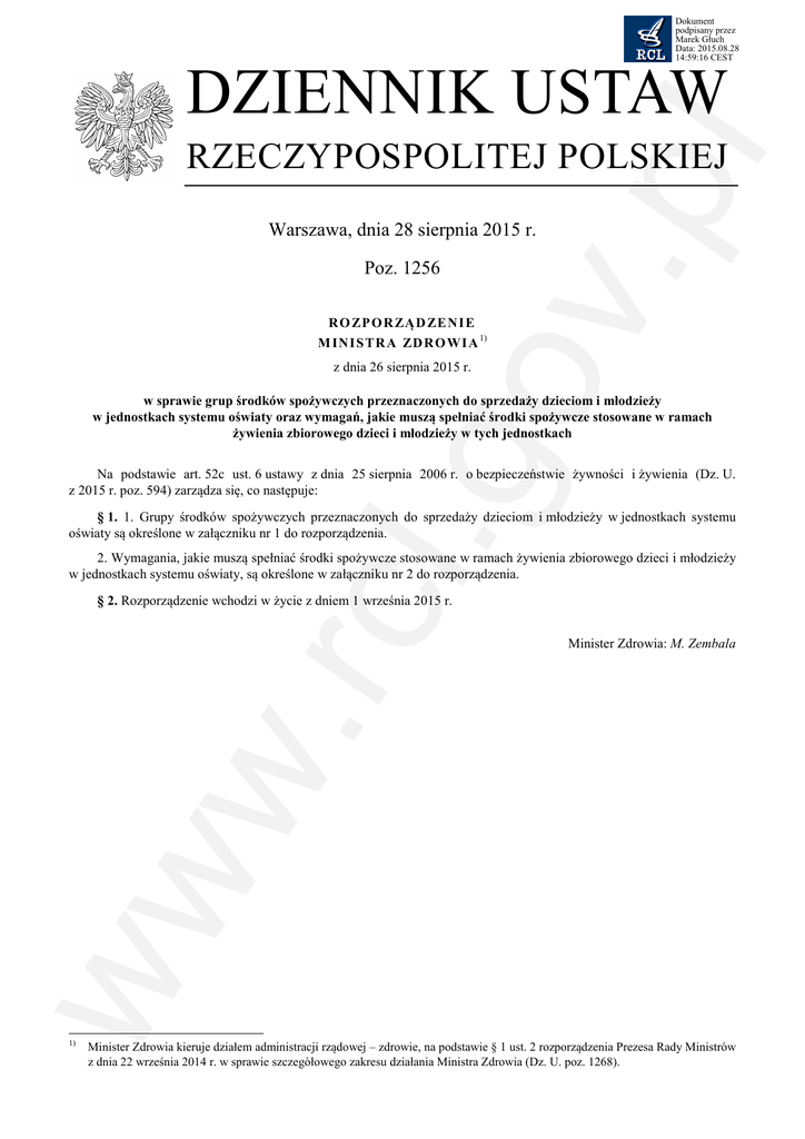 Dokument podpisany przez Marek Głuch Data: 2015.08.28 14:59:16 CEST l.g ov .pl DZIENNIK USTAW RZECZYPOSPOLITEJ POLSKIEJ Warszawa, dnia 28 sierpnia 2015 r. Poz. 1256 RO ZP O R ZĄ D ZE N I E M INI S TR A ZD RO WI A 1) z dnia 26 sierpnia 2015 r. w sprawie grup środków spożywczych przeznaczonych do sprzedaży dzieciom i młodzieży w jednostkach systemu oświaty oraz wymagań, jakie muszą spełniać środki spożywcze stosowane w ramach żywienia zbiorowego dzieci i młodzieży w tych jednostkach Na podstawie art. 52c ust. 6 ustawy z dnia 25 sierpnia 2006 r. o bezpieczeństwie żywności i żywienia (Dz. U. z 2015 r. poz. 594) zarządza się, co następuje: § 1. 1. Grupy środków spożywczych przeznaczonych do sprzedaży dzieciom i młodzieży w jednostkach systemu oświaty są określone w załączniku nr 1 do rozporządzenia. w. rc 2. Wymagania, jakie muszą spełniać środki spożywcze stosowane w ramach żywienia zbiorowego dzieci i młodzieży w jednostkach systemu oświaty, są określone w załączniku nr 2 do rozporządzenia. ww § 2. Rozporządzenie wchodzi w życie z dniem 1 września 2015 r. 1) Minister Zdrowia: M. Zembala Minister Zdrowia kieruje działem administracji rządowej – zdrowie, na podstawie § 1 ust. 2 rozporządzenia Prezesa Rady Ministrów z dnia 22 września 2014 r. w sprawie szczegółowego zakresu działania Ministra Zdrowia (Dz. U. poz. 1268). Dziennik Ustaw –2– Poz. 1256 l.g ov .pl Załączniki do rozporządzenia Ministra Zdrowia z dnia 26 sierpnia 2015 r. (poz. 1256) Załącznik nr 1 GRUPY ŚRODKÓW SPOŻYWCZYCH PRZEZNACZONYCH DO SPRZEDAŻY DZIECIOM I MŁODZIEŻY W JEDNOSTKACH SYSTEMU OŚWIATY 1. Kanapki: 1) na bazie pieczywa razowego lub pełnoziarnistego: żytniego, pszennego, mieszanego lub pieczywa bezglutenowego; 2) z przetworami mięsnymi zawierającymi co najmniej 70% mięsa i nie więcej niż 10 g tłuszczu w 100 g produktu gotowego do spożycia lub przetworami z ryb zawierającymi co najmniej 60% mięsa ryb, skorupiaków lub mięczaków w 100 g produktu gotowego do spożycia, lub jajami, lub serem, z wyłączeniem topionego, lub wyrobami z nasion roślin strączkowych, orzechami, nasionami zgodnie z wymaganiami, o których mowa w ust. 9, olejem, tłuszczami mlecznymi do smarowania, o których mowa w rozporządzeniu Parlamentu Europejskiego i Rady (UE) nr 1308/2013 z dnia 17 grudnia 2013 r. ustanawiającym wspólną organizację rynków produktów rolnych oraz uchylającym rozporządzenia Rady (EWG) nr 922/72, (EWG) nr 234/79, (WE) nr 1037/2001 i (WE) nr 1234/2007 (UE) nr 1308/2013 (Dz. Urz UE L 347 z 20.12.2013, str. 671, z późn. zm.), w tym masłem, ziołami lub przyprawami świeżymi lub suszonymi bez dodatku soli; 3) z warzywami lub owocami, o których mowa w ust. 7–9; 4) bez soli oraz sosów, w tym majonezu, z wyłączeniem ketchupu, w przypadku którego zużyto nie mniej niż 120 g pomidorów do przygotowania 100 g produktu gotowego do spożycia. 2. Sałatki i surówki w opakowaniach jednostkowych: na bazie warzyw lub owoców, o których mowa w ust. 7 i 8; 2) z przetworami mięsnymi zawierającymi co najmniej 70% mięsa i nie więcej niż 10 g tłuszczu w 100 g produktu gotowego do spożycia lub przetworami z ryb zawierającymi co najmniej 60% mięsa ryb, skorupiaków lub mięczaków w 100 g produktu gotowego do spożycia, lub jajami, lub serem, z wyłączeniem topionego, lub produktami mlecznymi zgodnymi z wymaganiami, o których mowa w ust. 5, lub produktami zbożowymi zgodnymi z wymaganiami, o których mowa w ust. 6, wyrobami z nasion roślin strączkowych, suszonymi warzywami i owocami, lub orzechami oraz nasionami zgodnymi z wymaganiami, o których mowa w ust. 9, olejem, ziołami lub przyprawami świeżymi lub suszonymi bez dodatku soli. w. rc 1) 3. Mleko bez dodatku cukrów i substancji słodzących zdefiniowanych w rozporządzeniu Parlamentu Europejskiego i Rady (WE) nr 1333/2008 z dnia 16 grudnia 2008 r. w sprawie dodatków do żywności (Dz. Urz. UE L 354 z 31.12.2008, str. 16, z późn. zm.), zwanym dalej „rozporządzeniem (WE) nr 1333/2008”. 4. Napoje zastępujące mleko, czyli napój: sojowy, ryżowy, owsiany, kukurydziany, gryczany, orzechowy lub migdałowy: 1) 2) zawierające nie więcej niż 10 g cukrów w 100 ml produktu gotowego do spożycia, bez dodatku substancji słodzących zdefiniowanych w rozporządzeniu (WE) nr 1333/2008; o niskiej zawartości sodu/soli, tj. zawierające nie więcej niż 0,12 g sodu lub równoważnej ilości soli na 100 g lub na 100 ml środka spożywczego lub o obniżonej zawartości sodu/soli, tj. obniżenie zawartości sodu lub wartości równoważnej dla soli wynosi co najmniej 25% w porównaniu z podobnym produktem. ww 5. Produkty mleczne: jogurt, kefir, maślanka, mleko zsiadłe, mleko acidofilne, mleko smakowe, serwatka, ser twarogowy, serek homogenizowany lub produkty zastępujące produkty mleczne na bazie soi, ryżu, owsa, orzechów lub migdałów: 1) zawierające nie więcej niż 10 g cukrów w 100 g/ml produktu gotowego do spożycia; 2) bez dodatku substancji słodzących zdefiniowanych w rozporządzeniu (WE) nr 1333/2008; 3) zawierające nie więcej niż 10 g tłuszczu w 100 g/ml produktu gotowego do spożycia. 6. Zbożowe produkty śniadaniowe oraz inne produkty zbożowe: 1) bez dodatku cukrów i substancji słodzących zdefiniowanych w rozporządzeniu (WE) nr 1333/2008; 2) o niskiej zawartości sodu/soli, tj. zawierające nie więcej niż 0,12 g sodu lub równoważnej ilości soli na 100 g lub na 100 ml środka spożywczego lub o obniżonej zawartości sodu/soli, tj. obniżenie zawartości sodu lub wartości równoważnej dla soli wynosi co najmniej 25% w porównaniu z podobnym produktem, z wyłączeniem pieczywa o zawartości sodu nie wyższej niż 450 mg w 100 g produktu gotowego do spożycia. Dziennik Ustaw –3– Poz. 1256 7. Warzywa: surowe lub przetworzone, z wyłączeniem warzyw suszonych; 2) bez dodatku cukrów i substancji słodzących zdefiniowanych w rozpor
