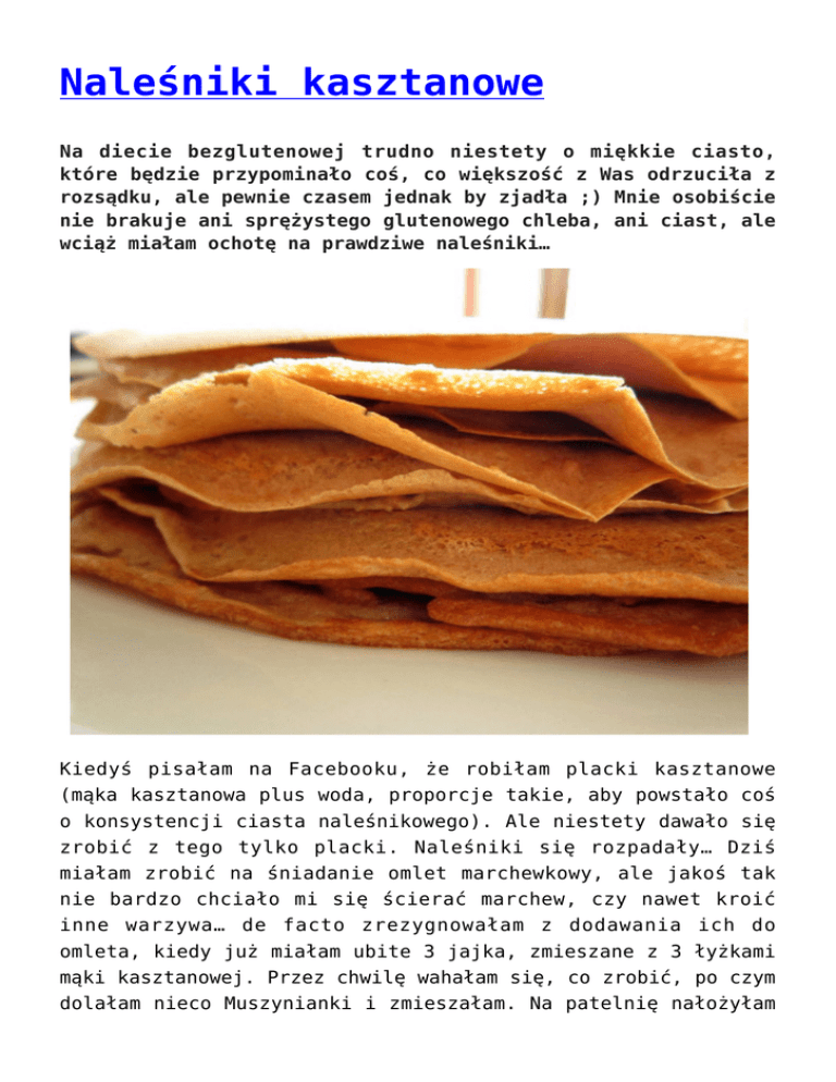 Naleśniki kasztanowe Na diecie bezglutenowej trudno niestety o miękkie ciasto, które będzie przypominało coś, co większość z Was odrzuciła z rozsądku, ale pewnie czasem jednak by zjadła ;) Mnie osobiście nie brakuje ani sprężystego glutenowego chleba, ani ciast, ale wciąż miałam ochotę na prawdziwe naleśniki… Kiedyś pisałam na Facebooku, że robiłam placki kasztanowe (mąka kasztanowa plus woda, proporcje takie, aby powstało coś o konsystencji ciasta naleśnikowego). Ale niestety dawało się zrobić z tego tylko placki. Naleśniki się rozpadały… Dziś miałam zrobić na śniadanie omlet marchewkowy, ale jakoś tak nie bardzo chciało mi się ścierać marchew, czy nawet kroić inne warzywa… de facto zrezygnowałam z dodawania ich do omleta, kiedy już miałam ubite 3 jajka, zmieszane z 3 łyżkami mąki kasztanowej. Przez chwilę wahałam się, co zrobić, po czym dolałam nieco Muszynianki i zmieszałam. Na patelnię nałożyłam olej kokosowy i wlałam ciasto. Pierwszy był naleśnik w drodze :D Szybko okazało się, że ciasto takie zachowuje się dokładnie jak ciasto pszenne, jest miękkie, łatwo się zwija w rulon, w dodatku jeśli nie dodamy do środka oleju i podsmażymy, czy też raczej podsuszymy na małym ogniu na patelni bez tłuszczu (lub lepiej po tym, jak pierwsze naleśniki zbiorą już cały tłuszcz), otrzymamy sztywne, chrupiące andruty, które nieco przypominają smakiem te prawdziwe :) A żeby to wszystko ładnie zebrać do kupy… ;) Składniki: 3 jajka 3 łyżki mąki kasztanowej ok.150-200 ml wody gazowanej Jajka ubij, dodaj do mąki powoli mieszając, dolej wody, smaż naleśniki lub susz andruty ;) Smacznego :)