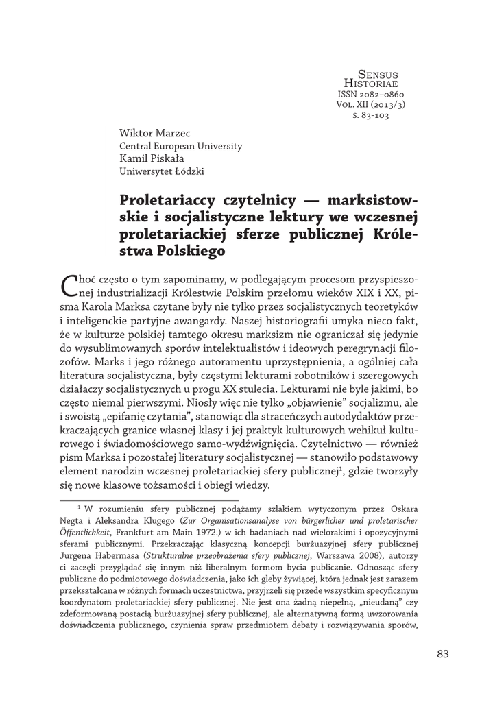 SENSUS HISTORIAE ISSN 2082–0860 Vol. XII (2013/3) s. 83-103 Wiktor Marzec Central European University Kamil Piskała Uniwersytet Łódzki Proletariaccy czytelnicy — marksistowskie i socjalistyczne lektury we wczesnej proletariackiej sferze publicznej Królestwa Polskiego C hoć często o tym zapominamy, w podlegającym procesom przyspieszonej industrializacji Królestwie Polskim przełomu wieków XIX i XX, pisma Karola Marksa czytane były nie tylko przez socjalistycznych teoretyków i inteligenckie partyjne awangardy. Naszej historiografii umyka nieco fakt, że w kulturze polskiej tamtego okresu marksizm nie ograniczał się jedynie do wysublimowanych sporów intelektualistów i ideowych peregrynacji filozofów. Marks i jego różnego autoramentu uprzystępnienia, a ogólniej cała literatura socjalistyczna, były częstymi lekturami robotników i szeregowych działaczy socjalistycznych u progu XX stulecia. Lekturami nie byle jakimi, bo często niemal pierwszymi. Niosły więc nie tylko „objawienie” socjalizmu, ale i swoistą „epifanię czytania”, stanowiąc dla straceńczych autodydaktów przekraczających granice własnej klasy i jej praktyk kulturowych wehikuł kulturowego i świadomościowego samo-wydźwignięcia. Czytelnictwo — również pism Marksa i pozostałej literatury socjalistycznej — stanowiło podstawowy element narodzin wczesnej proletariackiej sfery publicznej1, gdzie tworzyły się nowe klasowe tożsamości i obiegi wiedzy. 1 W rozumieniu sfery publicznej podążamy szlakiem wytyczonym przez Oskara Negta i Aleksandra Klugego (Zur Organisationsanalyse von bürgerlicher und proletarischer Öffentlichkeit, Frankfurt am Main 1972.) w ich badaniach nad wielorakimi i opozycyjnymi sferami publicznymi. Przekraczając klasyczną koncepcji burżuazyjnej sfery publicznej Jurgena Habermasa (Strukturalne przeobrażenia sfery publicznej, Warszawa 2008), autorzy ci zaczęli przyglądać się innym niż liberalnym formom bycia publicznie. Odnosząc sfery publiczne do podmiotowego doświadczenia, jako ich gleby żywiącej, która jednak jest zarazem przekształcana w różnych formach uczestnictwa, przyjrzeli się przede wszystkim specyficznym koordynatom proletariackiej sfery publicznej. Nie jest ona żadną niepełną, „nieudaną” czy zdeformowaną postacią burżuazyjnej sfery publicznej, ale alternatywną formą uwzorowania doświadczenia publicznego, czynienia spraw przedmiotem debaty i rozwiązywania sporów, 83 Wiktor Marzec, Kamil Piskała Często to właśnie nad socjalistyczną książką albo podczas dyskusji z agitatorem przedstawiającym zręby teorii wartości dodatkowej, robotnik stawał się podmiotem politycznym par excellence — tworzył prosty model struktury społecznej, sytuował się w jego obrębie i pojmował sens zaangażowania w zmianę istniejącego status quo. Lecz praktyka emancypacyjna obecna była również, a może nawet przede wszystkim, poza takim wymiarem bezpośredniego „uświadomienia” politycznego. W akcie lektury, w najpełniejszy sposób symbolizującym dążenie do przekroczenia granic własnej klasy, praktyka emancypacyjna realizowała się w wykroczeniu poza przewidziane dla siebie miejsce w systemie produkcji, rodzącym się poczuciu godności i kolektywnej sprawczości. Robotnik, poszukujący w lekturze raczej wiedzy i zrozumienia świata, niż chwilowej rozrywki, przestawał być biernym elementem struktury społecznej, nagim, biologicznym życiem, które nie tylko nie ma prawa zabrać politycznego głosu, ale po prostu go nie artykułuje. Odzyskiwał na powrót swoje człowieczeństwo, którego pozbawiał go, zgodnie ze złowrogą prognozą Marksa z Rękopisów ekonomiczno-filozoficznych z 1844 roku2, późnodziewiętnastowieczny kapitalizm. W takiej lekturze empirycznie niejako realizowało się to, co potem stało się postulatem epistemologicznym brytyjskich marksistowskich historyków — to już nie klasa jest podstawową analitycznie wyodrębnialną rzeczywistością, a raczej doświadczanie klasowości, i akt posiadającą własną, odrębną genealogię i zasady organizacji. Wbrew Habermasowi, Negt i Kluge wskazują na nieprzygodną rolę wykluczenia w burżuazyjnej sferze publicznej, a także na jej materialne warunki możliwości (kapitalistyczne stosunki produkcji itd.). Podobnie materialnie zakorzenione są też proletariackie sfery publiczne. Takie ujęcie pokazuje też godne generalizacji demokratyczne aspekty alternatywnych sfer publicznych. Ich podbudowy nie stanowi abstrakcyjna idea uniwersalności, ale materialne struktury wytwarzające historyczne idee sfer publicznych, gdzie doświadczeniowy horyzont wykluczonej publicznie grupy może być reprezentowany. Tryby rozumowania, reprezentacji doświadczenia, odnoszenia własnej ekspresji do szerszej społecznej całości zakorzenione są w kontekście życia (Lebenszusammenhang), który zarazem jest performatywnie przekształcany w praktykach publicznego uczestnictwa. W tym świetle chcemy zobaczyć swoistą fenomenologię proletariackiego czytelnictwa, które — na co wskazują liczne świadectwa biograficzne — miało olbrzymia rolę w przekształceniu organizacji podmiotowego doświadczenia, odnoszenia wiedzy do świata, komunikowania i praktyk konstytuujących kulturową realność podziałów klasowych. 2 „Produkcja nie tylko wytwarza człowieka w postaci towaru, człowieka-towar, człowieka z przeznaczeniem towaru; wytwarza go zgodnie z tym przeznaczeniem, jako istotę odczłowieczoną zarówno duchowo, jak i fizycznie. Zepsucie, zwyrodnienie, tępota robotników i kapitalistów. Jej produktem jest towar świadomy sam siebie i zdolny do samodzielnej działalności… człowiek-towar…” (K. Marks, Rękopisy ekonomiczno-filozoficzne z 1844 r., [w:] K. Marks, F.Engels, Dzieła, t. 1, Warszawa 1960, s. 562). 84 Proletariaccy czytelnicy — marksistowskie i socjalistyczne lektury... przekraczania jej granic. Doświadczenie3 owo warte jest opis