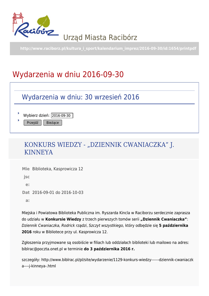 Urząd Miasta Racibórz http://www.raciborz.pl/kultura_i_sport/kalendarium_imprez/2016-09-30/id:1654/printpdf Wydarzenia w dniu 2016-09-30 Wydarzenia w dniu: 30 wrzesień 2016 Wybierz dzień: 2016-09-30 Przejdź Bieżące KONKURS WIEDZY - „DZIENNIK CWANIACZKA” J. KINNEYA Mie Biblioteka, Kasprowicza 12 jsc e: Dat 2016-09-01 do 2016-10-03 a: Miejska i Powiatowa Biblioteka Publiczna im. Ryszarda Kincla w Raciborzu serdecznie zaprasza do udziału w Konkursie Wiedzy z trzech pierwszych tomów serii „Dziennik Cwaniaczka”: Dziennik Cwaniaczka, Rodrick rządzi, Szczyt wszystkiego, który odbędzie się 5 października 2016 roku w Bibliotece przy ul. Kasprowicza 12. Zgłoszenia przyjmowane są osobiście w filiach lub oddziałach biblioteki lub mailowo na adres: [email protected] w terminie do 3 października 2016 r. szczegóły: http://www.biblrac.pl/pl/site/wydarzenie/1129-konkurs-wiedzy------dziennik-cwaniaczk a----j-kinneya-.html RODZINNY KONKURS WIEDZY - „KUBUŚ PUCHATEK” A.A. MILNE Mie Biblioteka, Kasprowicza 12 jsc e: Dat 2016-09-01 do 2016-10-22 a: Miejska i Powiatowa Biblioteka Publiczna im. Ryszarda Kincla w Raciborzu serdecznie zaprasza do udziału w cyklicznym konkursie literackim „Czytał dziadek, czytał tata, czytasz ty?”. Pytania konkursowe pochodzić będą z książki „Kubuś Puchatek” A.A. Milne’a. Uczestnikiem Konkursu może być drużyna rodzinna dwu lub trzyosobowa, w której skład wchodzi co najmniej jedno dziecko w wieku do 16 lat. Zgłoszenia do Konkursu przyjmujemy do 19 października 2016 r. w oddziałach i filiach biblioteki. Konkurs odbędzie się 22 października 2016 r. (sobota) o godz. 10.00 w EURECE – Wypożyczalni dla Dzieci i Młodzieży MiPBP w Raciborzu przy ul. Kasprowicza 12. szczegóły: http://www.biblrac.pl/pl/site/wydarzenie/1131-rodzinny-konkurs-wiedzy------kubus-pu chatek----aa-milne.html OGÓLNOPOLSKI KONKURS PLASTYCZNY „KUBUŚ PUCHATEK I INNE MISIE” Mie Biblioteka, Kasprowicza 12 jsc e: Dat 2016-09-01 do 2016-11-03 a: Miejska i Powiatowa Biblioteka Publiczna im. Ryszarda Kincla w Raciborzu serdecznie zaprasza do udziału w Ogólnopolskim Konkursie Plastycznym pod hasłem „Kubuś Puchatek i inne misie”. Tematem konkursu jest wykonanie: ilustracji tematycznie związanej z postacią Kubusia Puchatka lub innego literackiego misia pracy komputerowej tematycznie związanej z postacią Kubusia Puchatka lub innego literackiego misia kukiełki tematycznie związanej z postacią Kubusia Puchatka lub innego literackiego misia pacynki tematycznie związanej z postacią Kubusia Puchatka lub innego literackiego misia Dla laureatów pięciu kategorii przewidziano nagrody. Prace wraz z dokumentami należy składać do 21 października 2016 r. w filiach i odziałach biblioteki. Finał odbędzie się 3 listopada o godz. 16.00 w bibliotece przy ul. Kasprowicza 12. szczegóły: http://www.biblrac.pl/pl/site/wydarzenie/1130-ogolnopolski-konkurs-plastyczny----kub us-puchatek-i-inne-misie---.html PILNIE POSZUKIWANY ŚWIĘTY MIKOŁAJ! Mie Muzeum w Raciborzu ul. Rzeźnicza 15 jsc e: Dat 2016-09-15 do 2016-10-15 a: Muzeum w Raciborzu organizuje w listopadzie 2016 r. wystawę „Gdzie jest święty Mikołaj? Św. Mikołaj w kulturze masowej XX i XXI wieku”. Przypuszczamy, że w każdym domu znajdują się pamiątki związane z tym popularnym Świętym. Dlatego zwracamy się do Państwa z prośbą o wypożyczenie na czas trwania wystawy (listopad 2016-styczeń 2017) przedmiotów przedstawiających św. Mikołaja. Mogą to być np.: fotografie ze spotkań ze św. Mikołajem listy dzieci do św. Mikołaja bombki choinkowe w kształcie św. Mikołaja maskotki bibeloty ceramika tekstylia Odbiór obiektów w Muzeum w Raciborzu ul. Rzeźnicza 15 od 15 września do 15 października 2016 r. w godzinach 800 – 1600 . Przedmioty te zostaną po zakończeniu wystawy zwrócone właścicielom. Liczymy na Państwa przychylność i zaangażowanie! Wypożyczający będą honorowymi gośćmi na wernisażu wystawy 4 listopada 2016 r. FOTO-KONFRONTACJE Mie Galeria GAWRA, Kasprowicza 12 jsc e: Go 16:00 dzi na: Dat 2016-09-15 do 2016-09-30 a: Wystawa prezentuje fragmenty fotograficznych projektów dyplomowych absolwentów raciborskiego Liceum Plastycznego - rocznik 2012-2016. Ekspozycja obejmuje szerokie spektrum tematyczne (dokument fotograficzny, fotografię artystyczną, formy użytkowe i naukowe rozwiązania) i techniczne od klasycznej fotografii srebrowej po rozwiązania cyfrowe. Prace wykonane zostały pod kierunkiem dr Gabrieli Habrom-Rokosz. Zapraszamy na spotkanie z twórcami wystawy, które odbędzie się 15 września o godz. 16.00 w Galerii GAWRA. Wystawę FOTO-KONFRONTACJE można oglądać do końca września. TYDZIEŃ KSIĄŻEK ZAKAZANYCH Mie Oddziały i filie biblioteki w Raciborzu jsc e: Dat 2016-09-26 do 2016-09-30 a: Tydzień Zakazanych Książek - wydarzenie organizowane od 1982 przez Amerykańskie Stowarzyszenie Bibliotekarzy, które ma na celu upublicznienie debaty o wolności słowa, tolerancji i prawa do wygłaszania własnych opinii. Do akcji tradycyjnie już przyłączy się raciborska biblioteka, organizując wystawę książek zakazanych wraz z krótkimi opisami „przewinień” przez nie popełnionych. W poszczególnych filiach zaplanowano także lekcje biblioteczne. DYSKUSYJNY KLUB KSIĄŻKI DLA MŁODZIEŻY Mie Biblioteka, Kasprowicza 12 jsc e: Go 16:00 dzi na: Dat 2016-09-30 do 2016-09-30 a: Zapraszamy na kolejne spotkanie w ramach Dyskusyjnego Klubu Książki dla Młodzieży. Wrześniowe spotkanie będzie poświęcone książce Jakuba Ćwieka "Chłopcy". "Rykiem silników, hukiem wystrzałów i głośnym: BANGARANG! – tak zwiastują swoje przybycie Zagubieni Chłopcy, najbardziej niezwykły gang motocyklowy na świecie. Niegdyś wierni towarzysze Piotrusia Pana, dziś odziane w skórzane kurtki zakapiory pod wodzą zabójczo seksownej Dzwoneczek. Zrobią wszystko, by przetrwać… i dobrze się przy tym bawić. Bez względu na cen