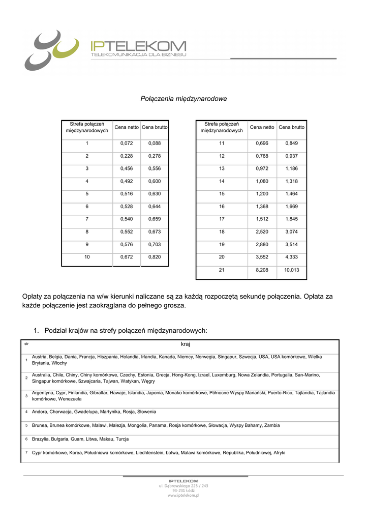 Połączenia międzynarodowe Strefa połączeń międzynarodowych Strefa połączeń międzynarodowych Cena netto Cena brutto Cena netto Cena brutto 1 0,072 0,088 11 0,696 0,849 2 0,228 0,278 12 0,768 0,937 3 0,456 0,556 13 0,972 1,186 4 0,492 0,600 14 1,080 1,318 5 0,516 0,630 15 1,200 1,464 6 0,528 0,644 16 1,368 1,669 7 0,540 0,659 17 1,512 1,845 8 0,552 0,673 18 2,520 3,074 9 0,576 0,703 19 2,880 3,514 10 0,672 0,820 20 3,552 4,333 21 8,208 10,013 Opłaty za połączenia na w/w kierunki naliczane są za każdą rozpoczętą sekundę połączenia. Opłata za każde połączenie jest zaokrąglana do pełnego grosza. 1. Podział krajów na strefy połączeń międzynarodowych: kraj str 1 Austria, Belgia, Dania, Francja, Hiszpania, Holandia, Irlandia, Kanada, Niemcy, Norwegia, Singapur, Szwecja, USA, USA komórkowe, Wielka Brytania, Włochy 2 Australia, Chile, Chiny, Chiny komórkowe, Czechy, Estonia, Grecja, Hong-Kong, Izrael, Luxemburg, Nowa Zelandia, Portugalia, San-Marino, Singapur komórkowe, Szwajcaria, Tajwan, Watykan, Węgry 3 Argentyna, Cypr, Finlandia, Gibraltar, Hawaje, Islandia, Japonia, Monako komórkowe, Północne Wyspy Mariański, Puerto-Rico, Tajlandia, Tajlandia komórkowe, Wenezuela 4 Andora, Chorwacja, Gwadelupa, Martynika, Rosja, Słowenia 5 Brunea, Brunea komórkowe, Malawi, Malezja, Mongolia, Panama, Rosja komórkowe, Słowacja, Wyspy Bahamy, Zambia 6 Brazylia, Bułgaria, Guam, Litwa, Makau, Turcja 7 Cypr komórkowe, Korea, Południowa komórkowe, Liechtenstein, Łotwa, Malawi komórkowe, Republika, Południowej, Afryki 8 Bangladesz komórkowe, Gruzja, Kolumbia, Kostaryka, Kostaryka komórkowe, Zimbabwe 9 Bangladesz, Bermudy, Bermudy komórkowe, Burundi, Gabon, Laos, Monako 10 Armenia, Benin, Benin komórkowe, Francuska Gujana, Gabon komórkowe, Indonezja, Izrael komórkowe, Jamajka, Serbia, Czarnogóra, Kuwejt, Kuwejt komórkowe, Meksyk, Namibia, Nigeria, Rumunia, Salwador, Tajwan komórkowe, Ukraina, Urugwaj, Uzbekistan, Uzbekistan komórkowe 11 Botswana, Iran, Kazachstan, Kirgistan, Kirgistan komórkowe, Kolumbia komórkowe, Liban, Malta, Togo, Trinidad & Tobago, Trinidad & Tobago komórkowe, Uganda, Uganda komórkowe 12 Albania, Aruba, Boliwia, Jordania, Macedonia, Mołdawia, Pakistan komórkowe, Ruanda, Salwador komórkowe 13 Algieria, Antigua & Barbuda, Antigua & Barbuda komórkowe, Barbados, Boliwia komórkowe, Ekwador, Guatemala, Guatemala komórkowe, Gwinea, Gwinea komórkowe, Indie komórkowe, Kazachstan komórkowe, Kongo, Mali, Mauritius, Mauritius komórkowe, Mozambik, Paragwaj, Sri-Lanka, Ukraina komórkowe, Wyspy Dziewicze, Zambia komórkowe 14 Algieria komórkowe, Antyle, Holenderskie, Antyle, Holenderskie komórkowe, Arabska Republika Jemenu komórkowe, Argentyna komórkowe, Azerbejdżan, Azerbejdżan komórkowe, Bahrain, Bahrajn komórkowe, Belize, Bośnia I Hercegowina, Czechy komórkowe, Egipt, Egipt komórkowe, Filipiny, Finlandia komórkowe, Francja komórkowe, Georgia komórkowe, Ghana, Ghana komórkowe, Grenada, Indie, Indonezja komórkowe, Iran komórkowe, Irlandia komórkowe, Japonia komórkowe, Jordania komórkowe, Kamerun, Kamerun komórkowe, Litwa komórkowe, Łotwa komórkowe, Monserat, Niemcy komórkowe, Niger, Nikaragua, Pakistan, Paragwaj komórkowe, Rwanda komórkowe, Senegal, Seszele, Seszele komórkowe, Słowacja komórkowe, Sri-Lanka komórkowe, Sudan, Sudan komórkowe, Swaziland, Tadżykistan, Tadżykistan komórkowe, Tanzania, Togo komórkowe, Turcja komórkowe, Turkmenistan, Turkmenistan komórkowe, Wietnam, Wielka Brytania komórkowe, Wybrzeże Kości Słoniowej 15 Albania komórkowe, Angola, Arabia Saudyjska, Arabska Republika Jemenu, Aruba komórkowe, Australia komórkowe, Bhutan, Białoruś, Brazylia komórkowe, Chile komórkowe, Chorwacja komórkowe, Czad, Dania komórkowe, Filipiny komórkowe, Gambia, Gambia komórkowe, Grenada komórkowe, Gujana, Francuska komórkowe, Hiszpania komórkowe, Holandia komórkowe, Irak, Serbia komórkowe, Czarnogóra komórkowe, Kajmany, Kambodża, Kambodża komórkowe, Kenia, Madagaskar, Madagaskar komórkowe, Maroko, Mołdawia komórkowe, Mozambik komórkowe, Nigeria komórkowe, Norwegia komórkowe, Oman, Polinezja Francuska, Portugalia komórkowe, Sierra-Leone, Sierra-Leone komórkowe, St-Pierre & Miquelon, Szwecja komórkowe, Tunezja, Wenezuela komórkowe, Wietnam komórkowe, Wybrzeże Kości Słoniowej komórkowe, Wyspy Faroa komórkowe 16 Angola komórkowe, Anguilla, Armenia komórkowe, Barbados komórkowe, Belize komórkowe, Białoruś komórkowe, Bułgaria komórkowe, BurkinaFaso, Dominika, Ekwador komórkowe, Emiraty, Arabskie, Emiraty, Arabskie komórkowe, Equatorial-Guinea, Estonia komórkowe, Grecja komórkowe, Haiti, Islandia komórkowe, Jamajka komórkowe, Lebanon komórkowe, Lesotho, Lesotho komórkowe, Liban komórkowe, Libia, Libia komórkowe, Luksemburg komórkowe, Malediwy, Mauretania, Nikaragua komórkowe, Nowa Zelandia komórkowe, Republika, Południowej, Afryki komórkowe, Rumunia komórkowe, Senegal komórkowe, St-Kitts, St-Lucia, St-Lucia komórkowe, St-Vincent & Grenadines, St-Vincent & Grenadines komórkowe, Surinam, Surinam komórkowe, Tanzania komórkowe, Tonga, Tunezja komórkowe, Turks & Caicos, Urugwaj komórkowe, Węgry komórkowe 17 Afganistan, Afganistan komórkowe, Andora komórkowe, Belgia komórkowe, Bośnia i Hercegowina komórkowe, Botswana komórkowe, Cape-Verde, Cape-Verde komórkowe, Gibraltar komórkowe, Gujana, Gujana komórkowe, Haiti komórkowe, Irak komórkowe, Izrael - Palestyna, Izrael - Palestyna komórkowe, Katar, Katar komórkowe, Kenia komórkowe, Liberia, Liberia komórkowe, Macedonia komórkowe, Maroko komórkowe, Mikronesia, Palestyna, Peru komórkowe, Syria komórkowe, Włochy komórkowe, Zimbabwe komórkowe 18 Arabia Saudyjska komórkowe, Austria komórkowe, Burkina-Faso komórkowe, Comores, Eritrea, Etiopia, Fidżi, Honduras, Honduras komórkowe, Martynika komórkowe, Myanmar, Nepal komórkowe, Nowa Kaledonia, Republika Demokratyczn