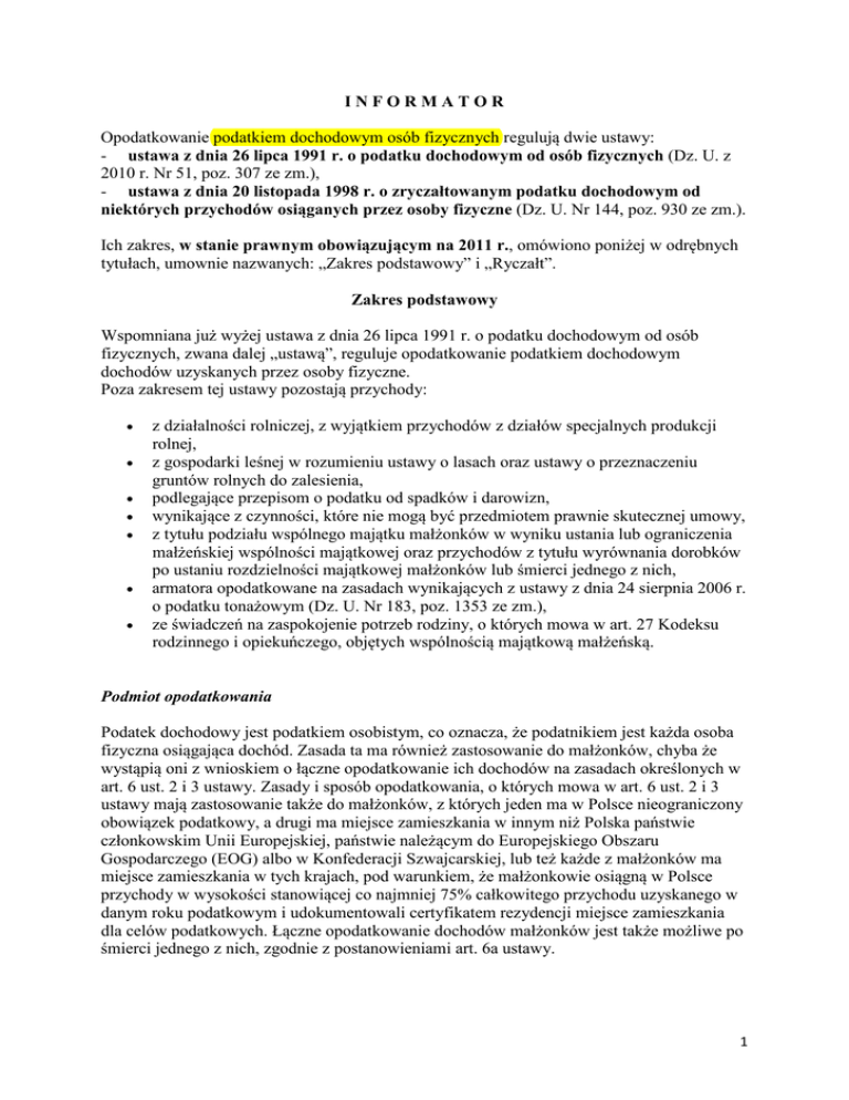 INFORMATOR Opodatkowanie podatkiem dochodowym