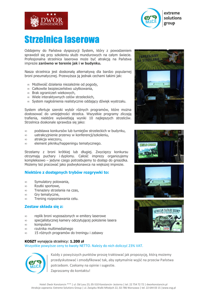 Strzelnica laserowa Oddajemy do Państwa dyspozycji System, który z powodzeniem sprawdził się przy szkoleniu służb mundurowych na całym świecie. Profesjonalna strzelnica laserowa może być atrakcją na Państwa imprezie zarówno w terenie jak i w budynku. Nasza strzelnica jest doskonałą alternatywą dla bardzo popularnej broni pneumatycznej. Przewyższa ją jednak cechami takimi jak: • • • • • Możliwość działania niezależnie od pogody, Całkowite bezpieczeństwo użytkowania, Brak ograniczeń wiekowych, Wiele interaktywnych celów strzeleckich, System nagłośnienia realistycznie oddający dźwięk wystrzału. System ofertuje szeroki wybór różnych programów, które można dostosować do umiejętności strzelca. Wszystkie programy zliczają trafienia, niektóre wyświetlają wyniki 10 najlepszych strzelców. Strzelnica doskonale sprawdza się jako: • • • • podstawa konkursów lub turniejów strzeleckich w budynku, uatrakcyjnienie przerwy w konferencji/szkoleniu, atrakcja wieczoru, element pikniku/happeningu tematycznego. Strzelamy z broni krótkiej lub długiej. Zwycięzcy konkursu otrzymają puchary i dyplomy. Całość imprezy organizujemy kompleksowo – jedyne czego potrzebujemy to dostęp do gniazdka. Możemy też pracować jako podwykonawca na większej imprezie. Niektóre z dostępnych trybów rozgrywki to: • • • • • Symulatory polowania, Rzutki sportowe, Trenażery strzelania na czas, Gry tematyczne, Trening rozpoznawania celu. Zestaw składa się z: • • • • • replik broni wyposażonych w emitery laserowe specjalistycznej kamery odczytującej położenie lasera komputera rzutnika multimedialnego 15 różnych programów do treningu i zabawy KOSZT wynajęcia strzelnicy: 1.200 zł Wszystkie powyższe ceny to kwoty NETTO. Należy do nich doliczyć 23% VAT. Każdy z powyższych punktów proszę traktować jak propozycję, którą możemy przedyskutować i zmodyfikować tak, aby optymalnie wyjść na przeciw Państwa potrzebom. Czekamy na opinie i sugestie. Zapraszamy do kontaktu! Hotel: Dwór Konstancin *** | ul. Od Lasu 23, 05-510 Konstancin- Jeziorna | tel. 22 754 72 72 | dworkonstancin.pl Atrakcje zapewnia: Extreme Solutions Group | ul. Związku Walki Młodych 22, 02-786 Warszawa | tel. 22 644 03 15 |www.esg.pl
