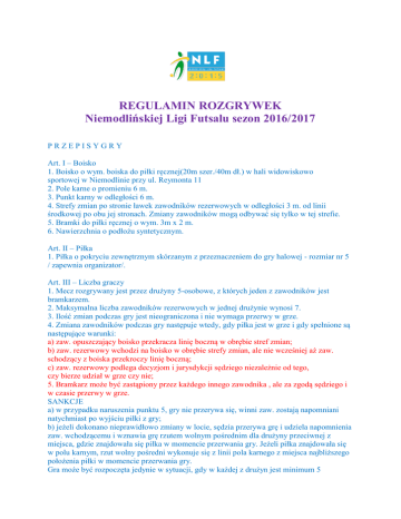 REGULAMIN ROZGRYWEK Niemodlińskiej Ligi Futsalu sezon 2016/2017 PRZEPISYGRY Art. I – Boisko 1. Boisko o wym. boiska do piłki ręcznej(20m szer./40m dł.) w hali widowiskowo sportowej w Niemodlinie przy ul. Reymonta 11 2. Pole karne o promieniu 6 m. 3. Punkt karny w odległości 6 m. 4. Strefy zmian po stronie ławek zawodników rezerwowych w odległości 3 m. od linii środkowej po obu jej stronach. Zmiany zawodników mogą odbywać się tylko w tej strefie. 5. Bramki do piłki ręcznej o wym. 3m x 2 m. 6. Nawierzchnia o podłożu syntetycznym. Art. II – Piłka 1. Piłka o pokryciu zewnętrznym skórzanym z przeznaczeniem do gry halowej - rozmiar nr 5 / zapewnia organizator/. Art. III – Liczba graczy 1. Mecz rozgrywany jest przez drużyny 5-osobowe, z których jeden z zawodników jest bramkarzem. 2. Maksymalna liczba zawodników rezerwowych w jednej drużynie wynosi 7. 3. Ilość zmian podczas gry jest nieograniczona i nie wymaga przerwy w grze. 4. Zmiana zawodników podczas gry następuje wtedy, gdy piłka jest w grze i gdy spełnione są następujące warunki: a) zaw. opuszczający boisko przekracza linię boczną w obrębie stref zmian; b) zaw. rezerwowy wchodzi na boisko w obrębie strefy zmian, ale nie wcześniej aż zaw. schodzący z boiska przekroczy linię boczną; c) zaw. rezerwowy podlega decyzjom i jurysdykcji sędziego niezależnie od tego, czy bierze udział w grze czy nie; 5. Bramkarz może być zastąpiony przez każdego innego zawodnika , ale za zgodą sędziego i w czasie przerwy w grze. SANKCJE a) w przypadku naruszenia punktu 5, gry nie przerywa się, winni zaw. zostają napomniani natychmiast po wyjściu piłki z gry; b) jeżeli dokonano nieprawidłowo zmiany w locie, sędzia przerywa grę i udziela napomnienia zaw. wchodzącemu i wznawia grę rzutem wolnym pośrednim dla drużyny przeciwnej z miejsca, gdzie znajdowała się piłka w momencie przerwania gry. Jeżeli piłka znajdowała się w polu karnym, rzut wolny pośredni wykonuje się z linii pola karnego z miejsca najbliższego położenia piłki w momencie przerwania gry. Gra może być rozpoczęta jedynie w sytuacji, gdy w każdej z drużyn jest minimum 5 zawodników. W sytuacji, gdy z powodu wykluczeń w jednym z zespołów zostanie mniej niż 2 zawodników, mecz należy zakończyć. Art. IV – Ubiór zawodników Ubiór zawodników składa się z koszulki z widocznym numerem, spodenek, skarpet ochraniaczy i obuwia halowego o spodach koloru jasnego. Obuwie obowiązkowe. Bramkarz powinien nosić długie spodnie i koszulkę różniącą się kolorem od ubiorów sędziów i innych zawodników. W przypadku naruszenia powyższych przepisów zawodnik zostanie usunięty z boiska w celu dostosowania ubioru do wymogów przepisów. Może on wejść na boisko dopiero w trakcie przerwy w grze po uprzednim zgłoszeniu się do sędziego, który sprawdzi prawidłowość ubioru. Art. V – Sędzia Do prowadzenia zawodów wyznacza się sędziego głównego i (ewentualnie) sędziego pomocniczego na boisku oraz sędziego czasowego przy stoliku. Art. VI – Czas gry 1. Czas gry składa się z dwóch równych części po 20 minut. 2. Czas będzie zatrzymywany tylko na polecenie sędziów boiskowych. 3. Każda połowa meczu będzie przedłużona o czas potrzebny na wykonanie ewentualnego rzutu karnego. 4. Drużyny mają prawo do jednominutowej przerwy w każdej połowie meczu, co należy zgłosić sędziemu czasowemu. Przerwa może być udzielona tylko wówczas, gdy piłka nie jest w grze. 5. Jeżeli drużyna nie bierze przysługującej przerwy nie jest to kompensowane w drugiej połowie. 6. Czas przerwy między połowami wynosi 1 minutę. Art. VII – Piłka w grze i poza grą Zgodnie z przepisami Komisji ds. Piłki Nożnej Pięcioosobowej PZPN. Jeżeli piłka uderzy w konstrukcję nad polem gry, grę wznawia się rzutem z autu najbliżej miejsca, gdzie uderzyła piłka. Rozpoczęcie gry: piłka musi zostać zagrana. Zawodnicy drużyny przeciwnej zachowują odległość 5 metrów. Art. VIII – Gra niedozwolona i niesportowe zachowanie Zawodnik, który rozmyślnie popełni jedno z niżej wymienionych przewinień, zostanie ukarany przyznaniem drużynie przeciwnej rzutu wolnego bezpośredniego z miejsca przewinienia: a) kopnie lub będzie usiłował kopnąć przeciwnika; b) podstawi nogę przeciwnikowi, tzn. przewróci go lub będzie usiłował przewrócić przeciwnika przy użyciu nóg bądź poprzez zatrzymanie się przed nim lub za nim; c) skoczy na przeciwnika; d) zaatakuje przeciwnika w sposób gwałtowny lub niebezpieczny; e) zaatakuje przeciwnika od tyłu; f) uderzy lub będzie usiłował uderzyć przeciwnika albo splunie na niego; g) zatrzyma przeciwnika; k) dotknie piłki ręką, tzn. będzie ją niósł, uderzy ją lub popchnie ramieniem lub ręką (nie dotyczy to bramkarza we własnym polu karnym). W przypadku, gdy zawodnik zespołu broniącego, rozmyślnie dopuści się jednego z powyższych przewinień w obrębie własnego pola karnego, zespół jego zostanie ukarany rzutem karnym bez względu na położenie piłki, pod warunkiem, że była ona w grze. Zawodnik popełniający jedno z niżej wymienionych wykroczeń zostanie ukarany przyznaniem rzutu wolnego pośredniego dla drużyny przeciwnej z miejsca przewinienia, a jeżeli przewinienie popełniono w polu karnym, z linii pola karnego z miejsca najbliższego miejsca przewinienia: a) zagrywa zdaniem sędziego, w sposób niebezpieczny, np. usiłuje kopnąć piłkę trzymaną przez bramkarza; b) rozmyślnie przeszkadza przeciwnikowi bez zamiaru zagrania piłki, tzn. przebiega między piłką a przeciwnikiem lub utrudnia mu dostęp do piłki manewrami tułowia; c) atakuje bramkarza, z wyjątkiem przypadku, gdy wyjdzie on poza pole karne; W przypadku, gdy grając jako bramkarz: d) dotyka lub prowadzi piłkę rękami, jeżeli została ona zagrana przez zawodnika własnej drużyny (także z autu); e) dotyka lub prowadzi piłkę rękami lub nogami w jakimkolwiek punkci