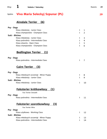 Ring: 1 Sędzia: Viva Maria Soleckyj Szpunar (PL) Razem: Sobota / Saturday Airedale Terrier 29 (6) Psy - Dogs Klasa młodzieży - Junior Class Klasa championów - Champion Class 1 1 1 2 1 1 1 1 3 4 5 6 1 7 1 1 8 9 1 10 1 11 1 12 1 1 13 14 Suki - Bitches Klasa młodzieży - Junior Class Klasa pośrednia - Intermediate Class Klasa otwarta - Open Class Klasa championów - Champion Class Bedlington Terrier (1) Psy - Dogs Klasa pośrednia - Intermediate Class Cairn Terrier (3) Psy - Dogs Klasa młodszych szczeniąt - Minor Puppy Klasa młodzieży - Junior Class Suki - Bitches Klasa młodzieży - Junior Class Foksterier krótkowłosy (1) Fox Terrier Smooth Psy - Dogs Klasa pośrednia - Intermediate Class Foksterier szorstkowłosy (3) Fox Terrier Wire Psy - Dogs Klasa użytkowa - Working Class Suki - Bitches Klasa młodszych szczeniąt - Minor Puppy Klasa pośrednia - Intermediate Class 29 Jack Russell Terrier (5) Psy - Dogs Klasa młodzieży - Junior Class 1 15 1 1 2 16 17 18 - 19 1 20 1 21 1 22 1 23 1 24 1 25 1 26 3 27 - 29 Suki - Bitches Klasa młodszych szczeniąt - Minor Puppy Klasa młodzieży - Junior Class Klasa otwarta - Open Class Lakeland Terrier (1) Suki - Bitches Klasa weteranów - Veteran Class Niemiecki terier myśliwski (1) Deutscher Jagdterrier / German Hunting Terrier Psy - Dogs Klasa młodzieży - Junior Class Parson Russell Terrier (1) Psy - Dogs Klasa pośrednia - Intermediate Class Terier szkocki (2) Scottish Terrier Psy - Dogs Klasa młodzieży - Junior Class Suki - Bitches Klasa młodzieży - Junior Class Terier walijski (1) Welsh Terrier Suki - Bitches Klasa pośrednia - Intermediate Class West Highland White Terrier (4) Psy - Dogs Klasa młodzieży - Junior Class Suki - Bitches Klasa młodzieży - Junior Class Ring: 2 Sędzia: Andrzej Brabletz (PL) Razem: Sobota / Saturday Jamnik długowłosy króliczy 65 (2) Kaninchen-Dachshund Langhaar / Rabbit Dachshund Long-haired Psy - Dogs Klasa szczeniąt - Puppy Class 1 30 1 31 1 32 2 1 33 - 34 35 1 1 1 36 37 38 1 1 39 40 2 41 - 42 1 43 1 44 Suki - Bitches Klasa użytkowa - Working Class Jamnik długowłosy miniaturowy (1) Zwerg-Dachshund Langhaar / Miniature Dachshund Long-haired Psy - Dogs Klasa championów - Champion Class Jamnik krótkowłosy króliczy (3) Kaninchen Dachshund Kurzhaar / Rabbit Dachshund Smooth-haired Suki - Bitches Klasa młodzieży - Junior Class Klasa otwarta - Open Class Jamnik krótkowłosy miniaturowy (3) Zwerg-Dachshund Kurzhaar / Miniature Dachshund Smooth-haired Suki - Bitches Klasa młodszych szczeniąt - Minor Puppy Klasa użytkowa - Working Class Klasa championów - Champion Class Jamnik krótkowłosy standardowy (4) Dachshund Kurzhaar / Standard Dachshund Smooth-haired Psy - Dogs Klasa otwarta - Open Class Klasa weteranów - Veteran Class Suki - Bitches Klasa championów - Champion Class Jamnik szorstkowłosy miniaturowy (2) Zwerg-Dachshund Rauhhaar / Miniature Dachshund Wire-haired Psy - Dogs Klasa pośrednia - Intermediate Class Suki - Bitches Klasa pośrednia - Intermediate Class 65 Jamnik szorstkowłosy standardowy (6) Dachshund Rauhhaar / Standard Dachshund Wire-haire Psy - Dogs Klasa młodzieży - Junior Class Klasa otwarta - Open Class Klasa użytkowa - Working Class 2 1 1 45 - 46 47 48 1 1 49 50 1 3 1 6 1 1 59 60 - 62 63 64 - 69 70 71 1 1 3 6 6 1 72 73 74 - 76 77 - 82 83 - 88 89 1 4 2 1 92 93 - 96 97 - 98 99 2 1 1 1 100 - 101 102 103 104 Suki - Bitches Klasa otwarta - Open Class Klasa użytkowa - Working Class Gończy polski (31) Gonczy polski / Polish Hunting Dog Psy - Dogs Klasa młodzieży - Junior Class Klasa pośrednia - Intermediate Class Klasa otwarta - Open Class Klasa użytkowa - Working Class Klasa championów - Champion Class Klasa weteranów - Veteran Class Suki - Bitches Klasa młodszych szczeniąt - Minor Puppy Klasa szczeniąt - Puppy Class Klasa młodzieży - Junior Class Klasa pośrednia - Intermediate Class Klasa otwarta - Open Class Klasa użytkowa - Working Class Ogar polski (13) Ogar polski / Polish Hound Psy - Dogs Klasa młodszych szczeniąt - Minor Puppy Klasa młodzieży - Junior Class Klasa użytkowa - Working Class Klasa championów - Champion Class Suki - Bitches Klasa szczeniąt - Puppy Class Klasa pośrednia - Intermediate Class Klasa użytkowa - Working Class Klasa championów - Champion Class Ring: 3 Sędzia: Izabella Krasowska-Salamon (PL) Razem: Sobota / Saturday Karelski pies na niedźwiedzie 24 (1) Karjalankarhukoira / Karelian Bear Dog Psy - Dogs Klasa młodzieży - Junior Class Łajka zachodniosyberyjska 1 51 1 52 1 53 1 54 1 55 2 1 56 - 57 58 1 90 1 91 (1) Zapadno-Sibirskaia Laika / West Siberian Laika Psy - Dogs Klasa otwarta - Open Class Norsk Lundehund (1) Norwegian Lundehund Psy - Dogs Klasa młodzieży - Junior Class Basset Hound (1) Suki - Bitches Klasa młodzieży - Junior Class Beagle (4) Psy - Dogs Klasa szczeniąt - Puppy Class Suki - Bitches Klasa młodzieży - Junior Class Klasa pośrednia - Intermediate Class Grand Basset griffon vendéen (1) Grand Basset Griffon Vendeen Suki - Bitches Klasa młodszych szczeniąt - Minor Puppy Mały gończy gaskoński (1) Petit bleu de Gascogne / Small Blue Gascony Hound Suki - Bitches Klasa pośrednia - Intermediate Class 24 Petit Basset griffon vendéen (2) Psy - Dogs Klasa otwarta - Open Class 1 105 1 106 1 107 1 1 1 1 1 108 109 110 111 112 1 3 113 114 - 116 1 117 1 118 Suki - Bitches Klasa otwarta - Open Class Porcelaine (1) Suki - Bitches Klasa młodzieży - Junior Class Posokowiec bawarski (9) Bayerischer Gebirgsschweisshund / Bavarian Mountain Scenthound Psy - Dogs Klasa młodszych szczeniąt - Minor Puppy Klasa pośrednia - Intermediate Class Klasa otwarta - Open Class Klasa użytkowa - Working Class Klasa championów - Champion Class Suki - Bitches Klasa młodzieży - Junior Class Klasa pośrednia - Intermediate Class Posokowiec hanowerski (1) Hannover'scher Schweisshund / Hanoverian Scenthound Psy - Dogs Klasa użytkowa - Working Class Rhodesian Ridgeback (1) Psy - Dogs Klasa pośrednia - Inte