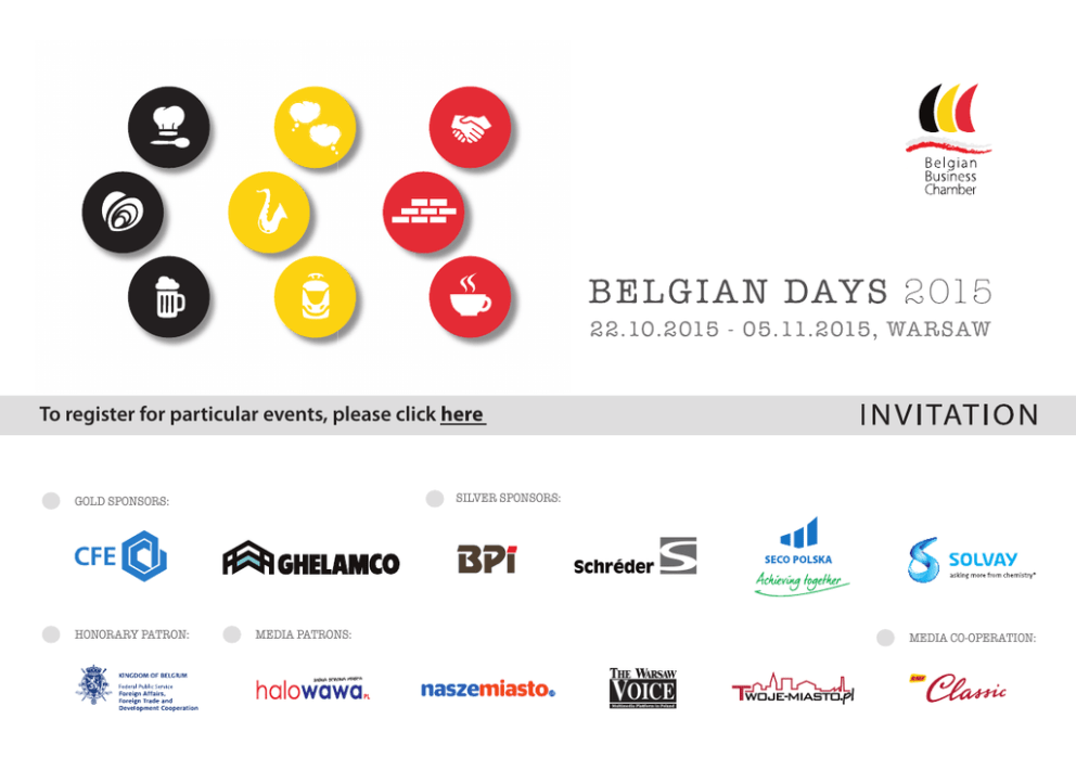 To register for particular events, please click here SILVER SPONSORS: GOLD SPONSORS: HONORARY PATRON: MEDIA PATRONS: MEDIA CO-OPERATION: Belgian Tram Ride Date: 22-23.10.2015 • Venue: Warsaw • Entry: Free of charge To introduce the delights of Belgian means of transport to Warsaw inhabitants, a special tram will be travelling around the streets of the capital. Passengers on board the tram will have the pleasure to taste some delicious Belgian chocolate and enjoy the soothing sounds of a saxophone. Przejażdżka Belgijskim Tramwajem Data: 22-23.10.2015 • Miejsce: Warszawa • Wstęp: Bezpłatny Chcąc nieco przybliżyć mieszkańcom Warszawy uroki belgijskich podróży, ulicami stolicy przejedzie specjalny tramwaj. Pasażerowie będą mogli skosztować belgijskiej czekolady i wsłuchać się w brzmienie saksofonu. 22.10.2015, Route/Trasa: Banacha - Grójecka - Filtrowa - Marszałkowska - Gen. Andersa - Słowackiego - Metro Marymont - Ks. Popiełuszki - Okopowa - Zajezdnia Wola 23.10.2015, Route/Trasa: Banacha - Grójecka - Filtrowa - Nowowiejska - Marszałkowska - Gen. Andersa - Dworzec Gdański - Most Gdański ul. Jagiellońska - Ratuszowa ZOO - ul. Jagiellońska - Most Gdański - Gen. Andersa - Marszałkowska - Puławska - Metro Wilanowska SPONSOR IN-KIND: MEDIA PATRONS: Make a Smurfy Pillow Date: 24.10.2015, 01.00 pm-06.30 pm • Venue: Warsaw, Rewers Restaurant, BUW building, ul. Dobra 56/66 • Entry: Free of charge “Make a Smurfy Pillow” is a charity initiative during which the participants themselves, using sewing machines and under the watchful eye of the organisers, will be able to make pillowcases with the motif of the famous Belgian cartoon characters “The Smurfs”. All pillowcases will be donated to the Pediatric Hospital of the Medical University of Warsaw. Uszyj Smerfnego Jasia Data: 24.10.2015, 13:00-18:30 • Miejsce: Warszawa, Restauracja Rewers, budynek BUW, ul. Dobra 56/66 • Wstęp: Bezpłatny „Uszyj Smerfnego Jasia” to charytatywna inicjatywa, podczas której uczestnicy za pomocą maszyn krawieckich i pod czujnym okiem organizatorów będą mogli sami uszyć poszewki na poduszki z motywem słynnych belgijskich „Smerfów”. Wszystkie poszewki zostaną przekazane do Szpitala Pediatrycznego Warszawskiego Uniwersytetu Medycznego. PARTNERS: MEDIA PATRONS: CMYK M100 Y90 C80 M30 M46 Y94 C60 Y100 C34 M96 C98 M94 M8 Y100 Comic Books-Belgian History Date: 24.10.2015, 01.30 pm • Venue: Warsaw, Rewers Restaurant, BUW building, ul. Dobra 56/66 • Entry: Free of charge If you would like to know more about the rich history of Belgian comics, we cordially invite you to a meeting with the Delegate of the Wallonia-Brussels in Warsaw, Franck Pezza, who will present the impact and importance of the picture stories which have become cult objects in Belgium. Komiksy-Belgijska Historia Data: 24.10.2015, 13:30 • Miejsce: Warszawa, Restauracja Rewers, budynek BUW, ul. Dobra 56/66 • Wstęp: Bezpłatny Aby poznać bogatą historię belgijskiego komiksu, serdecznie zapraszamy na spotkanie z Delegatem Walonii-Brukseli w Warszawie, Franckiem Pezzą, który przybliży wpływ i znaczenie historyjek obrazkowych będących przedmiotem kultu w Belgii. PARTNERS: MEDIA PATRONS: Comic Books Workshop Date: 24.10.2015, 01.30 pm • Venue: Warsaw, Rewers Restaurant, BUW building, ul. Dobra 56/66 • Entry: Free of charge As part of the “Comic Books-Belgian History” meeting, there will also be a comic book workshop where the participants will get the chance to test their drawing skills and learn how to make their first real comic. Authors of the best drawings will be awarded with prizes. Workshop will be complemented by a exhibition of works that were part of the „Belgian Comic Books Heroes in Warsaw” art contest, in the frame of the Belgian Days 2014. Warsztaty Komiksu Data: 24.10.2015, 13:30 • Miejsce: Warszawa, Restauracja Rewers, budynek BUW, ul. Dobra 56/66 • Wstęp: Bezpłatny W ramach spotkania “Komiksy-Belgijska Historia” odbędą się także warsztaty, których uczestnicy będą mogli sprawdzić swoje umiejętności rysunkowe jak również dowiedzieć się, jak stworzyć swój pierwszy prawdziwy komiks. Podczas warsztatów wręczone zostaną nagrody dla autorów najlepszych rysunków. Warsztatom będzie towarzyszyć wystawa prac, które brały udział w konkursie „Bohaterowie Belgijskich Komiksów w Warszawie”, w ramach Dni Belgijskich 2014. PARTNERS: MEDIA PATRONS: Live Molecular Cooking with Jean Bos Date: 24.10.2015, 03.00 pm •Venue: Warsaw, Rewers Restaurant, BUW building, ul. Dobra 56/66 • Entry: Free of charge We would like to cordially invite all food connoisseurs and admirers of performances demonstrating incredible skill to a live molecular cooking presentation by world-renowned chef Jean Bos. The Belgian culinary master will captivate all the guests present with the unique flavours and original forms of the prepared dishes, which will include a range of meat and fish dishes, soups and desserts. Pokaz Kuchni Molekularnej Jeana Bosa Data: 24.10.2015, 15:00 • Miejsce: Warszawa, Restauracja Rewers, budynek BUW, ul. Dobra 56/66 • Wstęp: Bezpłatny Wszystkich koneserów smaku i wielbicieli efektownych popisów umiejętności serdecznie zapraszamy na pokaz kuchni molekularnej światowej sławy Szefa Kuchni Jean’a Bosa. Belgijski mistrz sztuki kulinarnej uwiedzie gości niepowtarzalnymi smakami i oryginalnymi formami przygotowania wielu dań mięsnych, rybnych, zup a także deserów. PARTNERS: MEDIA PATRONS: Meeting with Marek Orzechowski Date: 24.10.2015, 05.00 pm • Venue: Warsaw, Rewers Restaurant, BUW building, ul. Dobra 56/66 • Entry: Free of charge If you would like to know more about how everyday life in Belgium looks and what the differences are between Poland and Belgium, we cordially invite you to a meeting with Marek Orzechowski, a well-known Polish author and journalist who has been living in Brussels for many years. The disc